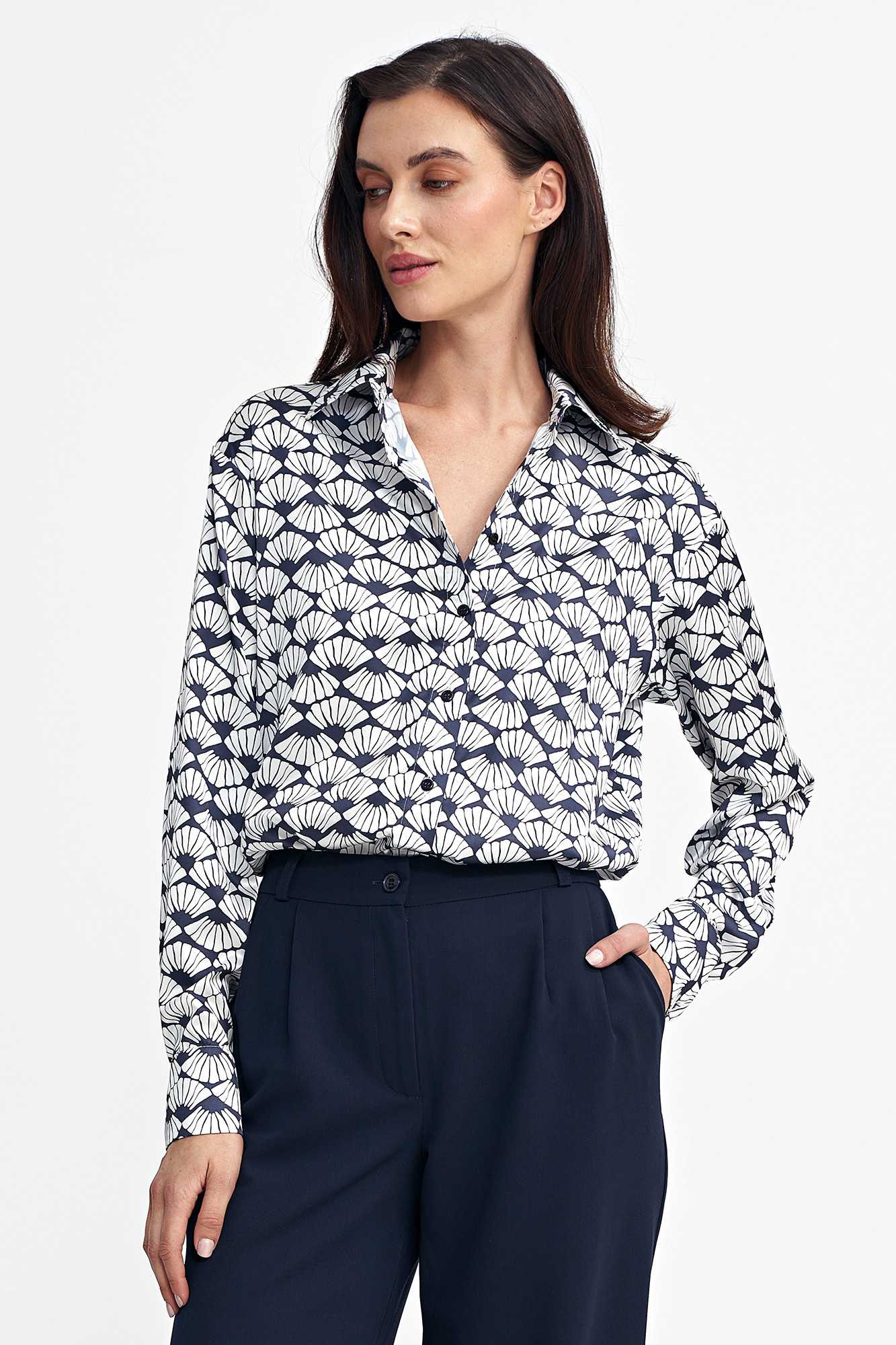 Coupe classique. Tissu effet satiné à motif marine et blanc unique. Col classique. Manches longues avec poignets. Fermeture boutonnée sur le devant et pressions à l'entrejambe. Matière extensible intégrée à la culotte. Composition : 95 % polyester, 5 % élasthanne. Le mannequin mesure 1,76 m et porte une taille 36.