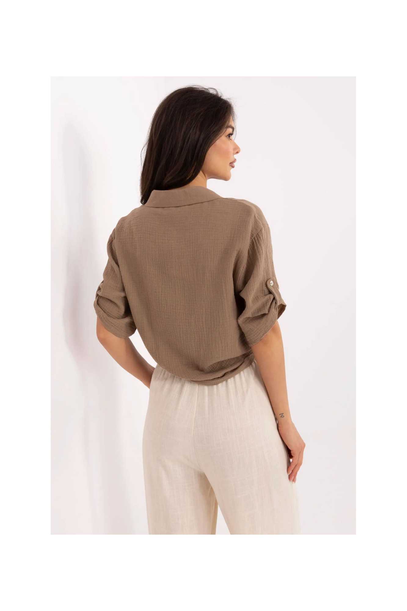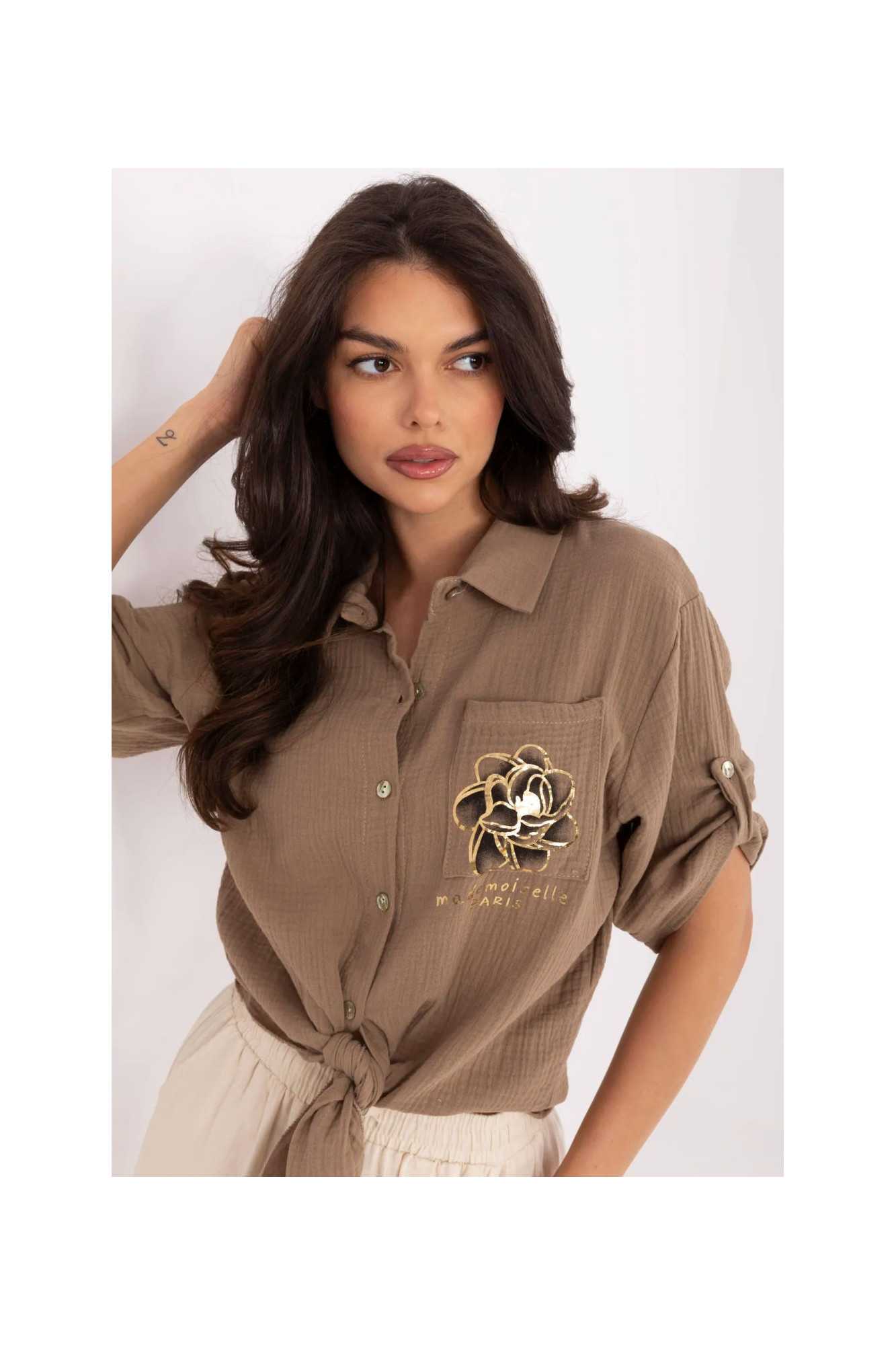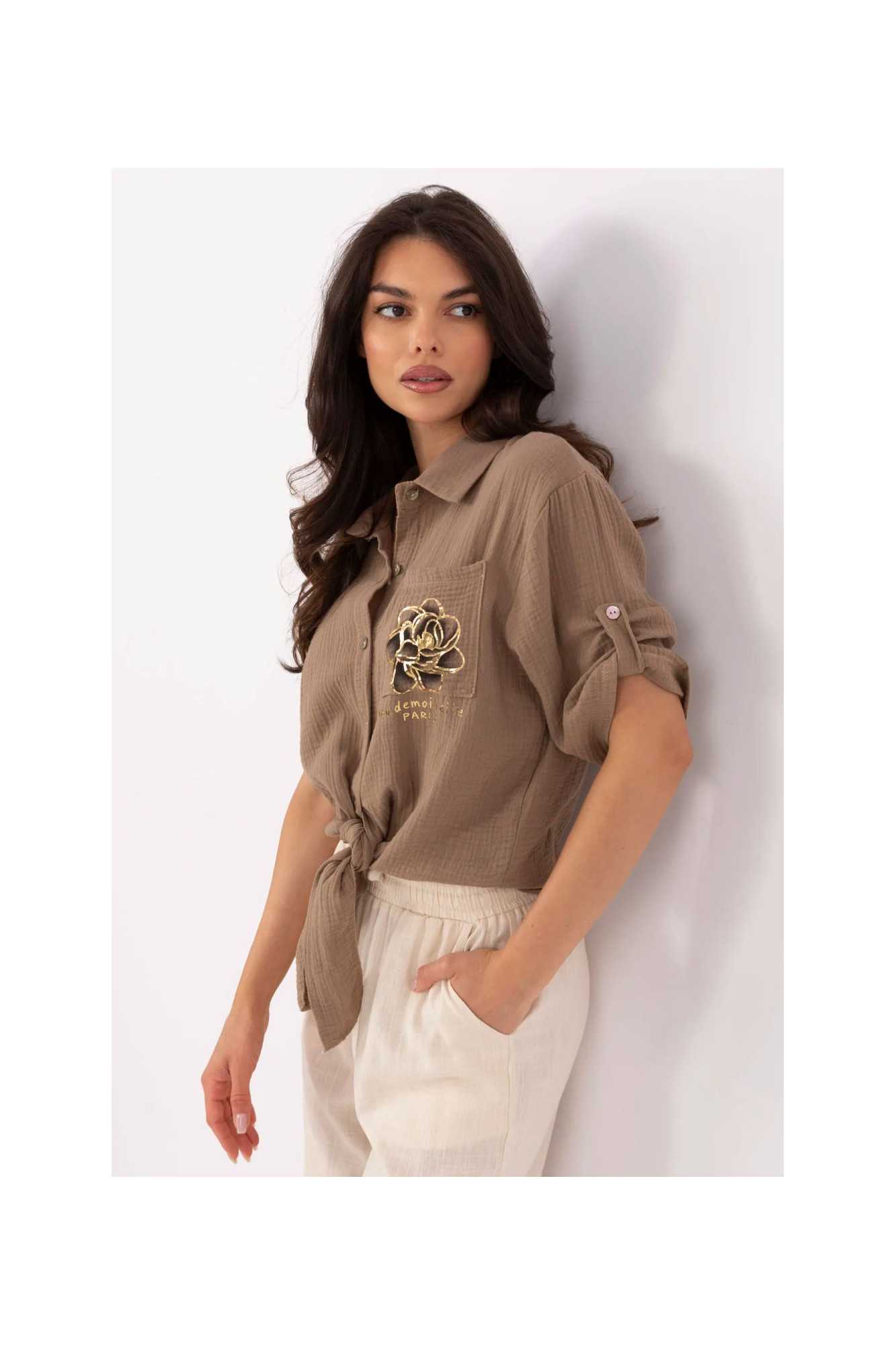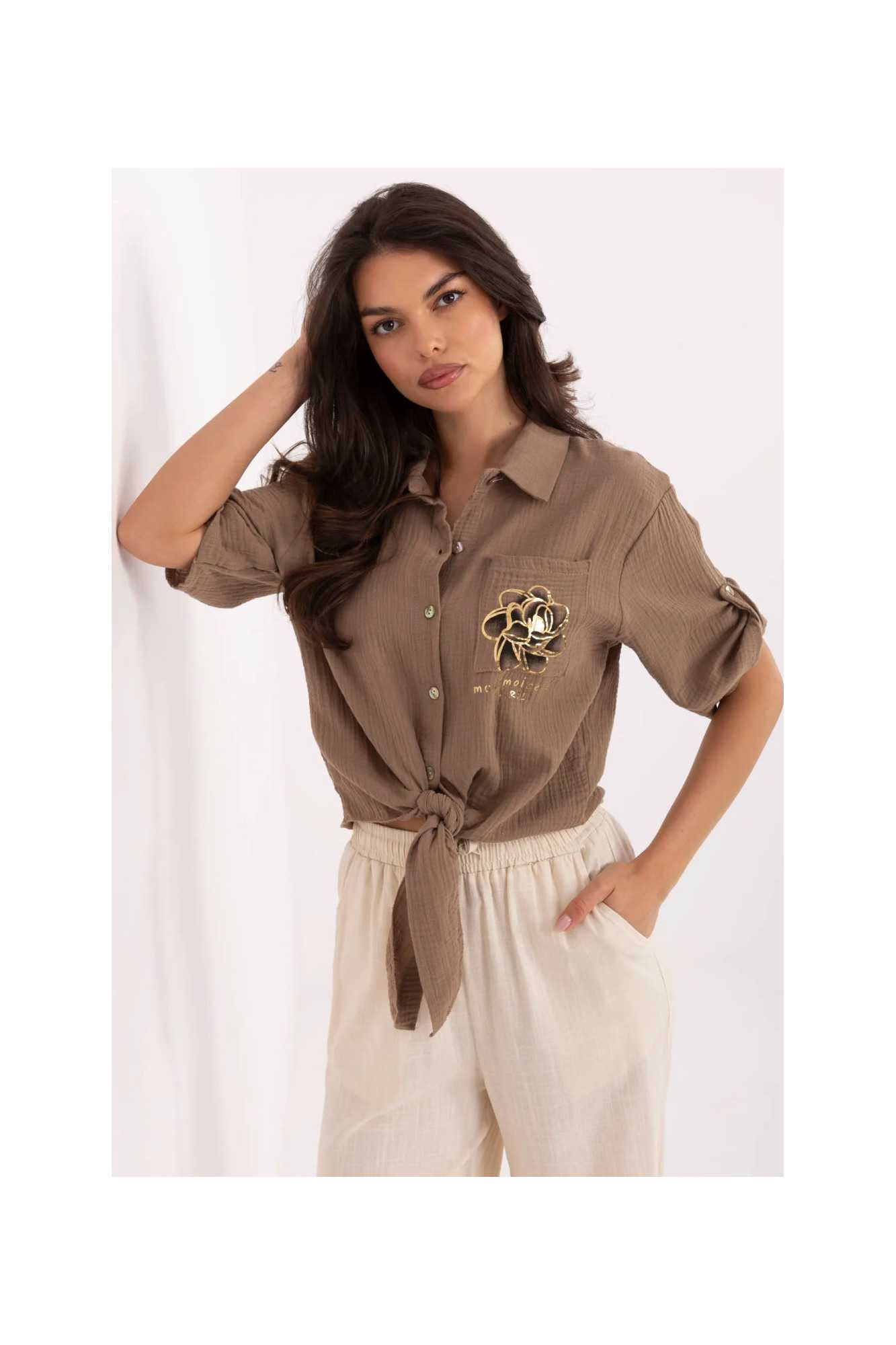 Chemise féminine élégante dans un style décontracté, idéale pour tous les jours. Fabriquée en coton naturel et aéré, elle assure un confort toute la journée. Sa longueur courte et son nœud en bas lui donnent légèreté et caractère féminin, et ses manches 3/4 sont parfaites pour les journées plus chaudes. La chemise se ferme avec des boutons et est équipée d'un col classique, ce qui lui confère un aspect universel et décontracté. Une poche pratique décorée d'une impression subtile se trouve à la hauteur de la poitrine, ajoutant une touche délicate et à la mode.