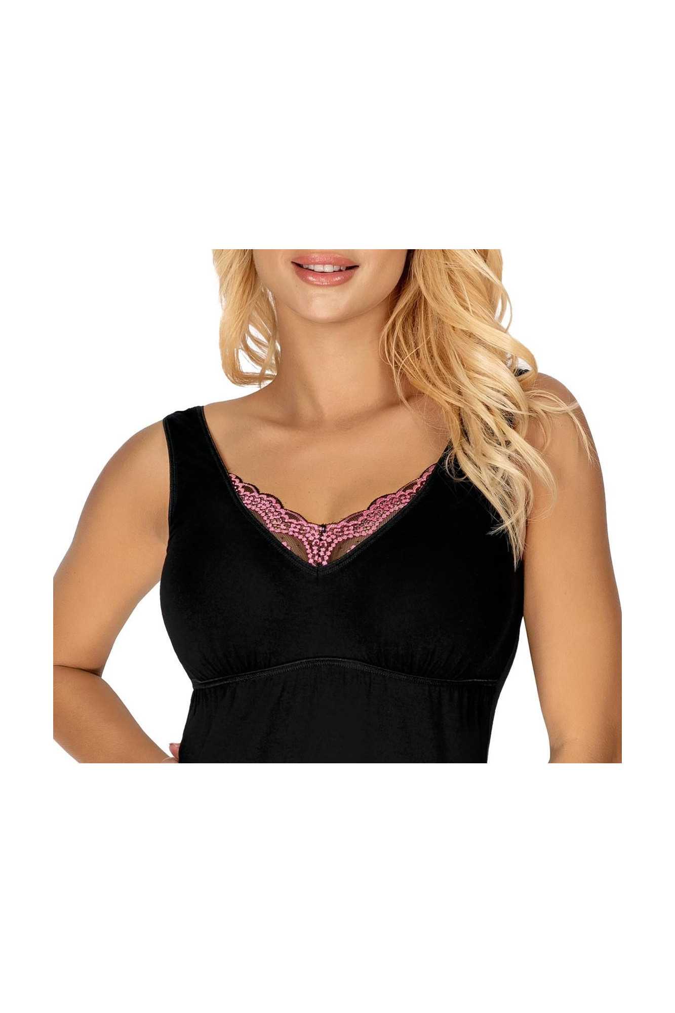 Une nuisette sans bretelles incroyablement confortable dans un noir intemporel. Une coupe qui met en valeur les caractéristiques du corps. L'encolure est terminée par de la dentelle rose transparente, des surpiqûres appropriées sous la poitrine. Cuisses également avec finition en dentelle. Il s'agit d'une proposition idéale et intemporelle, dans laquelle vous vous reposerez parfaitement et serez belle. Haute qualité.