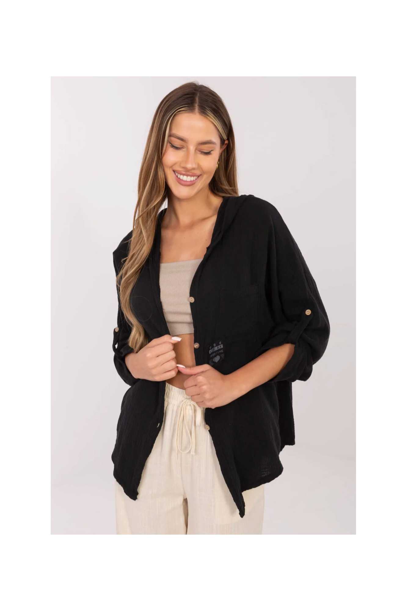 Chemise décontractée en mousseline de coton pour femme est un choix idéal pour les tenues quotidiennes. Le tissu léger, aéré et doux au toucher assure le confort toute la journée, même par temps plus chaud. La texture lisse du matériau et la coupe classique font de la chemise un vêtement polyvalent et facile à styliser. Modèle de longueur standard, boutonné, avec une capuche pratique qui ajoute un caractère sportif et décontracté. Les manches avec possibilité de retrousser permettent d'ajuster la longueur en fonction de la météo et du style. Des détails supplémentaires tels que des patchs et une poche à la hauteur de la poitrine donnent à la chemise un aspect original et un léger accent streetwear. Une excellente proposition au quotidien avec des jeans, des shorts ou des leggings. Idéal pour les femmes qui apprécient le confort et le style en un seul.