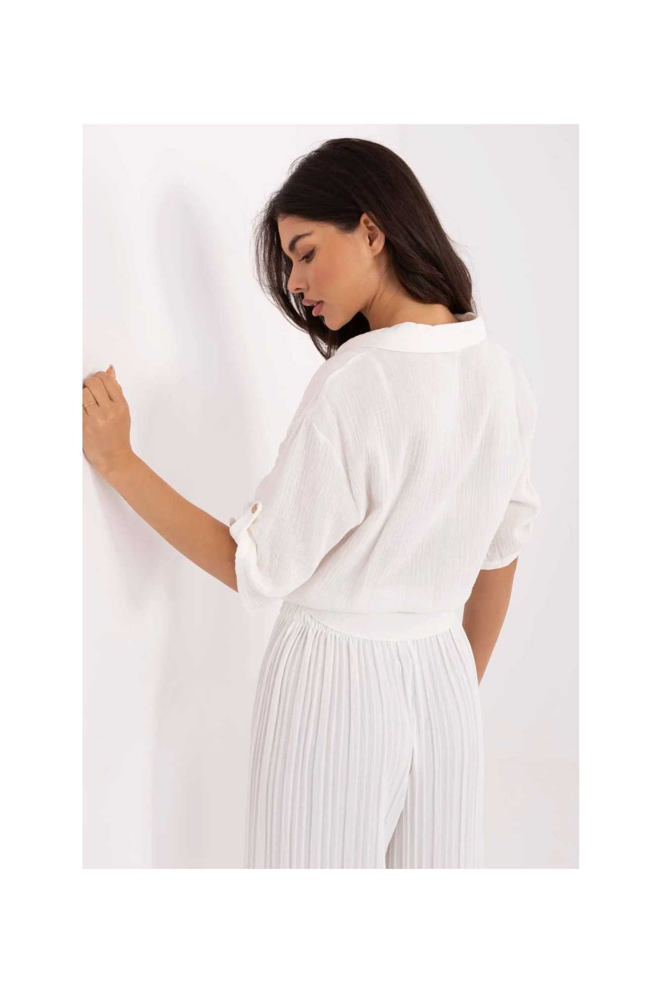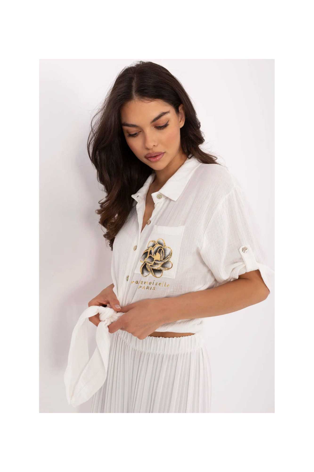 Élégante chemise pour femme dans un style décontracté, idéale pour tous les jours. Fabriquée en coton naturel et respirant, elle assure un confort toute la journée. Sa longueur courte et son nœud en bas lui donnent légèreté et caractère féminin, tandis que les manches 3/4 sont parfaites pour les journées plus chaudes. La chemise se ferme avec des boutons et est équipée d'un col classique, lui donnant un look universel et décontracté. Une poche pratique décorée d'une impression subtile se trouve au niveau de la poitrine, ajoutant une touche délicate et à la mode.