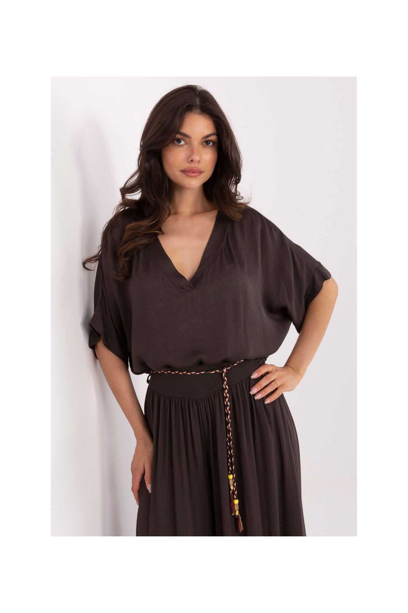 Le chemisier quotidien de style décontracté est une proposition universelle pour de nombreuses tenues. Fabriqué en viscose douce et aérée, il assure un confort toute la journée. Le tissu lisse lui confère un caractère classique et intemporel, parfait pour le travail, une promenade ou une rencontre entre amis. Ce modèle de longueur standard, avec des manches 3/4 et un décolleté en V, qui souligne subtilement la ligne du cou. Simple et élégant, il se marie parfaitement avec un jean ou une jupe.
