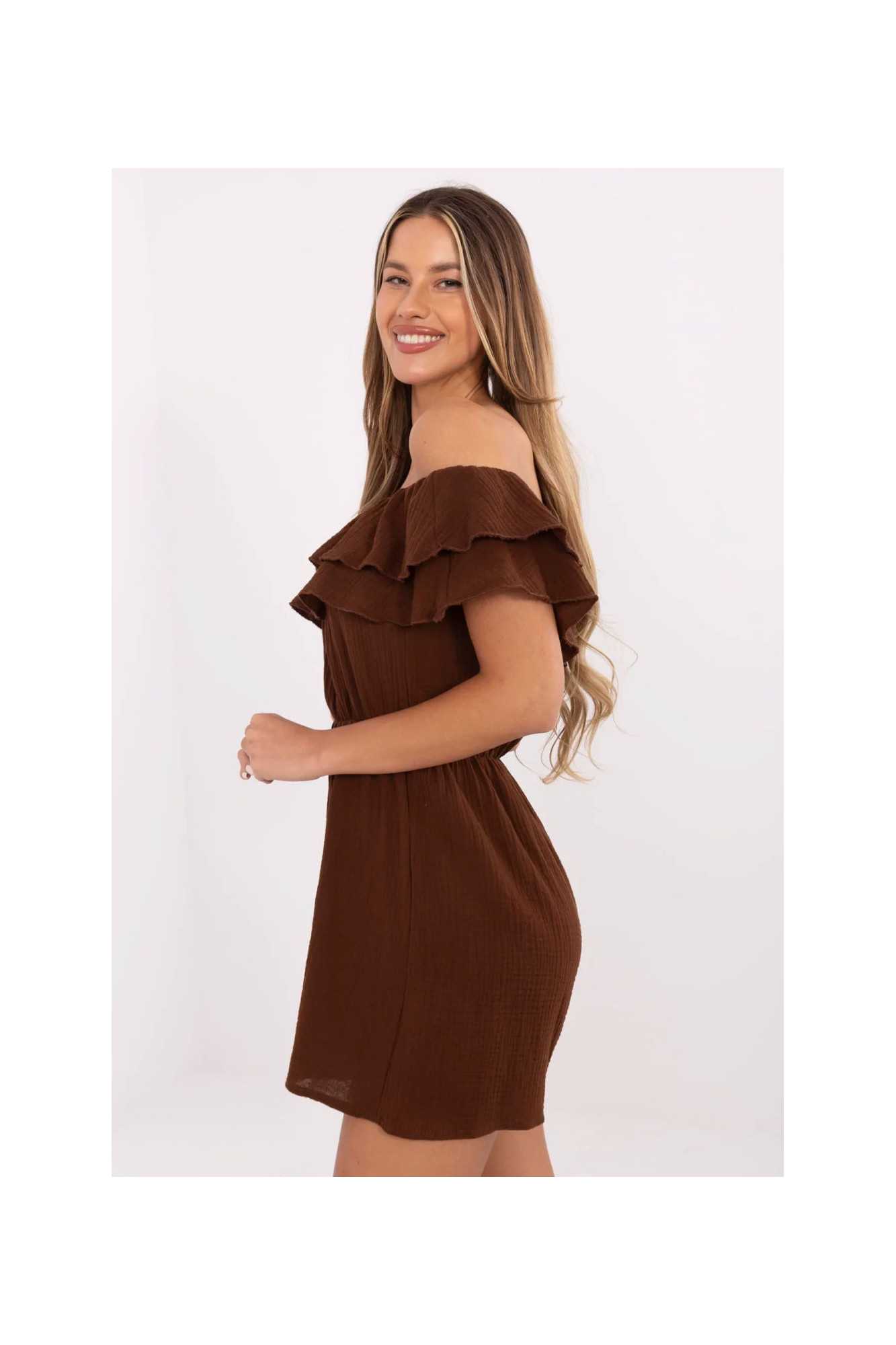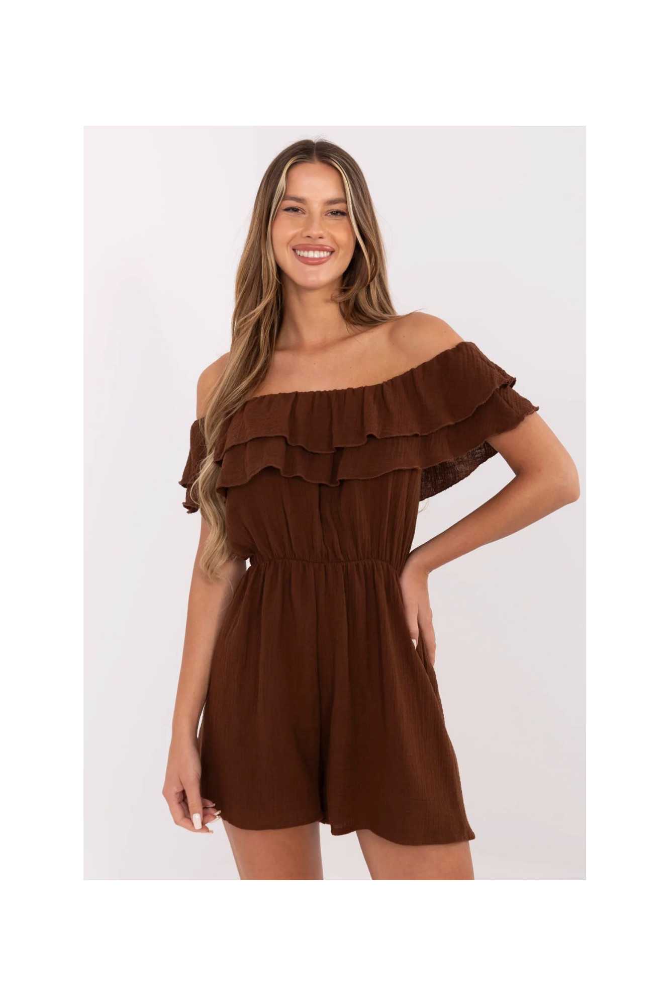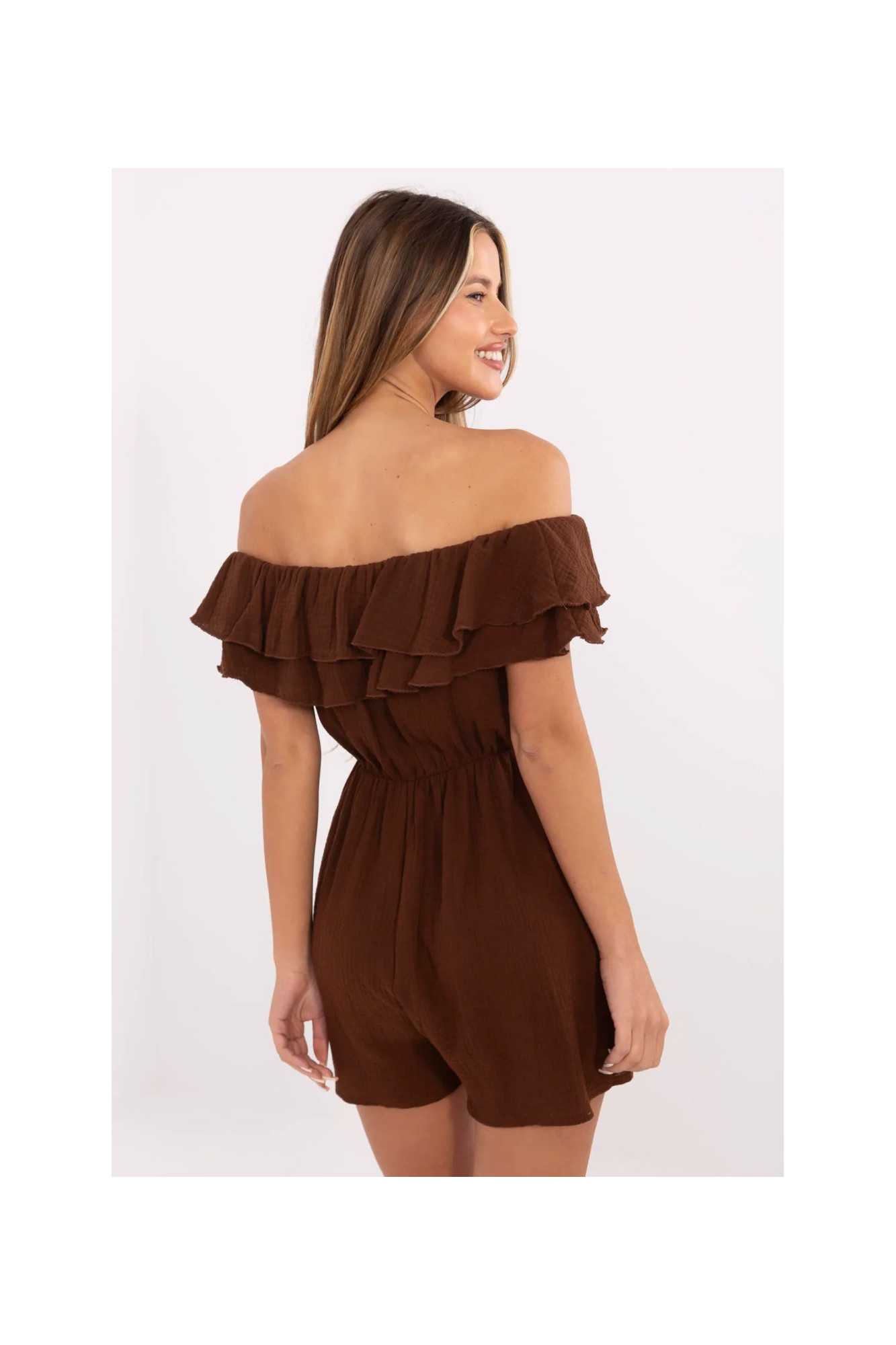 Combinaison en mousseline légère et aérée est une proposition idéale pour les stylisations estivales du quotidien. Fabriqué en coton naturel, il garantit un confort de port et de confort même par temps chaud. La coupe courte sans manches met joliment en valeur les jambes et les épaules, et le décolleté de type espagnol avec un volant décoratif ajoute du charme féminin et de la décontraction estivale. À la taille, il y a un élastique qui souligne subtilement la taille et assure un ajustement parfait à la silhouette. Le modèle n'a pas de fermeture, ce qui le rend exceptionnellement confortable et facile à enfiler. Le matériau lisse associé à une forme simple en fait un choix polyvalent pour tous les jours, parfait pour une promenade, la plage ou pendant les vacances.
