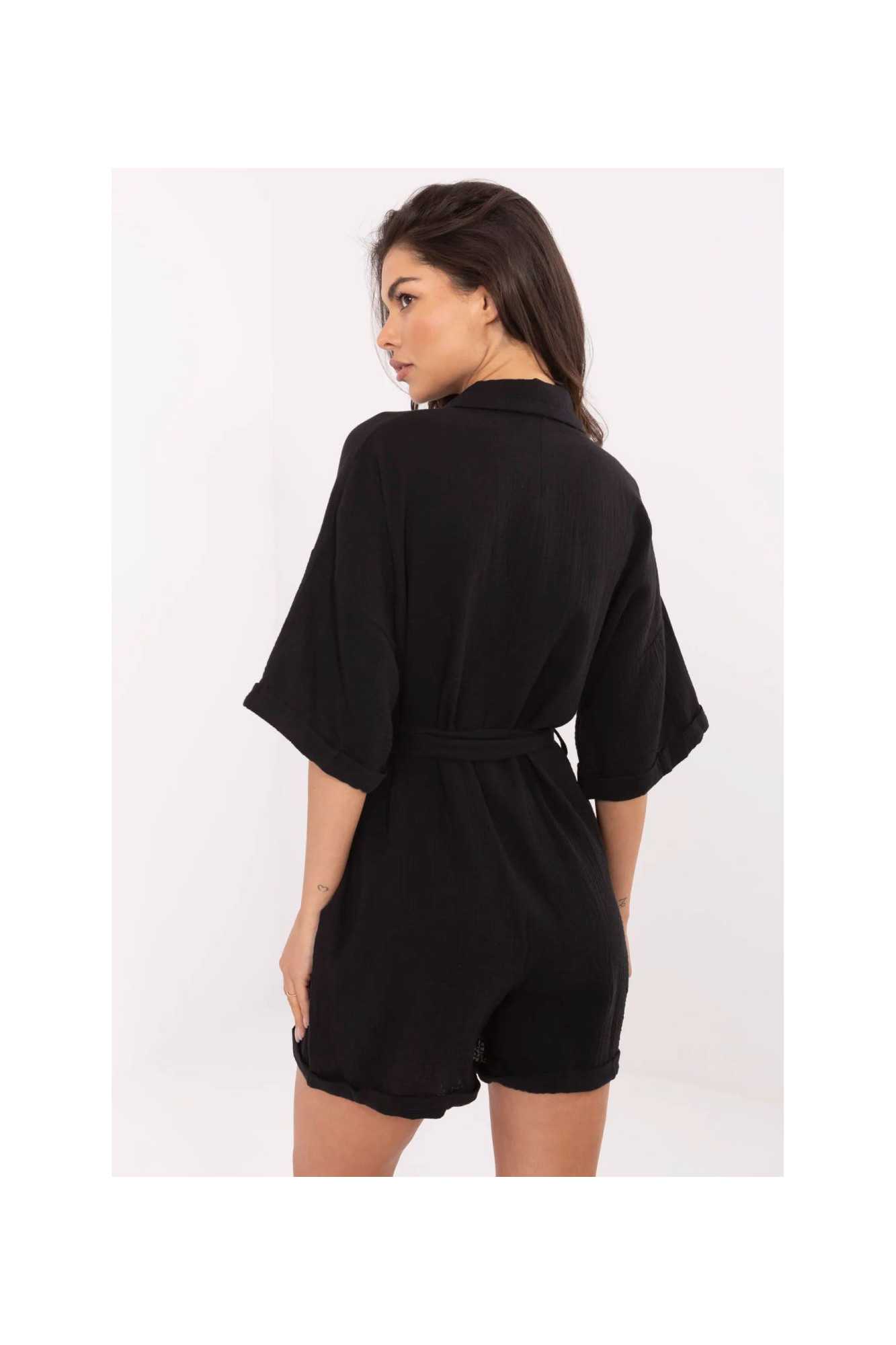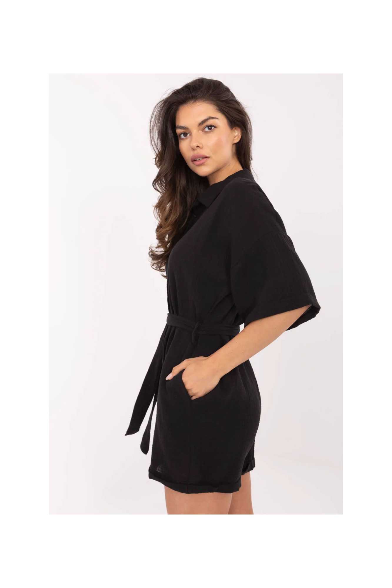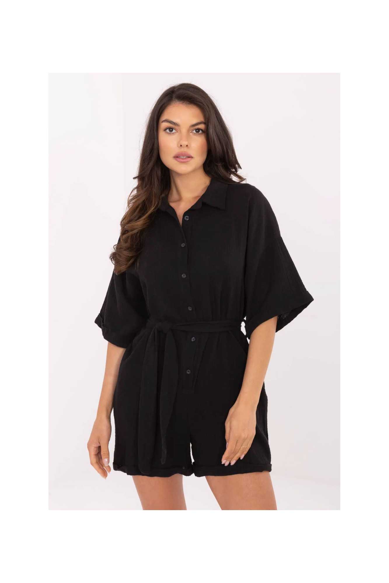 Combinaison légère en mousseline de coton est une proposition idéale pour les tenues quotidiennes par temps plus chaud. La texture lisse du matériau et la respirabilité naturelle du coton garantissent un confort toute la journée. Le modèle à manches courtes et col classique allie liberté et style. Fermé par des boutons à l'avant, ce qui facilite l'enfilage et ajoute une finition élégante. La combinaison est équipée d'une ceinture en tissu à nouer, qui souligne la taille et donne à la silhouette une forme féminine. Les poches latérales insérées augmentent sa fonctionnalité et son confort. Un choix pratique et élégant pour l'été, parfait pour une balade, des courses ou des rencontres détendues entre amis.