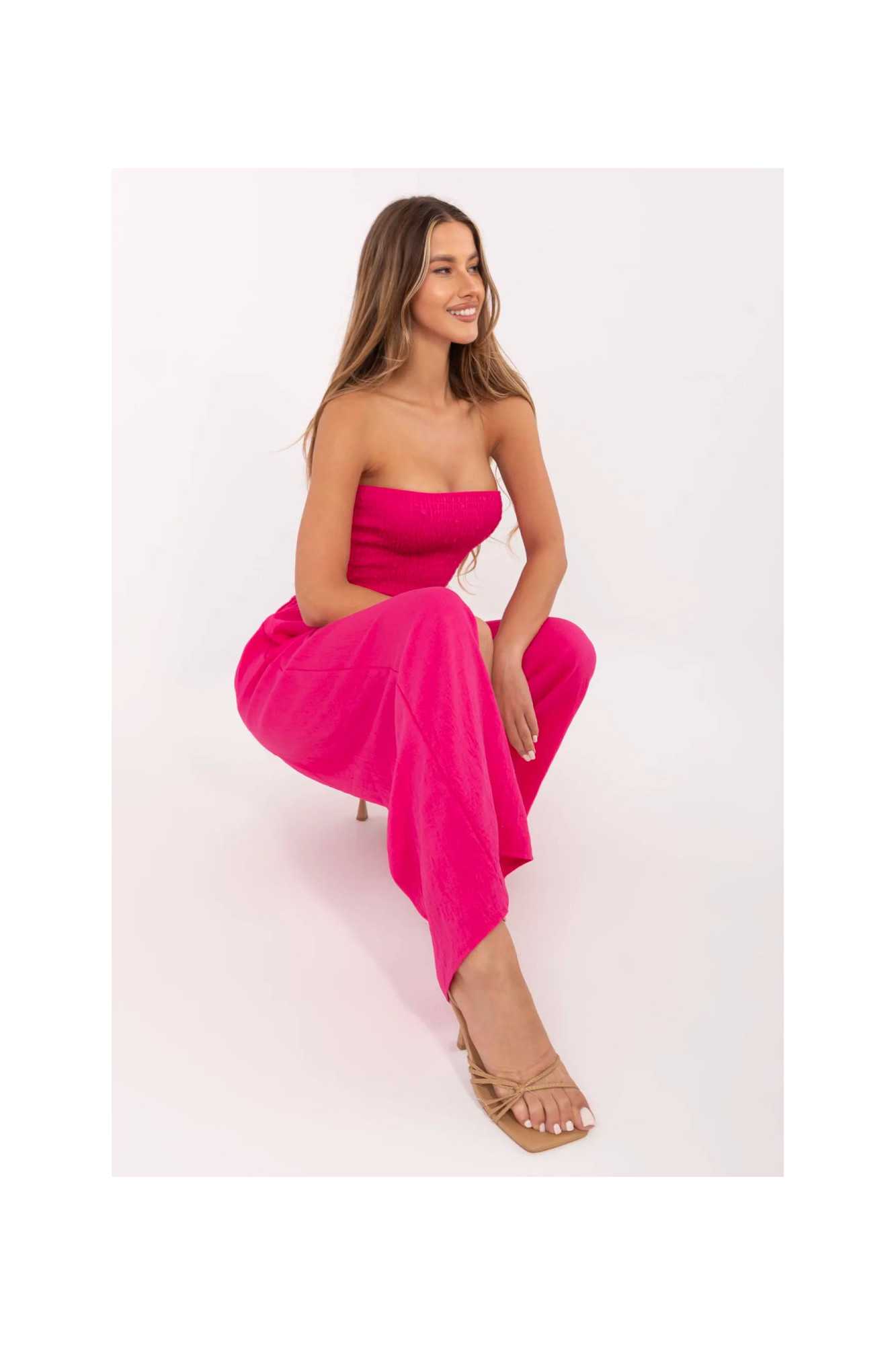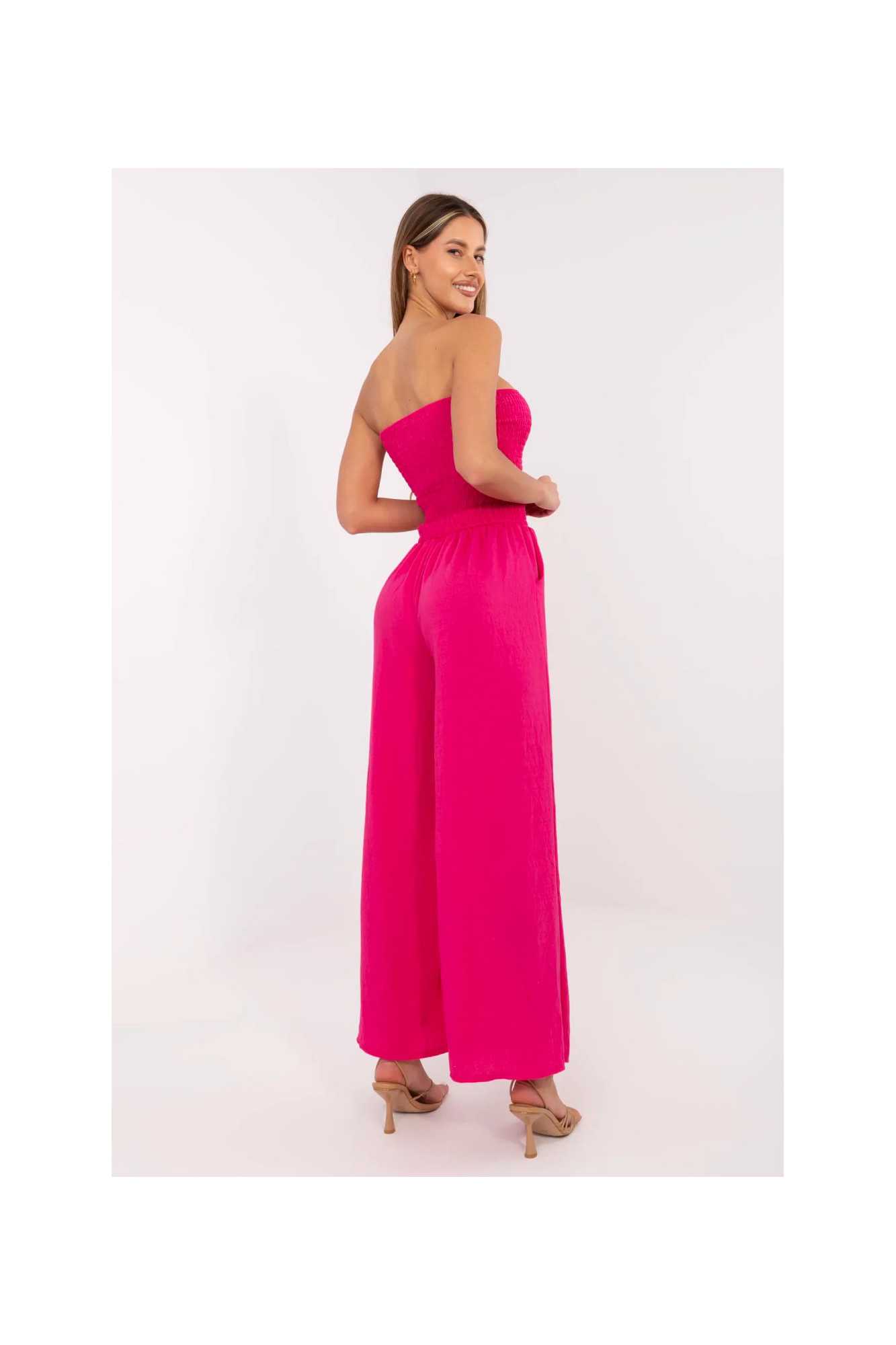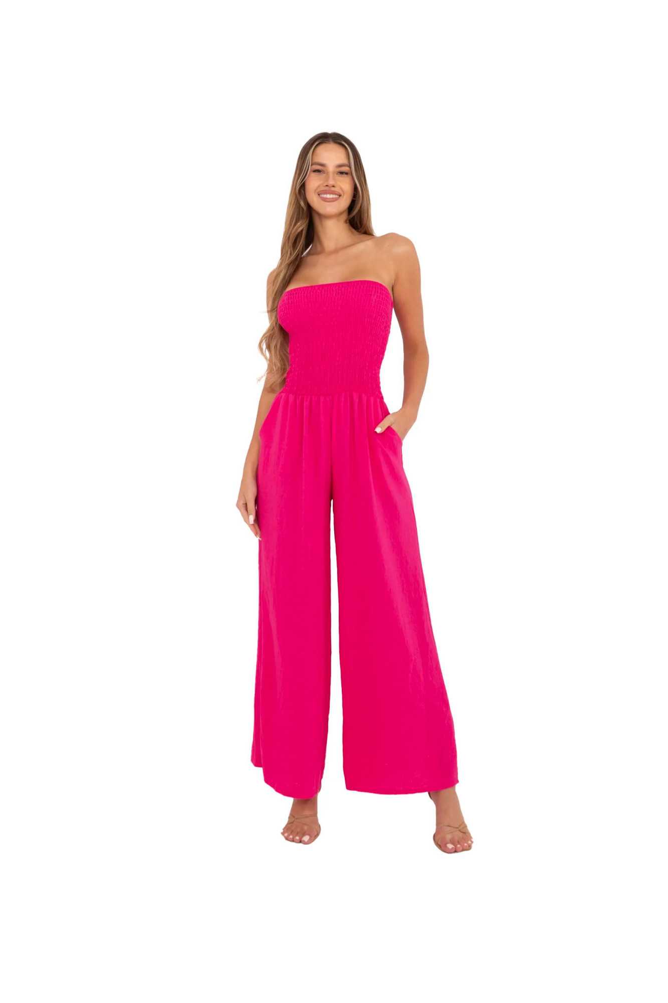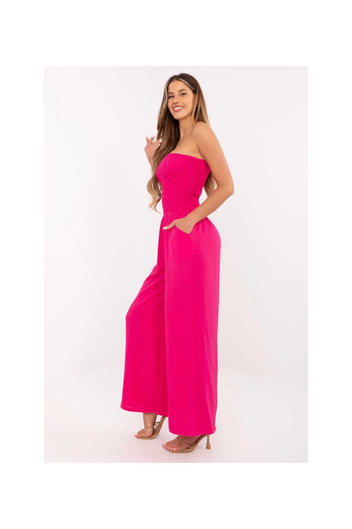 Combinaison élégante et confortable, parfaite pour les sorties quotidiennes. Fabriquée en viscose légère et douce, elle garantit un confort toute la journée. Sa forme longue et ample avec des jambes larges et un décolleté espagnol crée un look moderne et décontracté. Le tissu lisse souligne le caractère minimaliste du modèle, tandis que les plis dans la partie supérieure lui ajoutent une légèreté subtile. L'absence de fermeture facilite l'enfilage rapide, et les poches latérales insérées augmentent sa fonctionnalité. Un choix idéal pour les femmes qui apprécient le style et le confort en un seul.