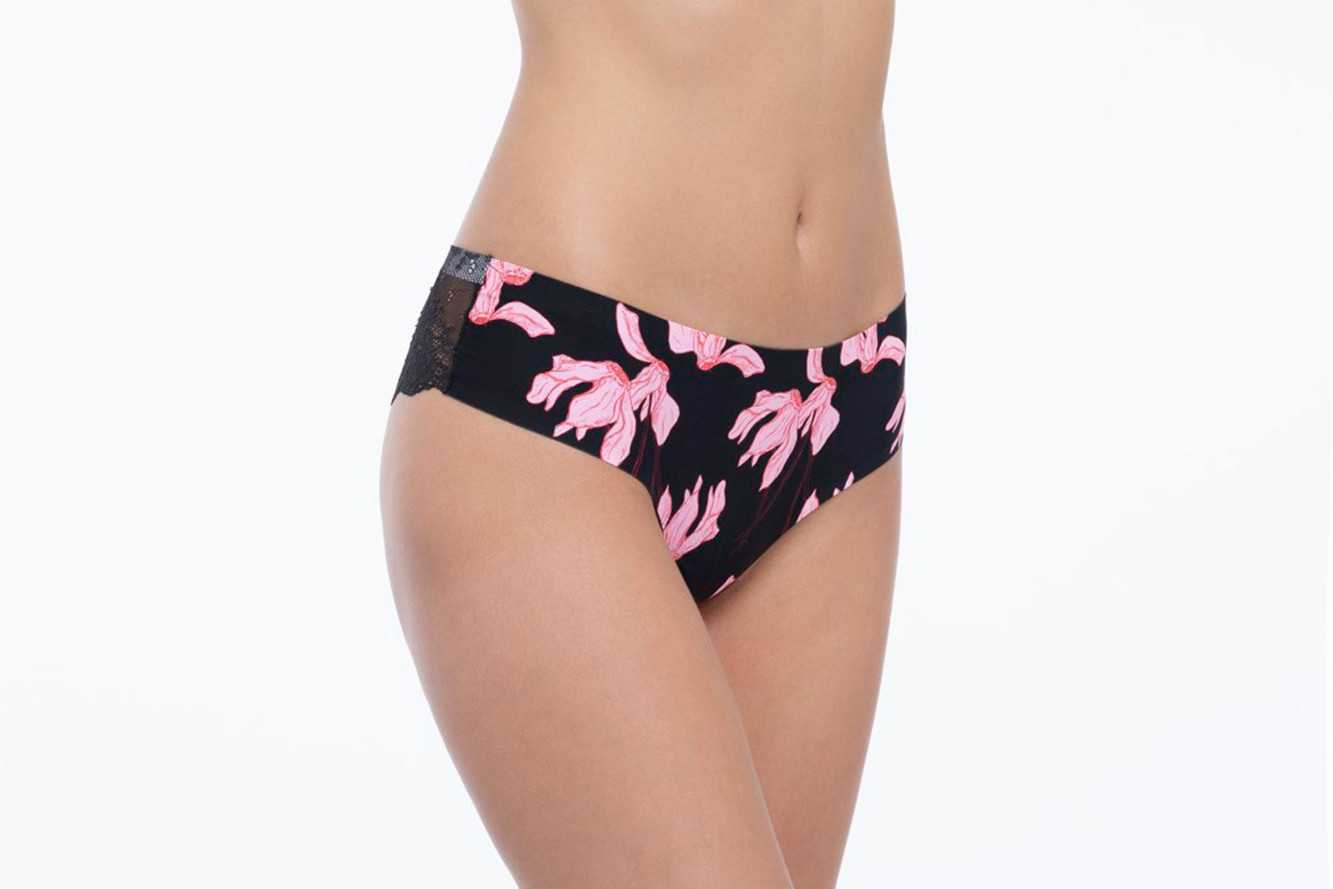 Le bas de bikini CYKLAMEN TANGA est un modèle avec un dos en dentelle. La dentelle sur les fesses les met en valeur et ajoute à leur confiance. Les fleurs sont posées sur un fond noir puissant et la bordure rouge souligne leur forme originale. La culotte se caractérise par son confort et sa finition sans couture grâce à la technologie brevetée JULIMEX INVISIBLE-LINE ? grâce à laquelle elle restera invisible même sous des tenues moulantes. Chaque modèle de fond est doté d'un insert 100% coton.
