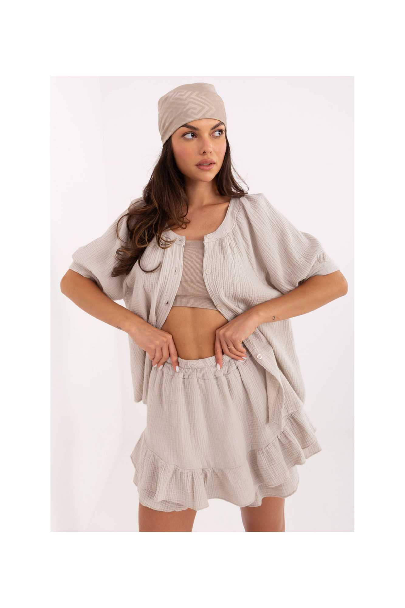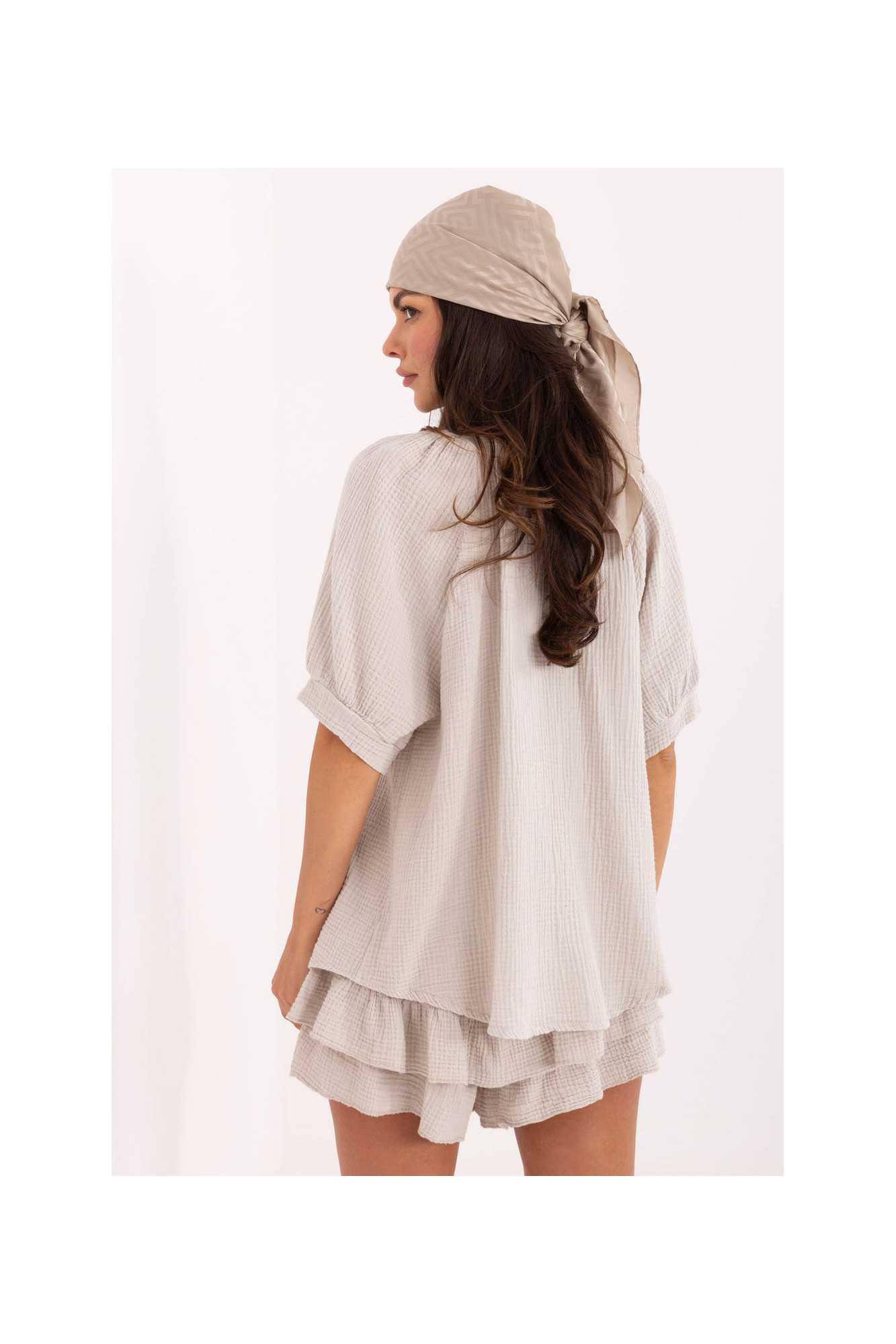 Ensemble léger et aéré en mousseline de coton naturel, idéal pour les journées chaudes. Il se compose d'une chemise boutonnée et d'un short à volants imitant une jupe, le tout créant une tenue décontractée et cohérente pour tous les jours. La chemise a une coupe ample, des manches courtes et un col rond, offrant ainsi une liberté de mouvement et une légèreté de style. Le short a des jambes larges et une taille haute avec une bande élastique, garantissant un confort de port et un ajustement parfait à la silhouette. Les délicats volants ajoutent un charme féminin et de la légèreté à toute la tenue. La texture lisse du tissu souligne le caractère naturel et minimaliste de l'ensemble, qui conviendra parfaitement aux promenades, aux courses, aux rencontres entre amis ou aux vacances. Un incontournable dans la garde-robe estivale et quotidienne.
