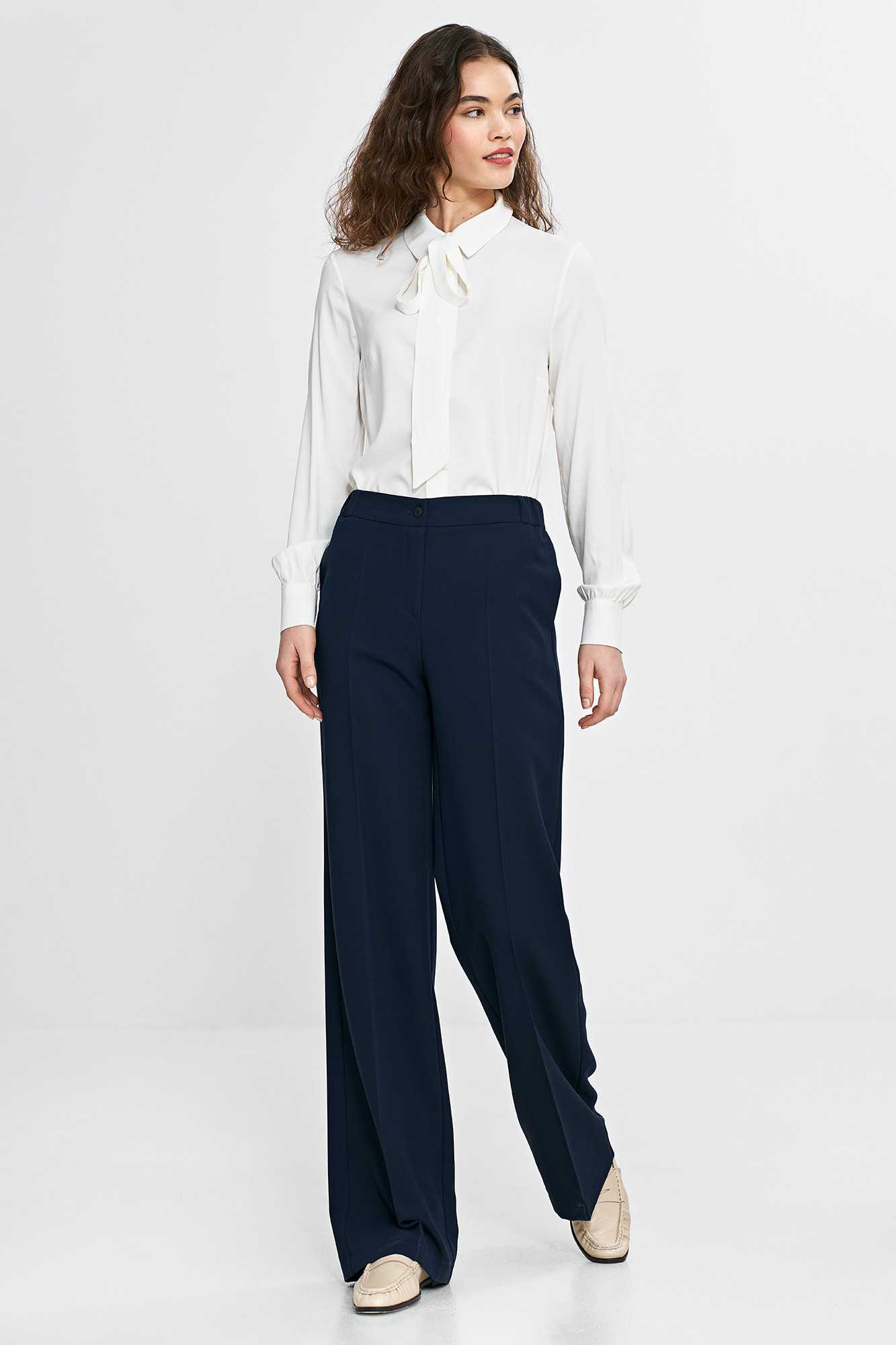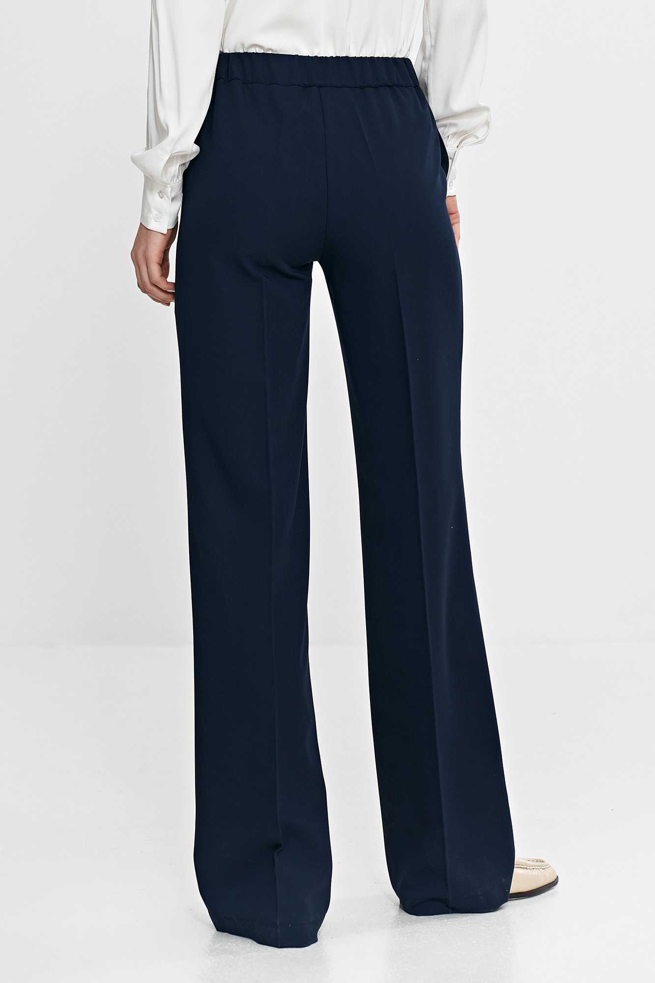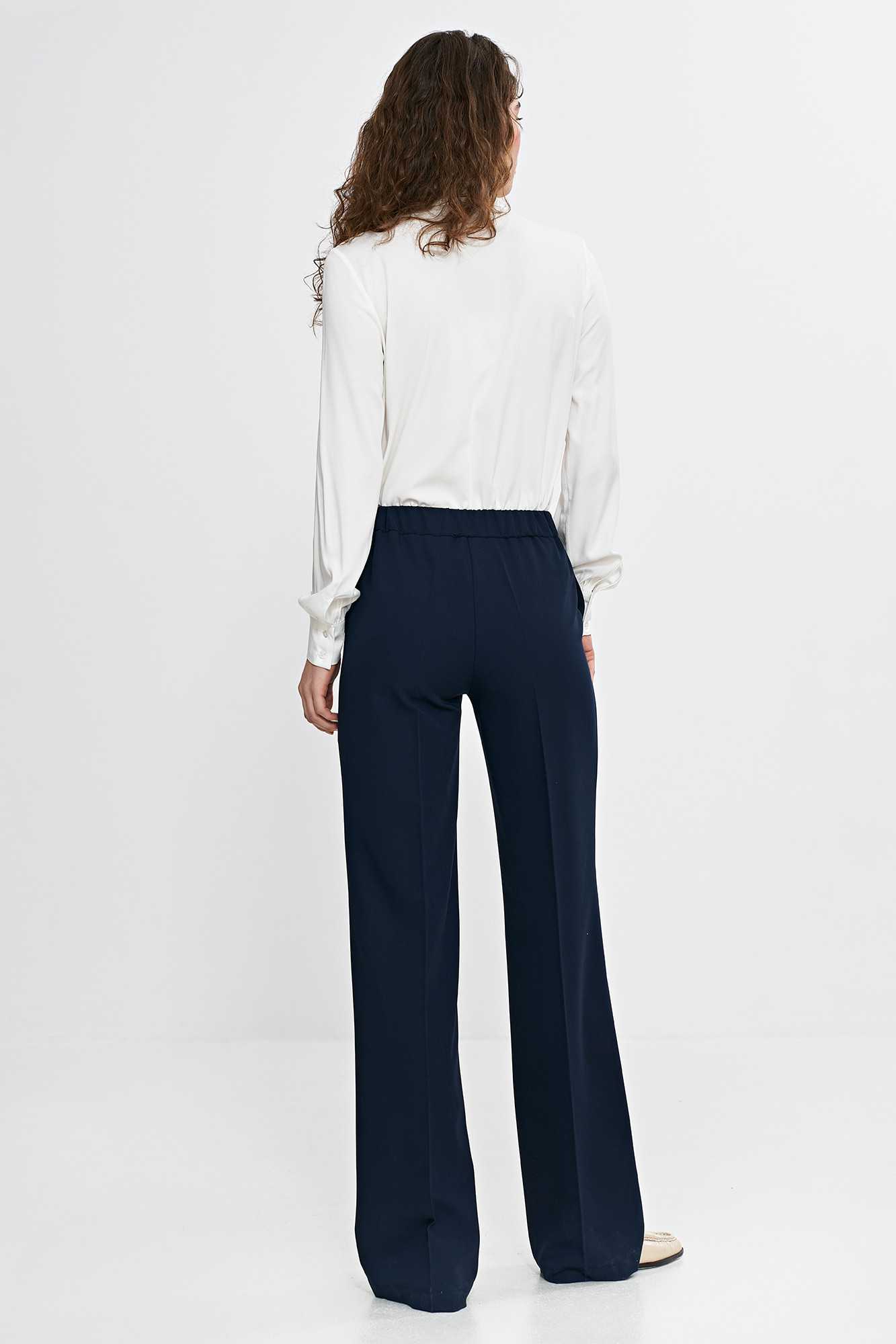 Coupe classique. Taille mi-haute. Jambes larges. Plis marqués devant et dos. Fermeture zippée et boutonnée. Poches avant classiques. Élastique à la taille, sur les côtés et au dos pour un ajustement parfait. Composition : 75 % polyester, 23 % viscose, 2 % élasthanne. Le mannequin mesure 176 cm et porte une taille 36.