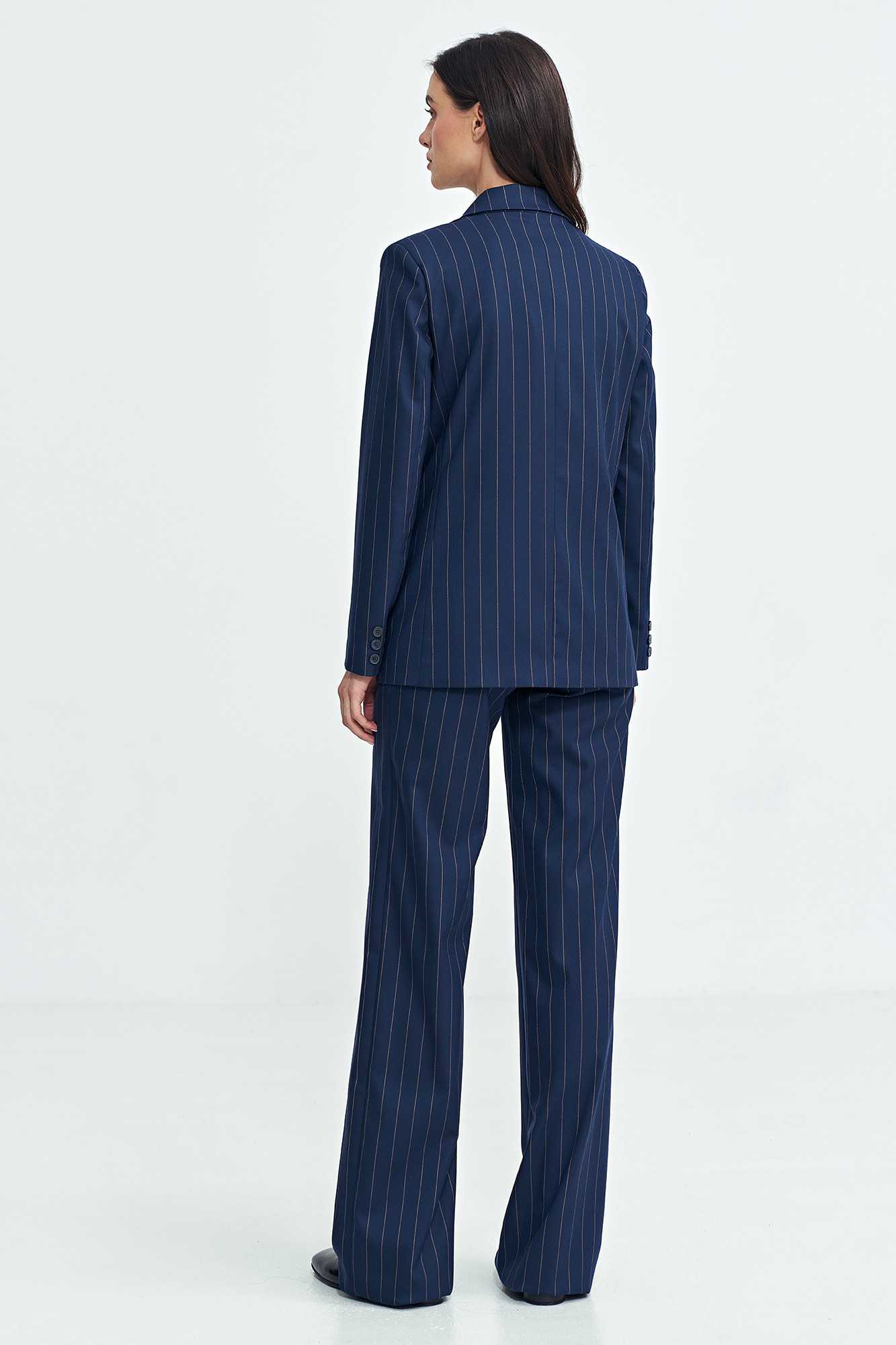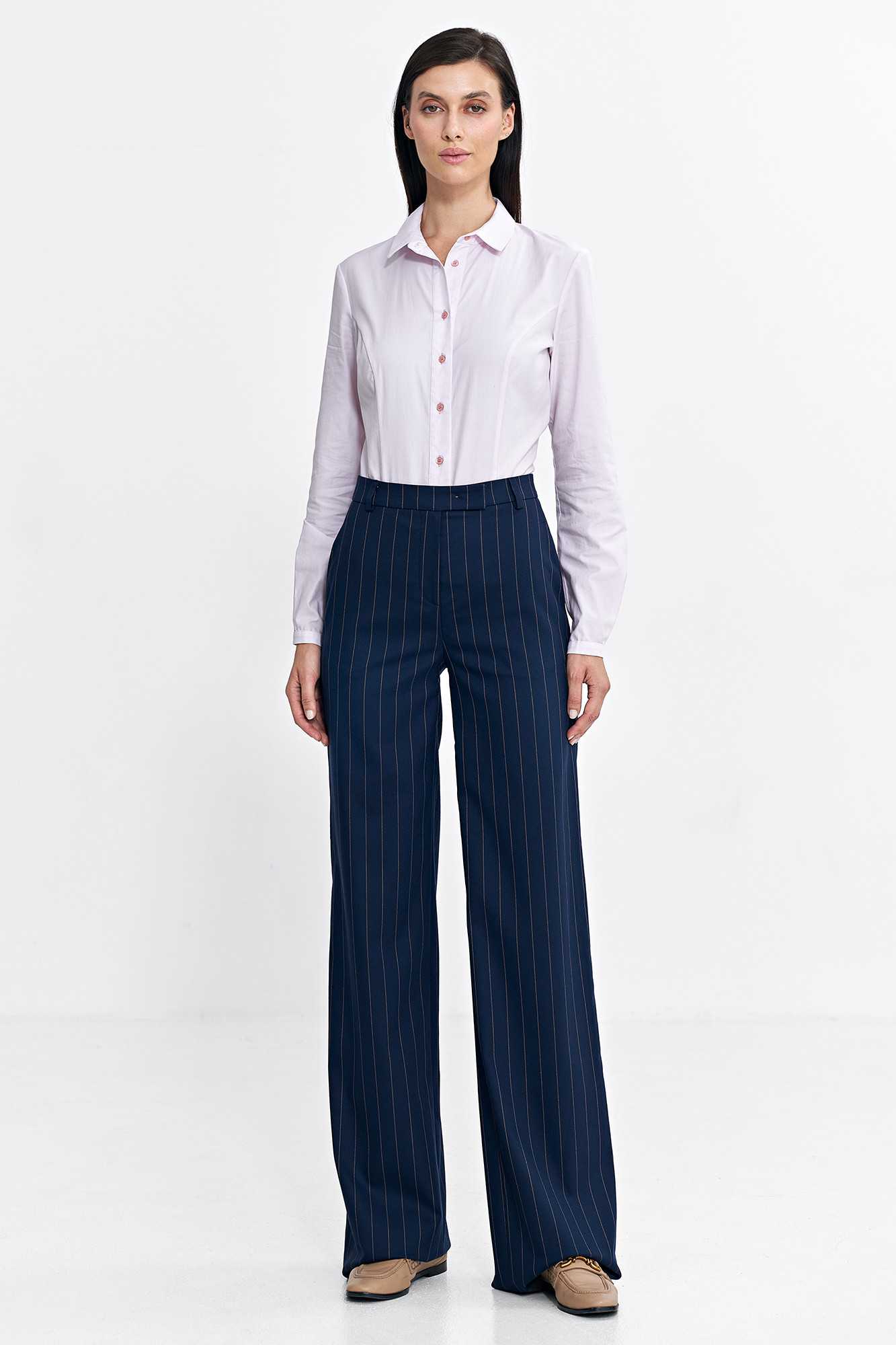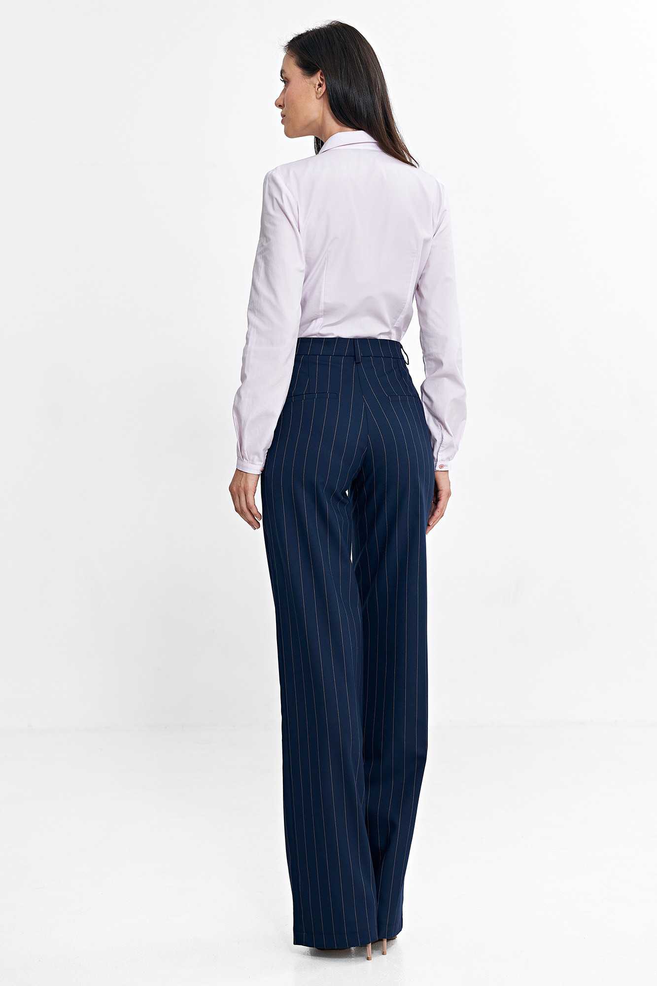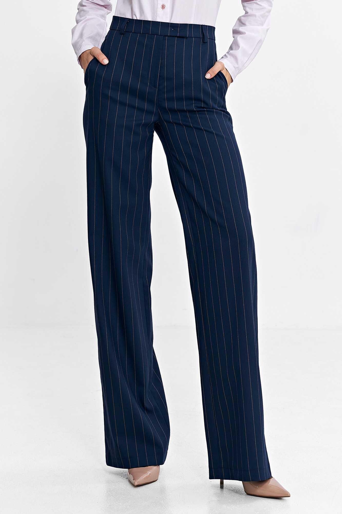 Coupe ajustée et cintrée. Tissu à fines rayures contrastées, style tennis. Taille haute. Jambes évasées. Fermeture zippée avec patte de boutonnage. Poches avant classiques et fausses poches arrière. Passants de ceinture. Composition : 65 % polyester, 32 % viscose, 3 % élasthanne. Le mannequin mesure 1,76 m et porte une taille 36.