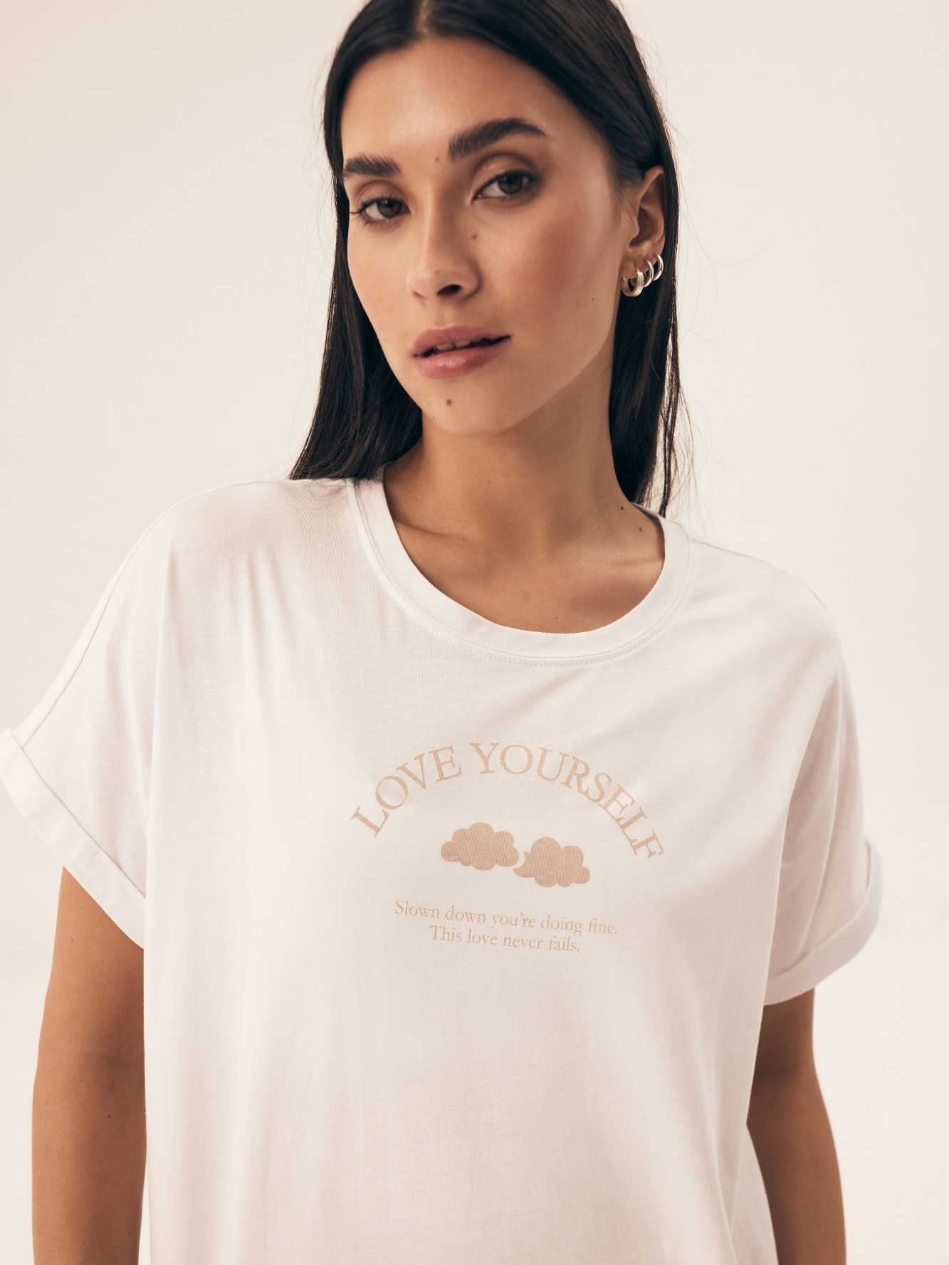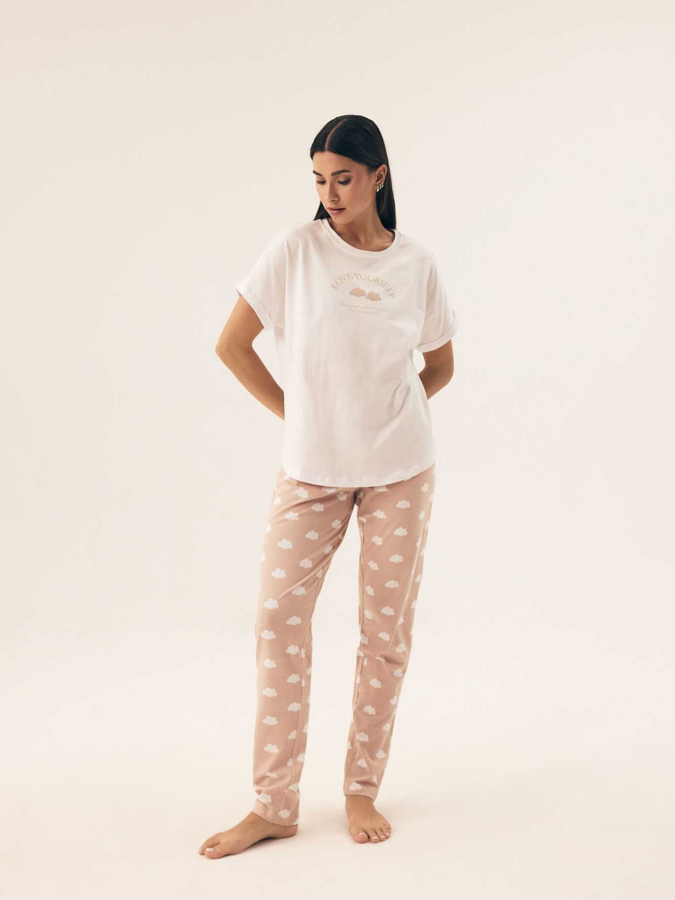 Ce pyjama pour femme est le choix idéal pour les femmes à la recherche d'un mélange de confort et de style subtil. Le haut à manches courtes et col rond, orné d'un motif tendance, a une coupe ample et confortable qui garantit une liberté de mouvement totale. Fabriqué dans un tissu doux et respirant, il convient parfaitement à toutes les saisons. Le pantalon imprimé, long et sans poches, est confortable et stylé. La large bande élastique à la taille assure un ajustement parfait et un confort toute la nuit. La palette de couleurs discrète du pyjama lui confère un caractère élégant et intemporel. C'est le pyjama parfait pour une nuit paisible, offrant confort et style à la maison. Composition : Haut : 100% coton Bas : 95% coton, 5% élasthanne