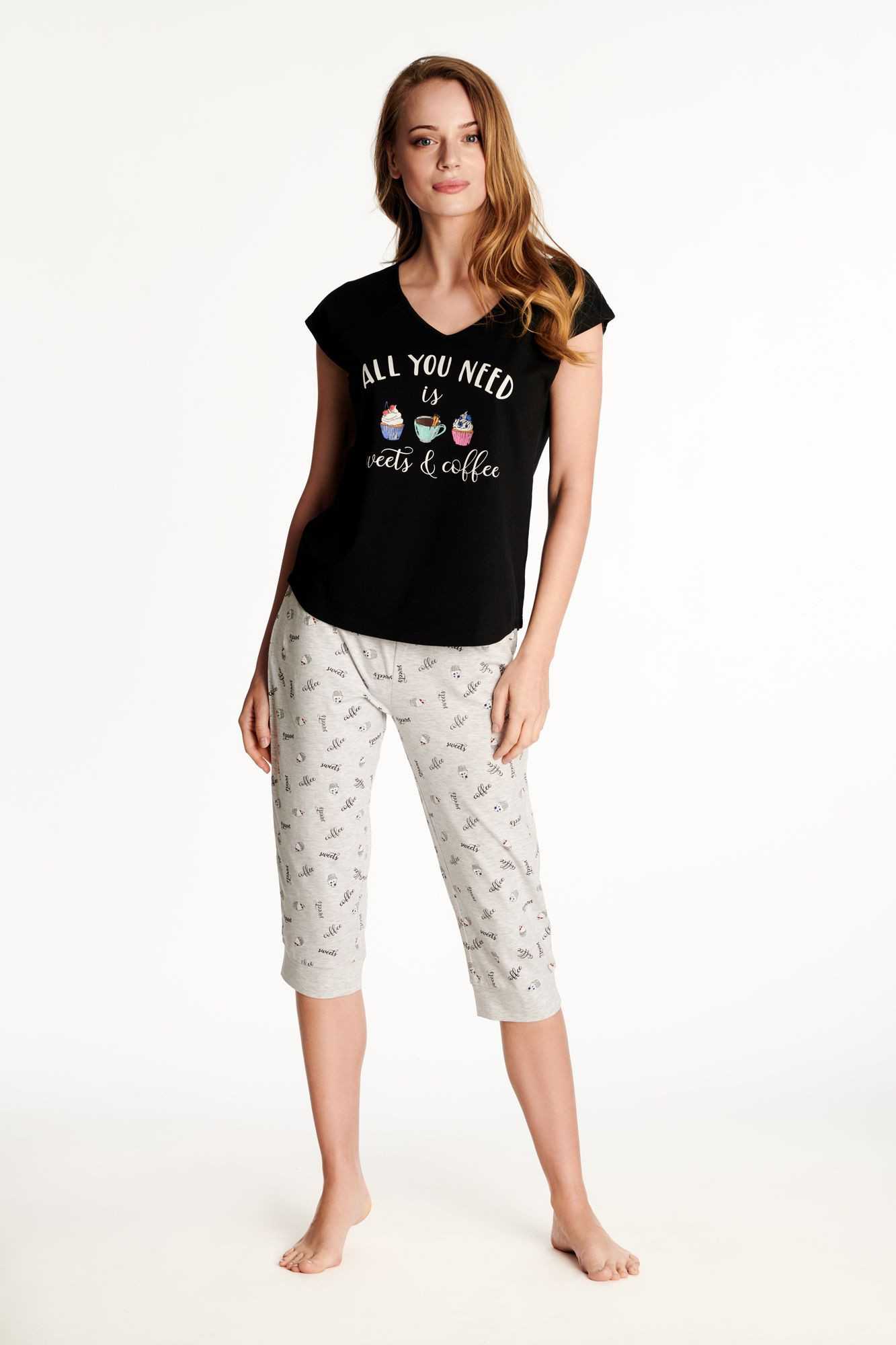 Ah ces jolies touches ! Westley est le dernier pyjama pour dames Henderson avec un thème doux ! Littéralement. Sur le dessus, vous trouverez les mots "All you need is sweets & coffee" et des biscuits. Le fond noir et sombre complète cet ensemble charmant. L'ensemble comprend également un pantalon à motifs très confortable, allant jusqu'aux genoux, avec une ceinture élastique plate, large et imprimée.
