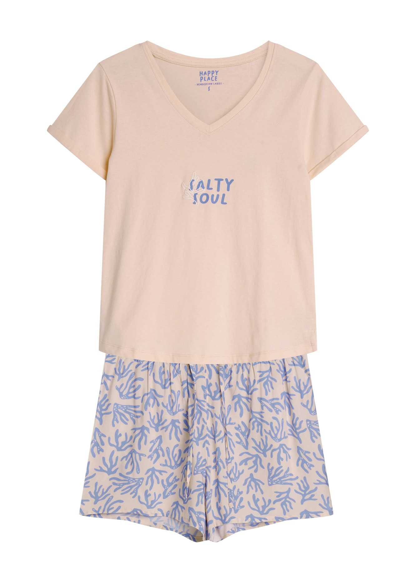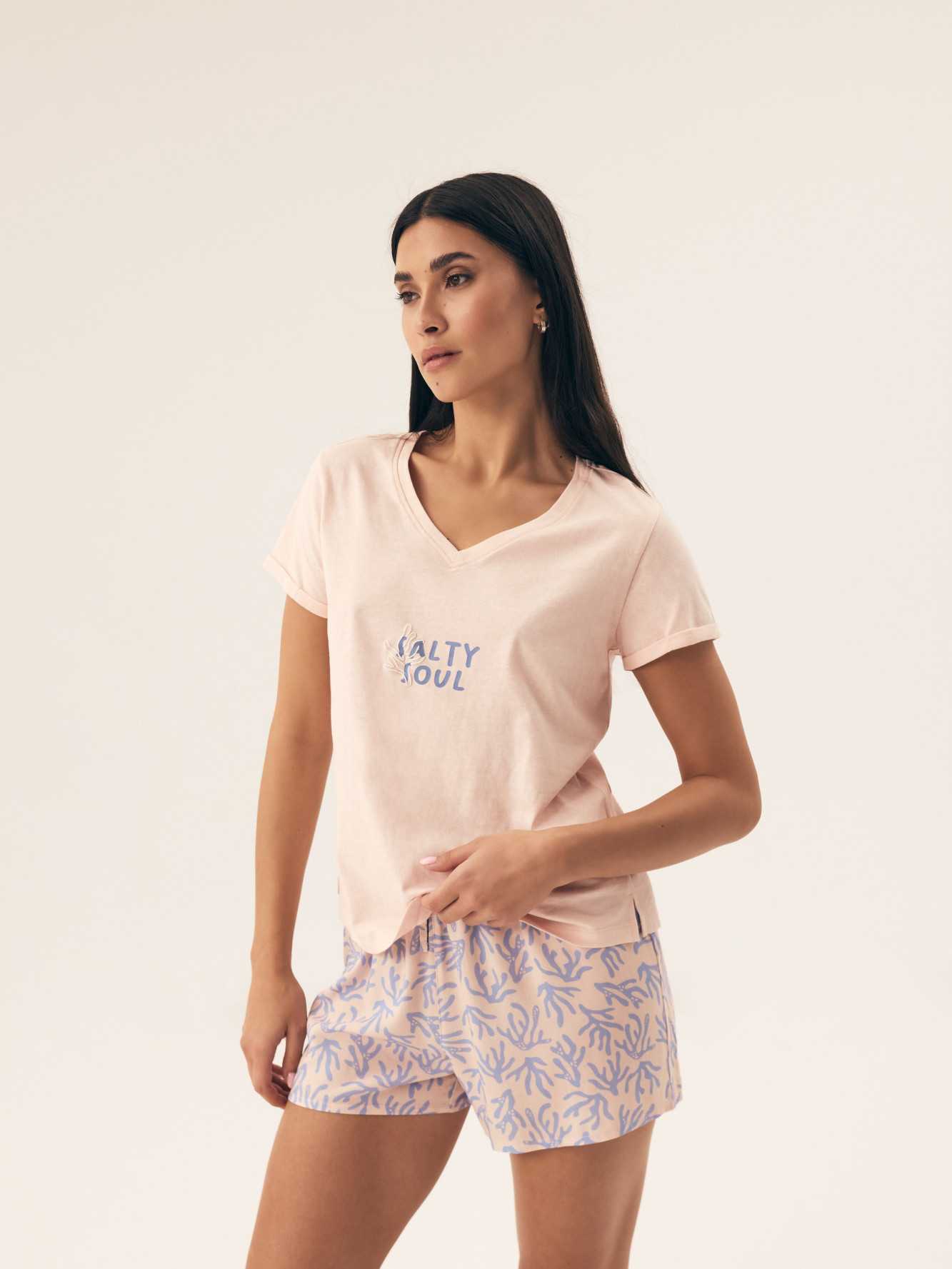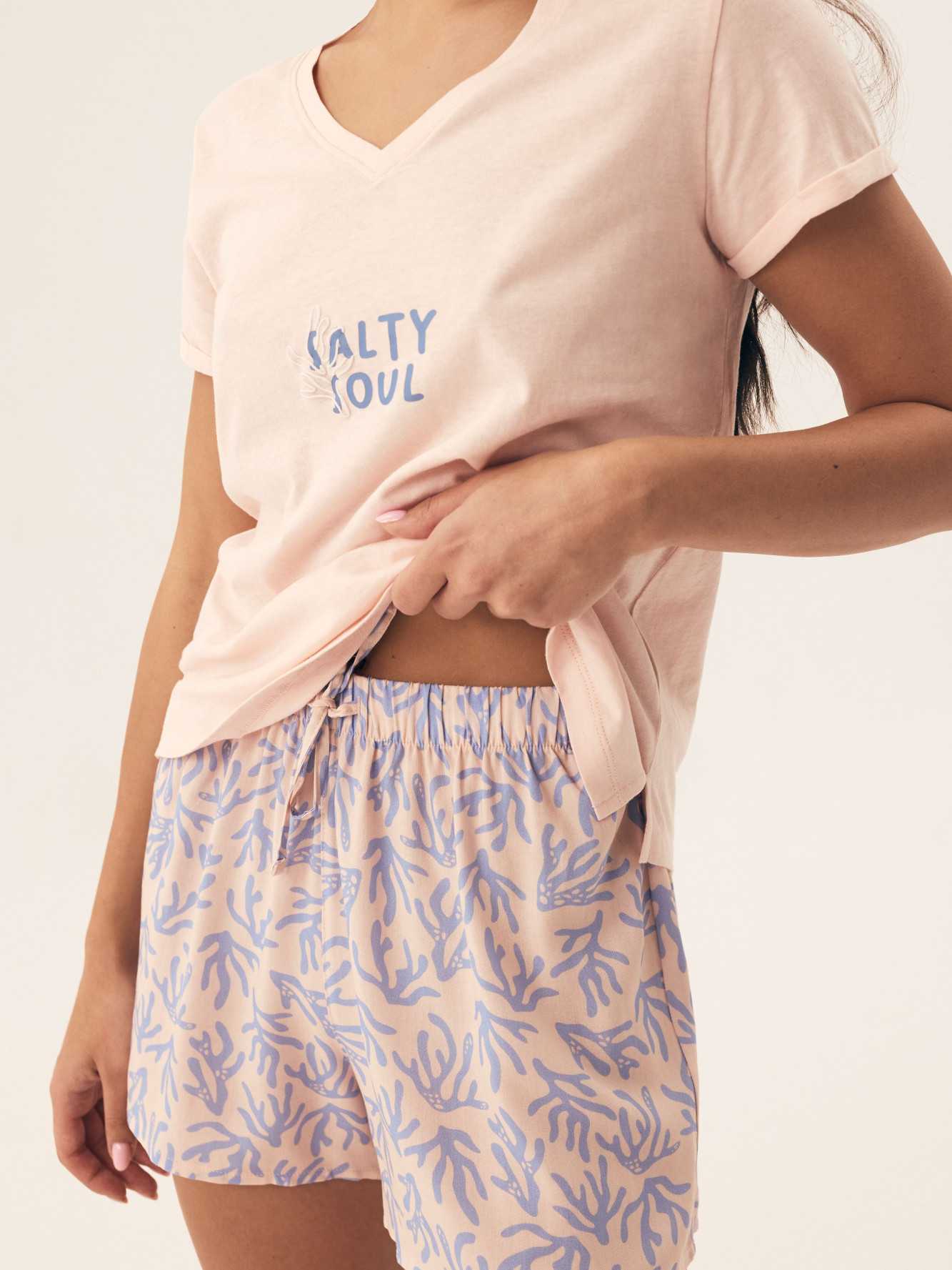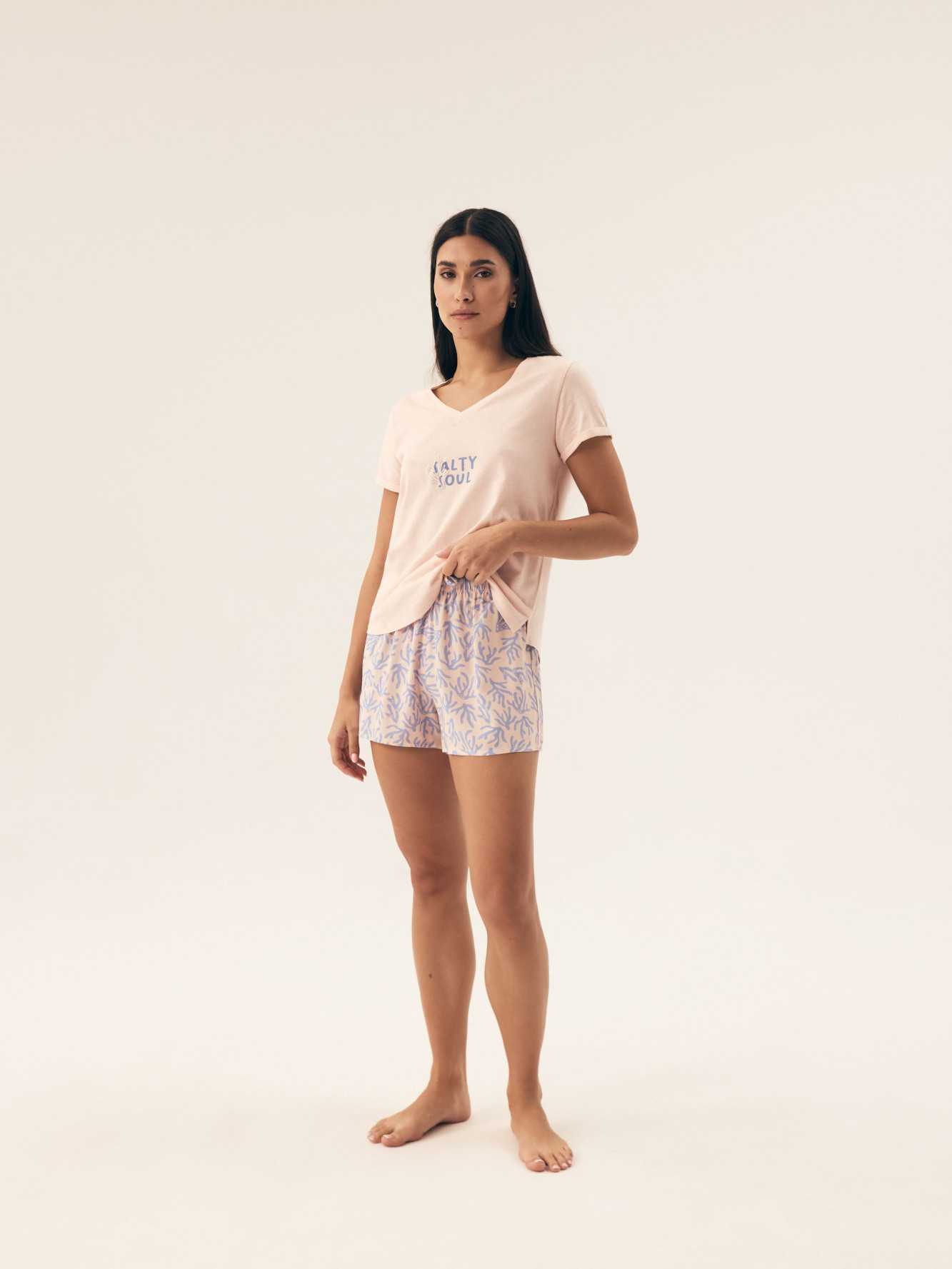 Ce pyjama pour femme est un choix parfait pour les femmes qui apprécient le confort et le style. Le haut à manches courtes a un décolleté en V qui met subtilement en valeur le cou, et l'imprimé à la mode lui donne un caractère exceptionnel. Fabriqué dans un tissu doux et aéré, il offre un plaisir à porter toute la nuit. Le short imprimé complète l'ensemble, offrant confort et légèreté. La ceinture élastique garantit un ajustement parfait, tandis que la coupe ample et confortable permet une liberté de mouvement. Ce pyjama est une excellente proposition pour des nuits paisibles, offrant un confort qui conviendra également comme vêtement de maison élégant! Composition: Haut: 100% coton Bas: 100% viscose