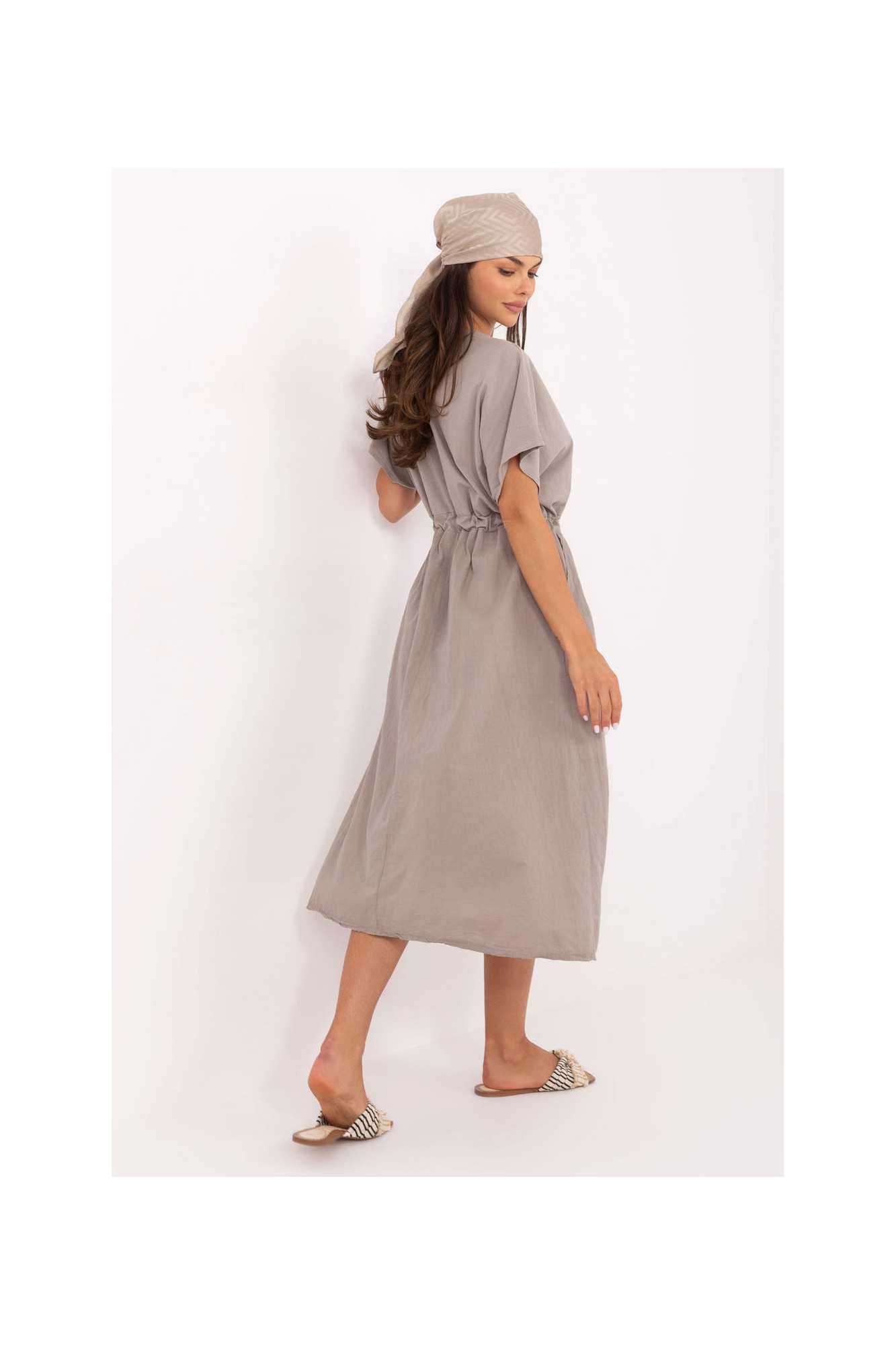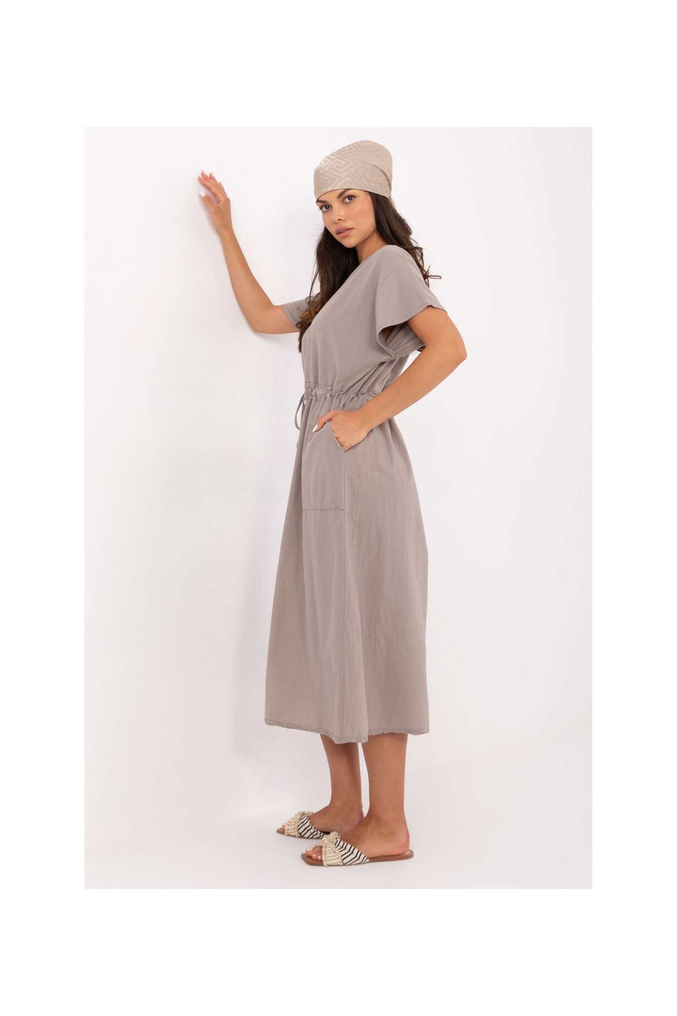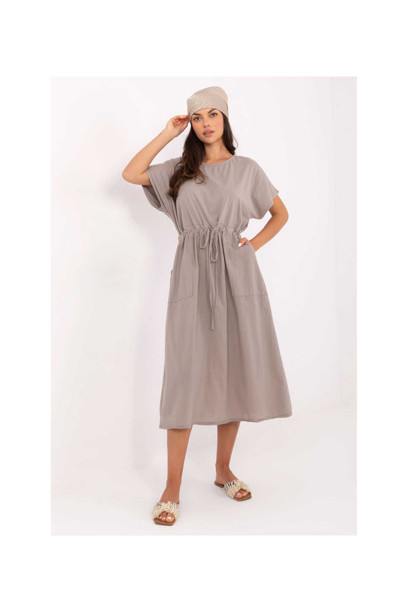 Une robe d'été légère et confortable, de coupe évasée, fabriquée en coton naturel. Le tissu lisse assure un confort de port et convient parfaitement aux tenues quotidiennes. Modèle de longueur midi, avec des manches courtes et un décolleté rond classique. À la taille, il y a un laçage qui permet de souligner la silhouette et d'ajuster la robe à la forme du corps. Un autre atout sont les poches pratiques et insérées qui ajoutent fonctionnalité et décontraction. C'est une proposition idéale pour les journées estivales, pour une promenade, des courses, pour le travail ou une rencontre avec des amis. Universelle et intemporelle, elle sera une excellente base pour de nombreuses tenues.