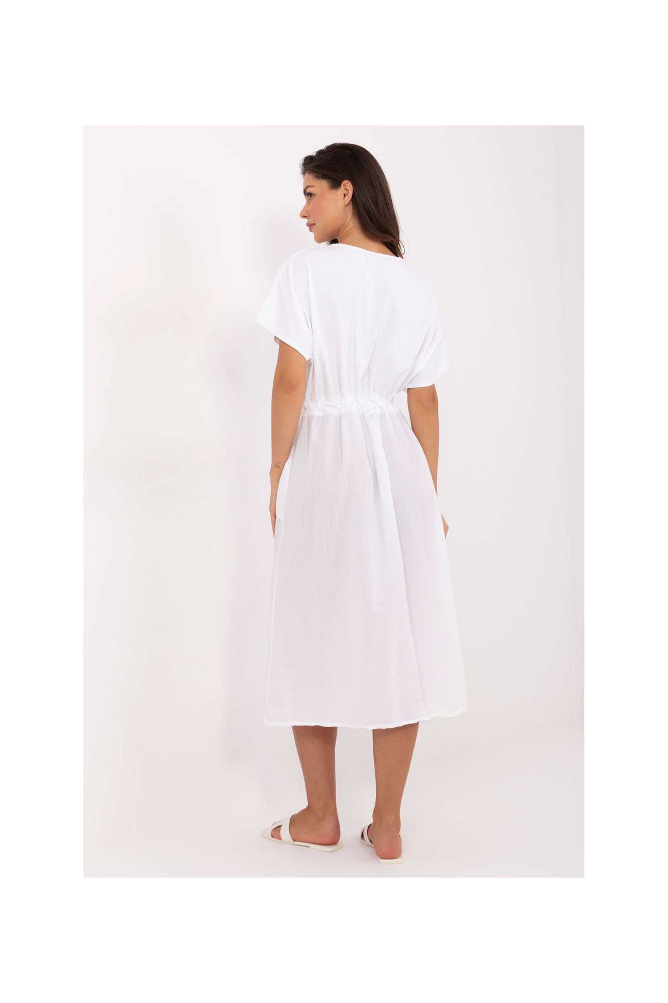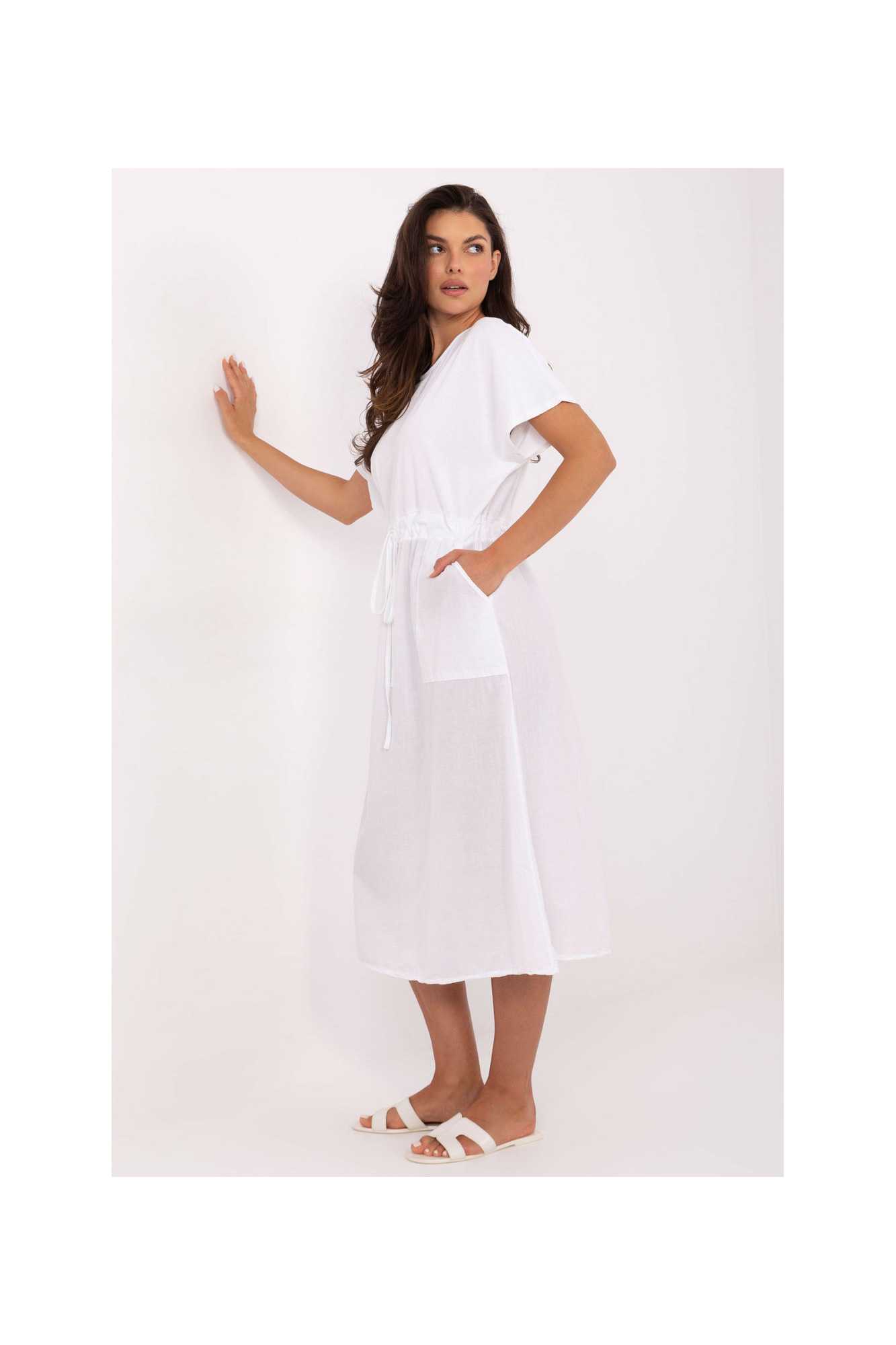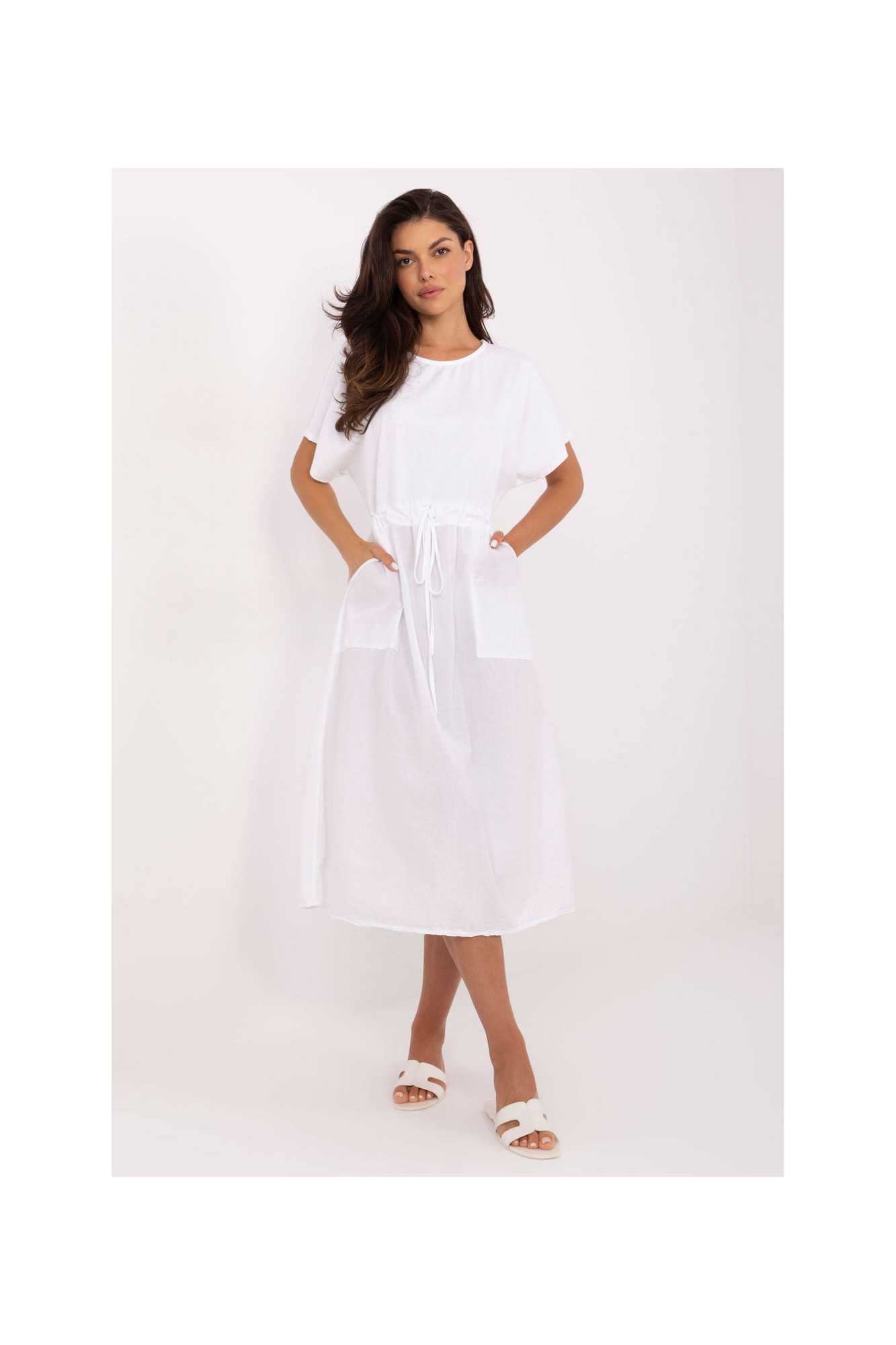 Robe d'été légère et confortable à la coupe évasée, fabriquée en coton naturel. Le tissu lisse assure un confort de port et se marie parfaitement avec les tenues quotidiennes. Modèle de longueur midi, avec des manches courtes et un décolleté classique et rond. À la taille, il y a un laçage qui permet de souligner la silhouette et d'ajuster la robe à la forme du corps. Un autre avantage est les poches pratiques et discrètes, qui ajoutent fonctionnalité et décontraction. C'est une proposition idéale pour les journées d'été, que ce soit pour une promenade, des achats, le travail ou une rencontre avec des amis. Polyvalente et intemporelle, elle sera une excellente base pour de nombreuses tenues.