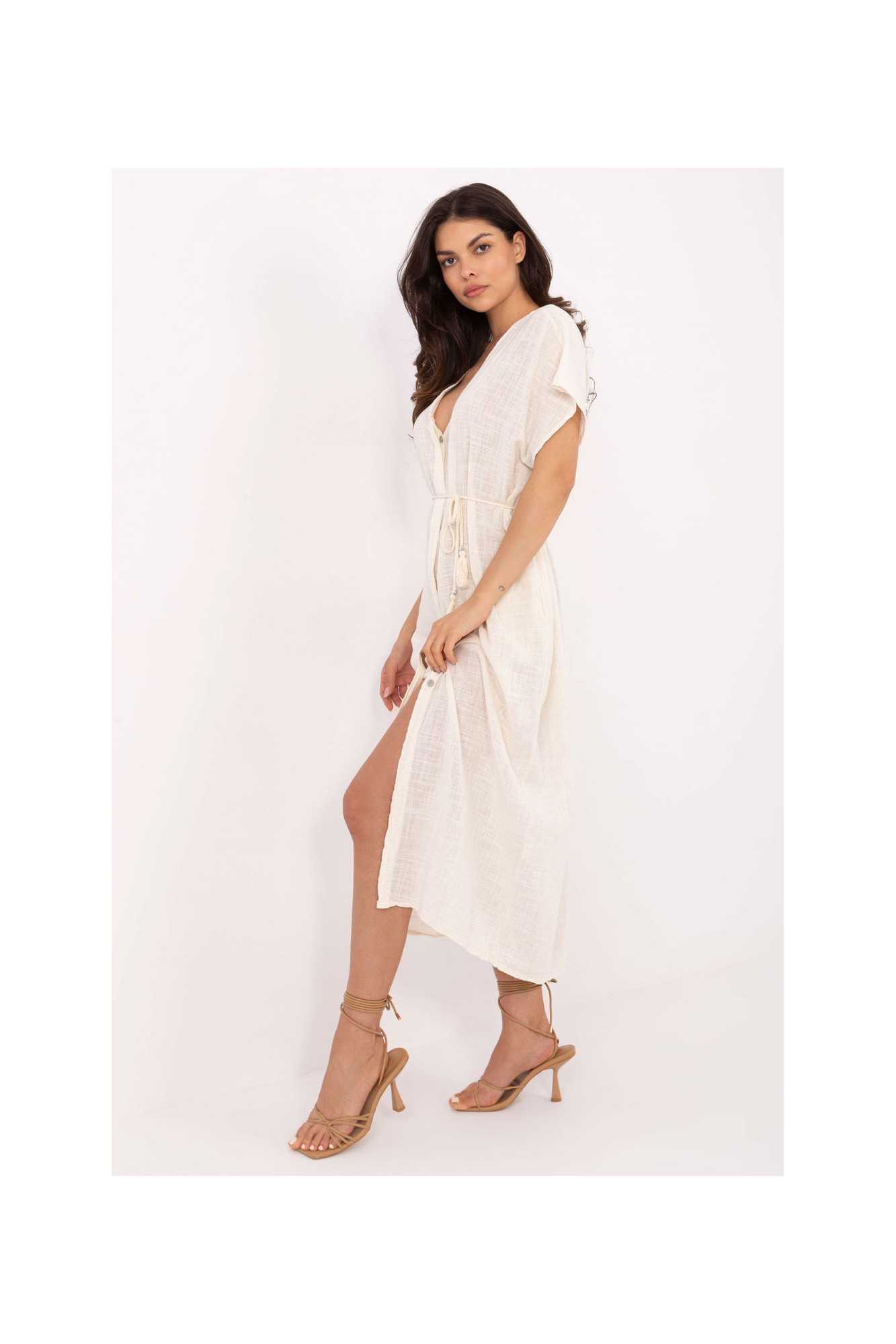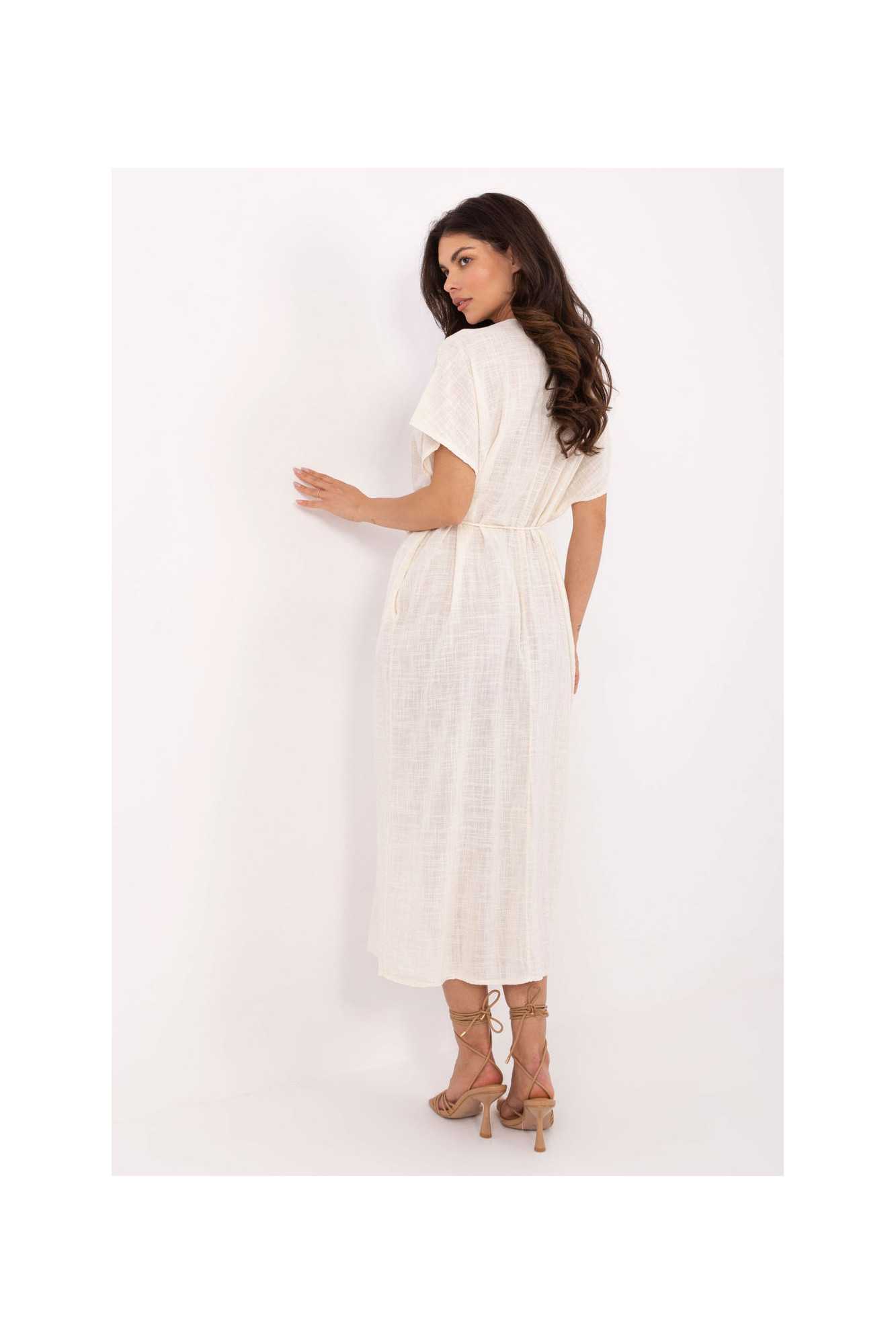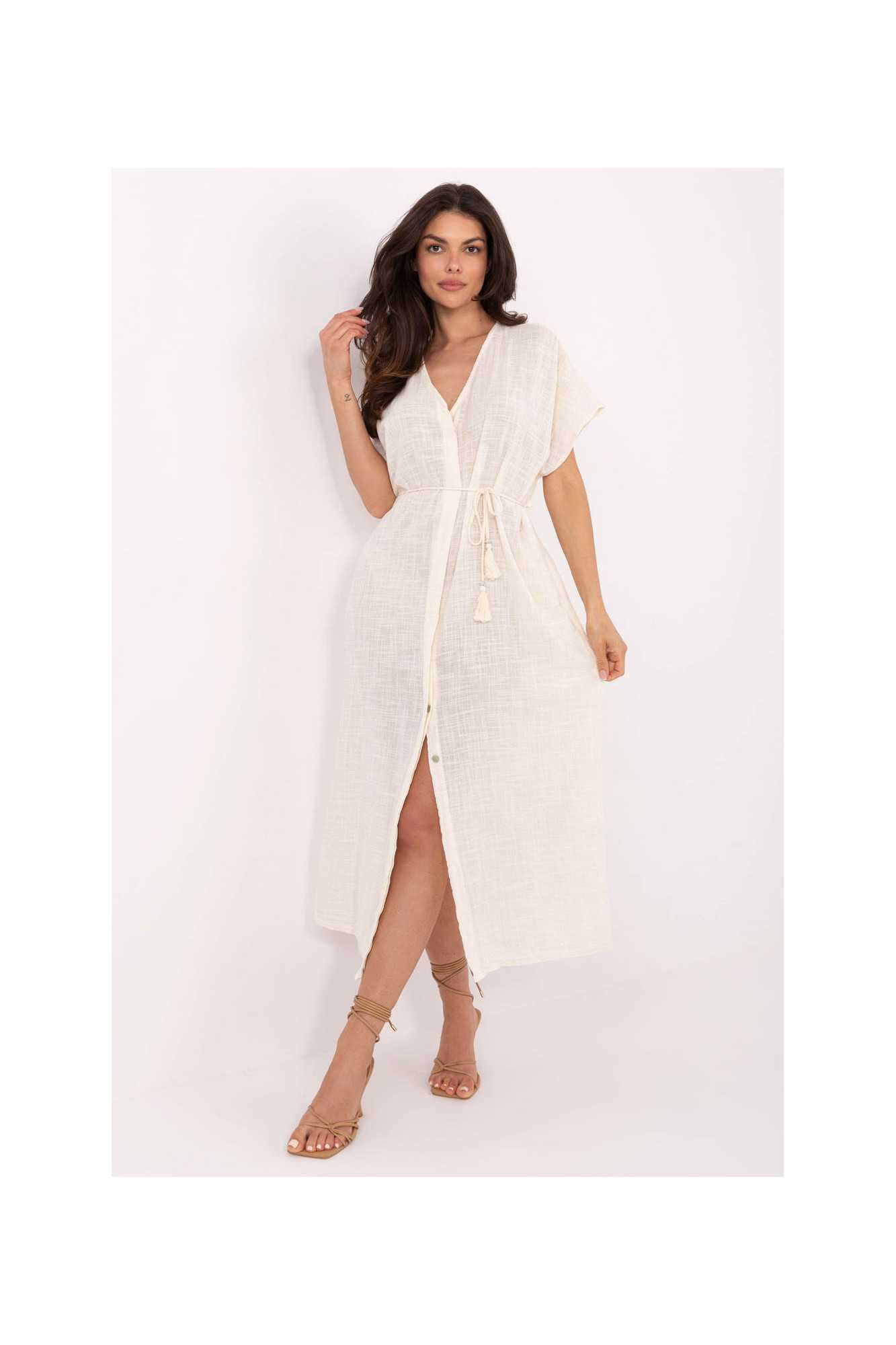 La robe chemise d'été de style boho est une proposition confortable et élégante pour tous les jours. Fabriquée en coton naturel et respirant, elle garantit un confort même par temps très chaud. La coupe oversize assure une liberté de mouvement et un ajustement décontracté, tandis que le tissu lisse confère à la robe un caractère universel. Le modèle de longueur midi avec des manches courtes et un décolleté en V est léger et féminin. La fermeture à boutons cachée sous une patte apporte une touche élégante à l'ensemble. Les poches insérées et la ceinture à franges décoratives permettent de souligner la taille et d'ajouter un caractère boho à la tenue. Parfaite pour les journées estivales, confortable, élégante et pratique.
