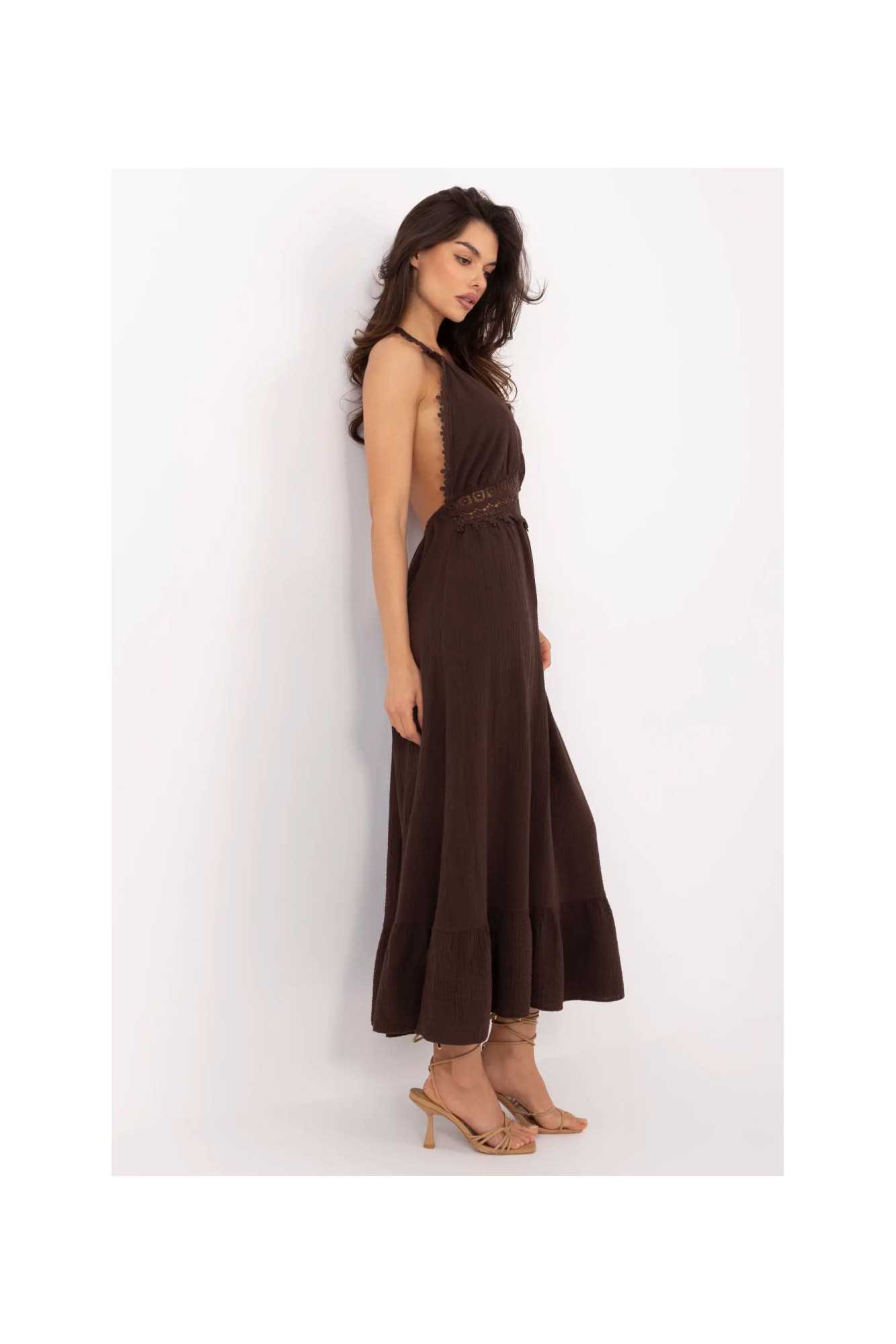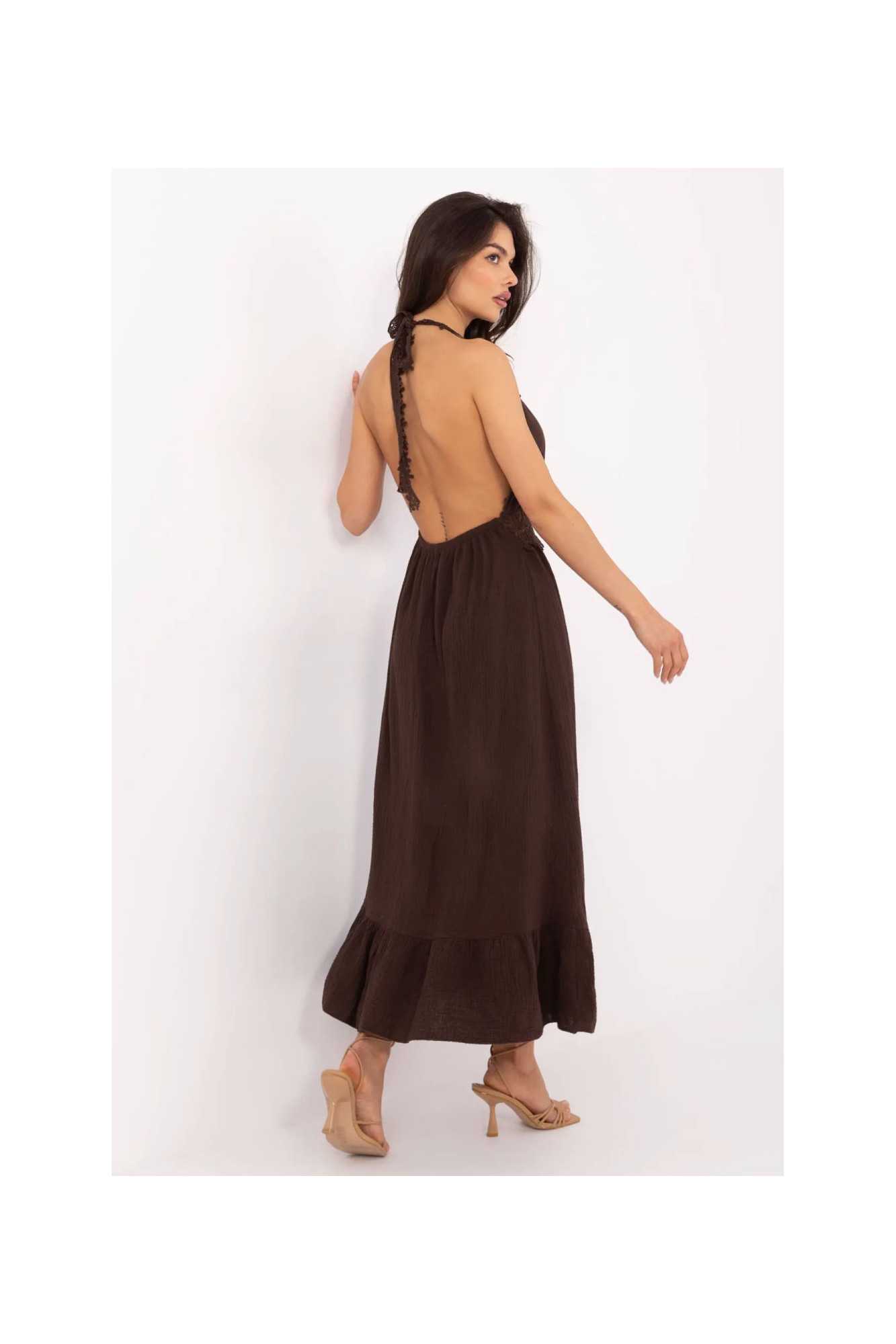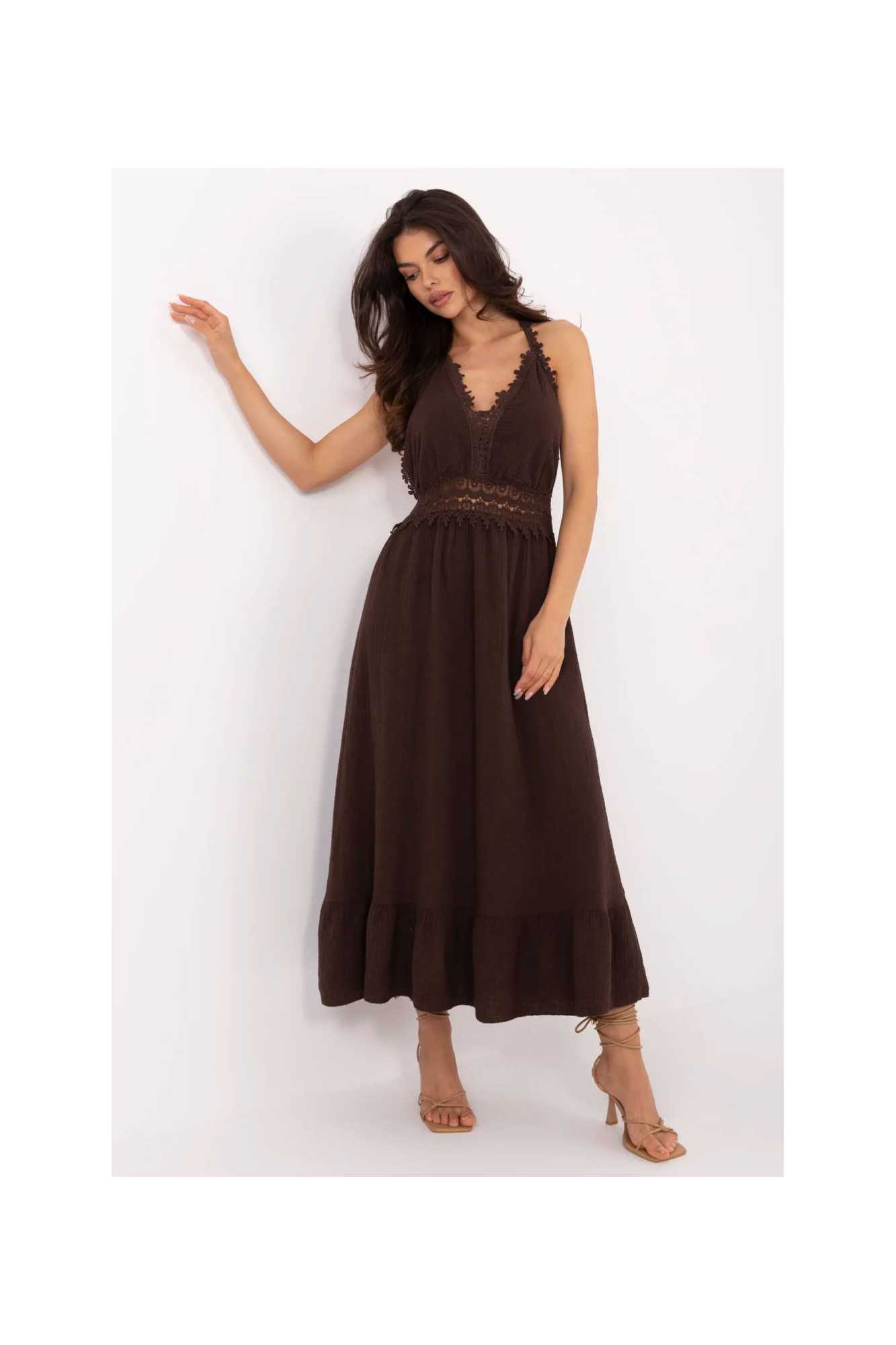 Ajoutez une touche de décontraction estivale et de charme féminin à votre garde-robe avec cette robe évasée de style bohème. Fabriquée en coton aéré avec une touche d'élasthanne, elle garantit confort et liberté de mouvement même par temps chaud. La robe midi, avec ses bretelles à nouer autour du cou, met joliment en valeur les épaules et le dos. Le décolleté en V souligne subtilement la silhouette féminine, et la dentelle décorative sur le devant ajoute un caractère romantique à l'ensemble. Le tissu lisse et la volant en bas donnent à la robe un aspect léger et aérien. C'est la proposition idéale pour les occasions estivales quotidiennes, telles que les balades, la plage ou les rencontres entre amis. Le style bohème dans sa meilleure version féminine. La longueur de la robe est indiquée dans le tableau sans le nœud. La longueur du nœud est de 72 cm.