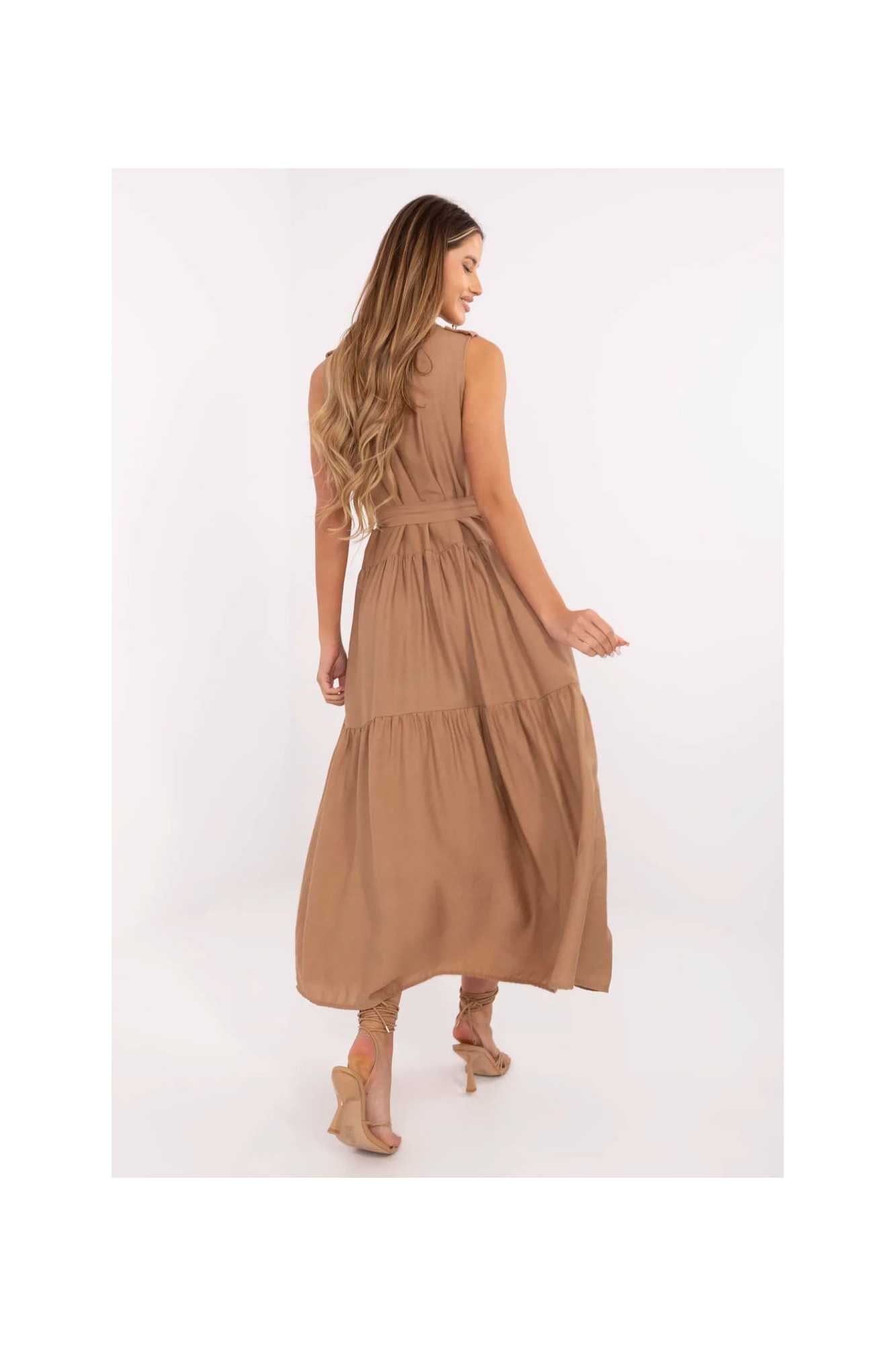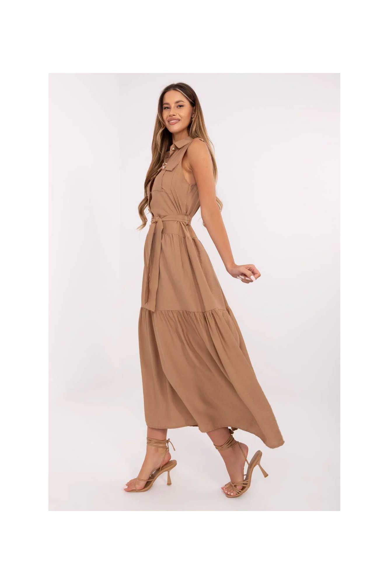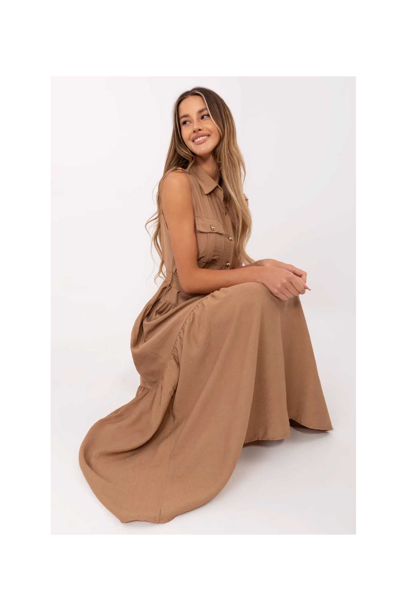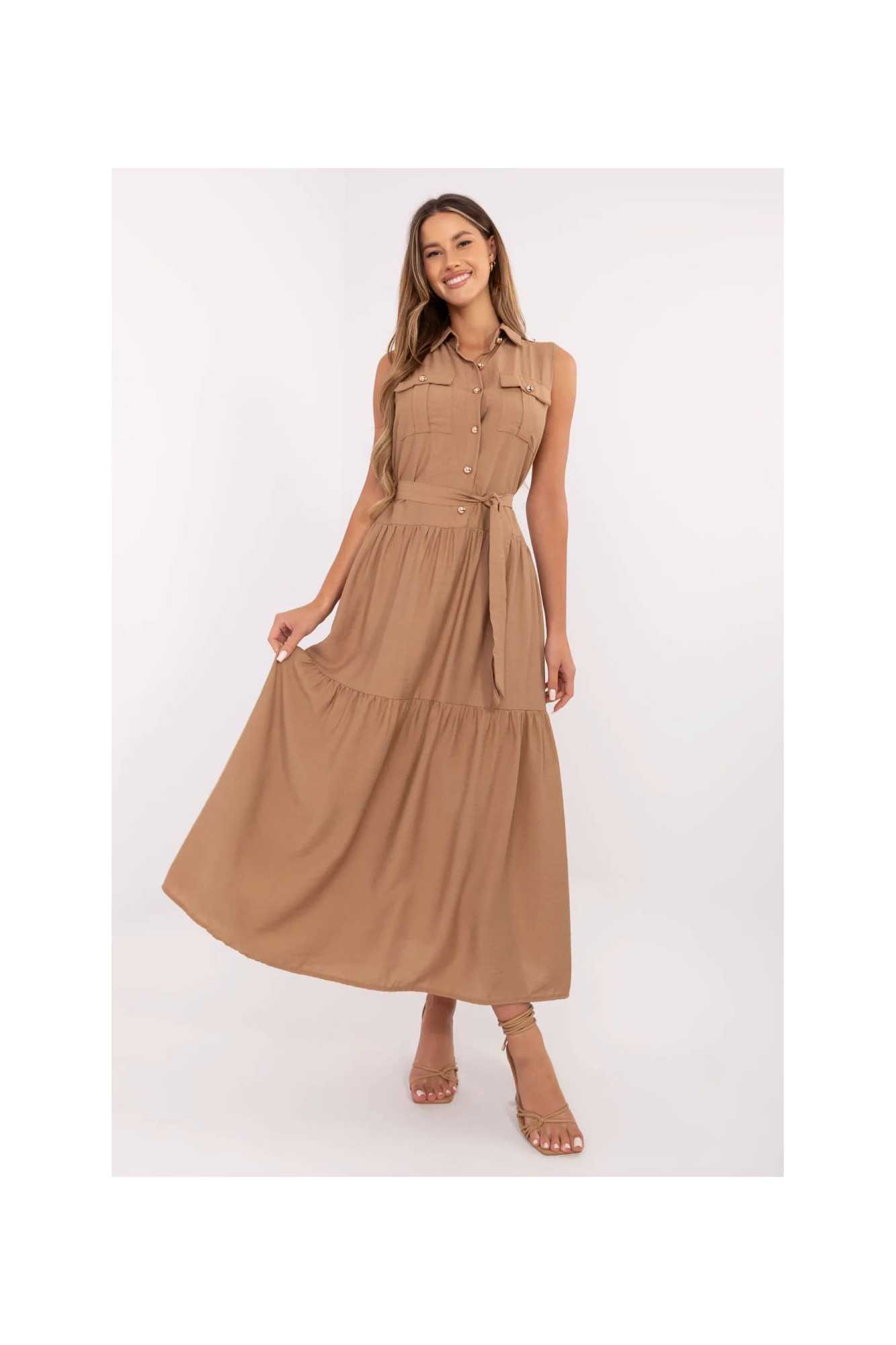Robe élégante et confortable de coupe évasée, qui allie la liberté quotidienne avec une touche d'élégance. Fabriquée dans un mélange aéré de viscose et de nylon, elle conviendra parfaitement aussi bien au travail que dans des situations quotidiennes. Modèle de longueur maxi, sans manches, avec un col classique et une fermeture boutonnée jusqu'à la taille. À la taille se trouve une ceinture à nouer, qui souligne subtilement la silhouette et permet d'ajuster la robe à la forme du corps. Les poches à rabat au niveau de la poitrine ajoutent du charme avec un accent délicat de style utility, ainsi qu'une large volant en bas, apportant légèreté et caractère féminin. Grâce à son motif lisse, la robe est une base polyvalente pour de nombreuses tenues, elle se marie parfaitement aussi bien avec des sandales qu'avec des ballerines classiques ou des espadrilles.
