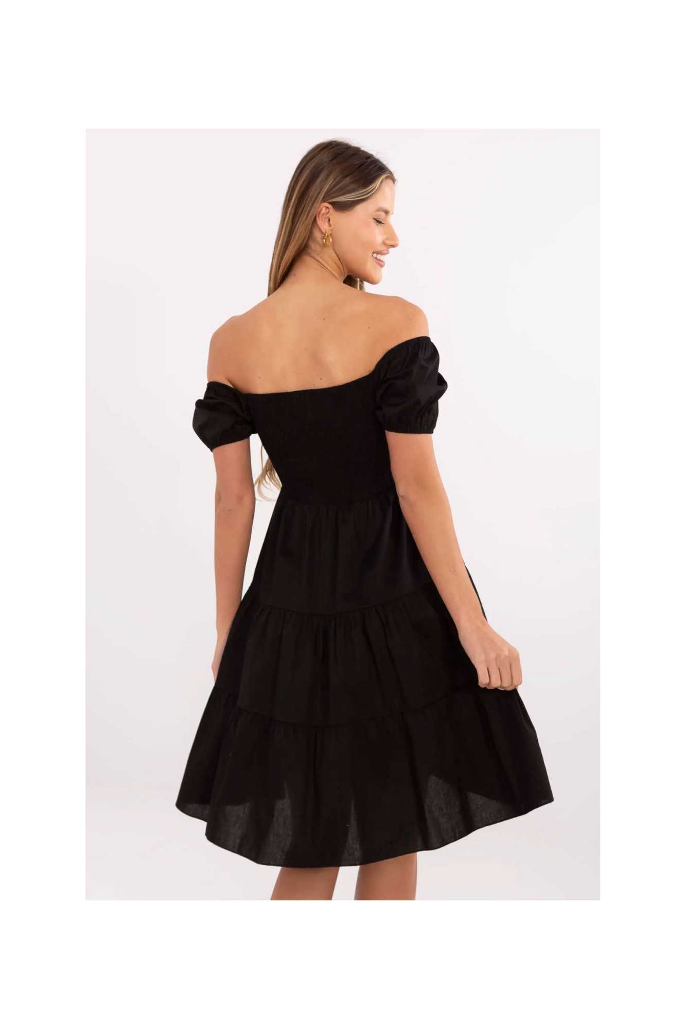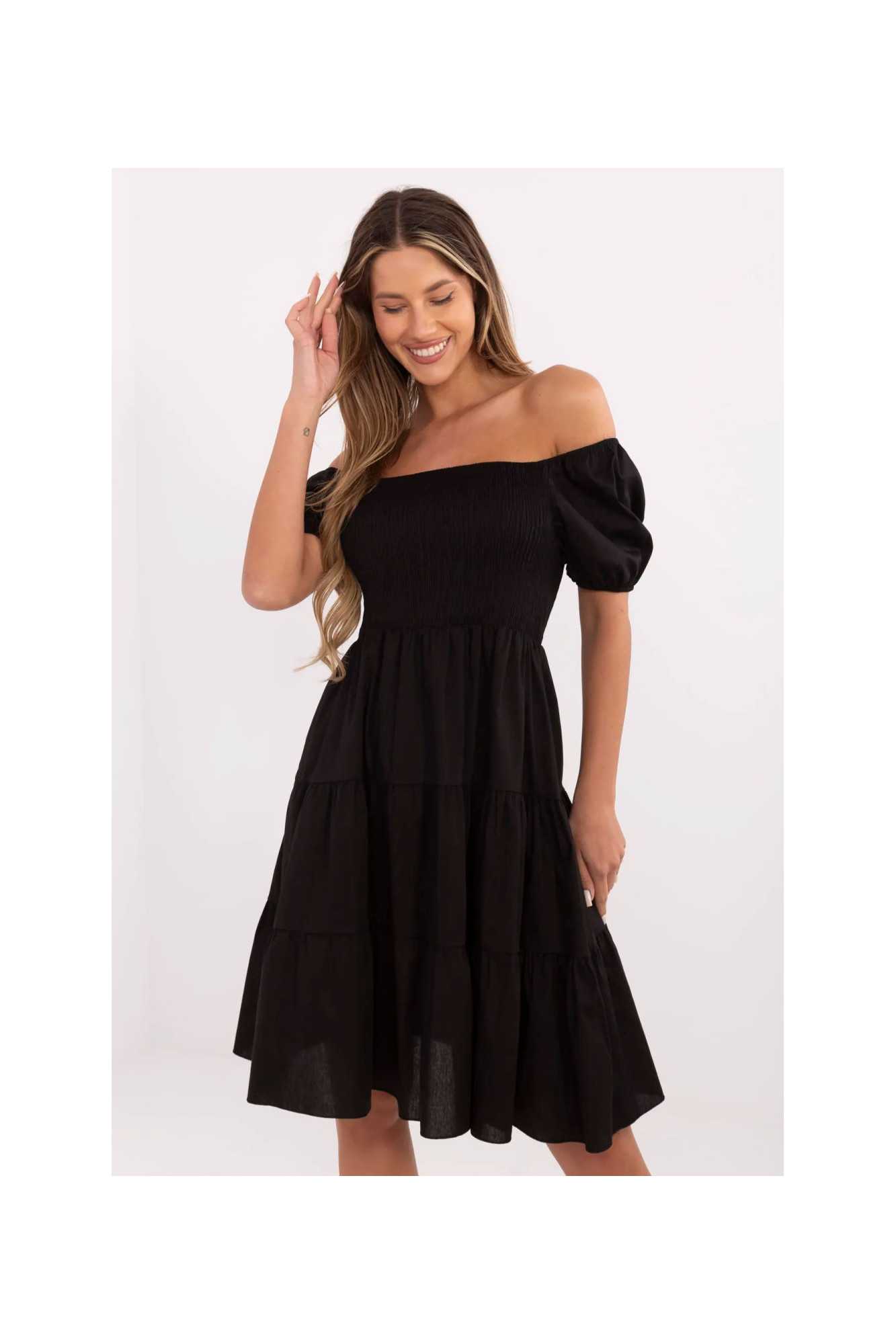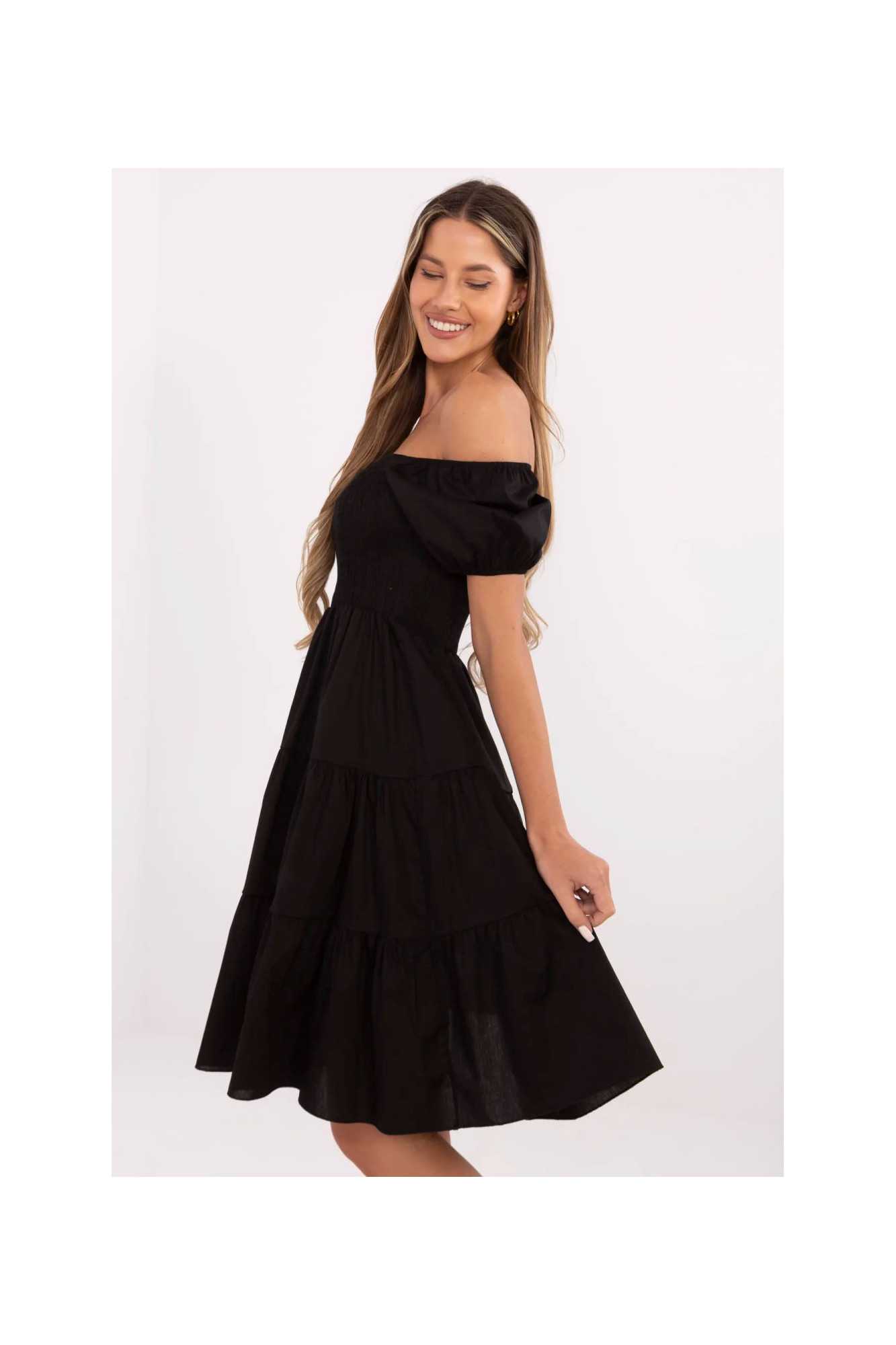 La robe d'été évasée est une proposition idéale pour les tenues quotidiennes pendant les journées chaudes. Fabriquée dans un tissu doux et aéré en coton avec de l'élasthanne, elle offre confort et liberté de mouvement toute la journée. Le modèle arrive au-dessus du genou et ses éléments caractéristiques sont l'encolure rectangulaire et la manche bouffante courte, qui ajoute un charme romantique à l'ensemble. La partie supérieure de la robe est ornée de plis qui mettent en valeur la poitrine et donnent de la légèreté à la tenue. Un volant au bas de la robe est une décoration supplémentaire qui ondule joliment en mouvement. L'absence de fermeture rend le modèle facile à enfiler et très confortable à porter au quotidien. Le tissu lisse et la coupe féminine font de cette robe un choix parfait pour une promenade, des achats ou des rencontres entre amis.