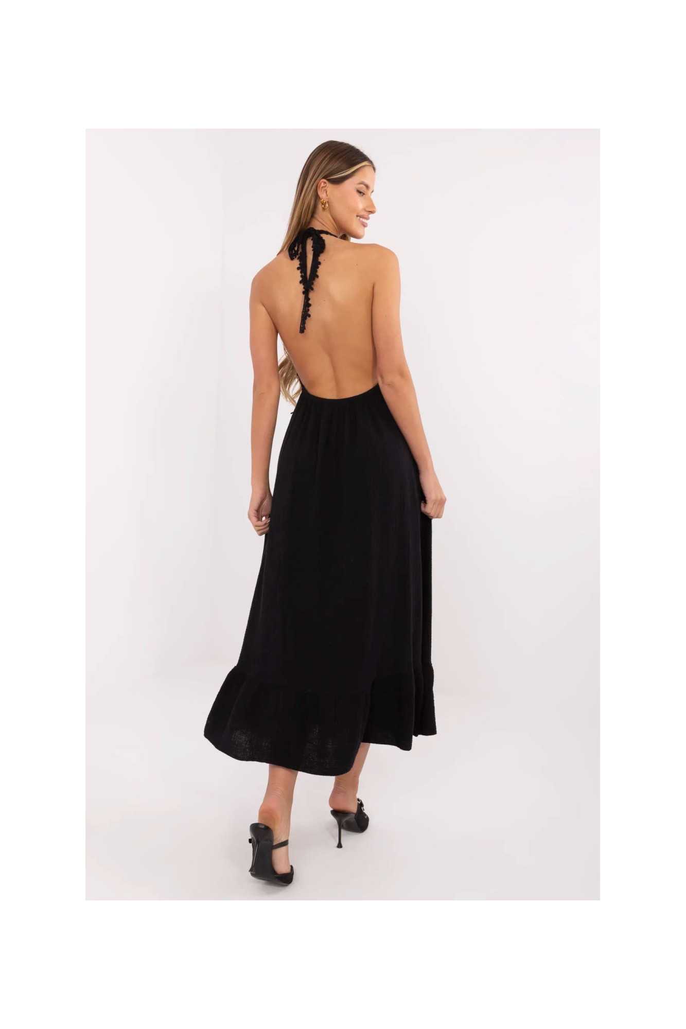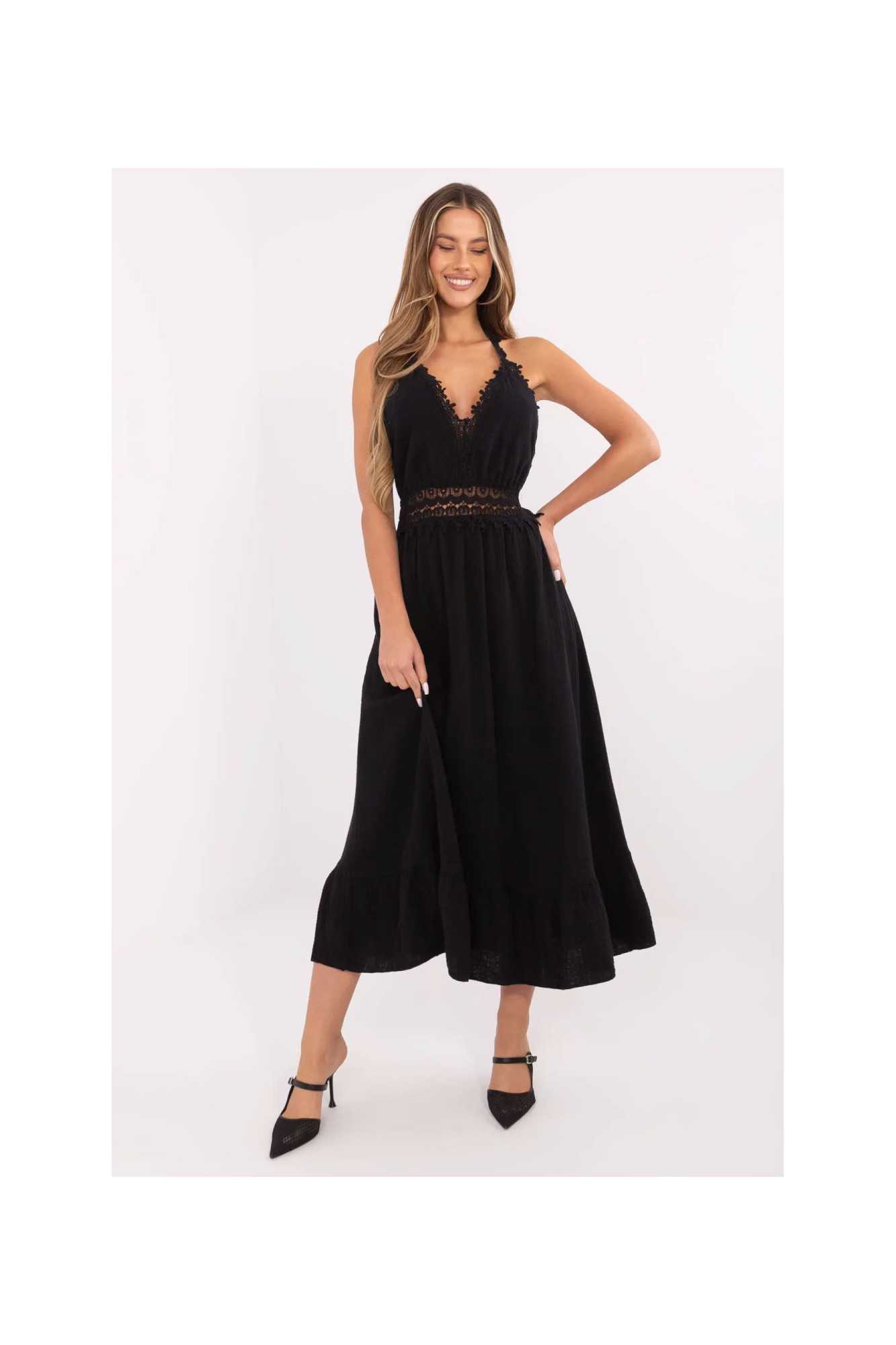 Ajoutez une touche de décontraction estivale et de charme féminin à votre garde-robe avec cette robe évasée de style bohème. Fabriquée en coton aéré avec une touche d'élasthanne, elle garantit confort et liberté de mouvement même par temps chaud. La robe de longueur midi, avec des bretelles nouées autour du cou, met joliment en valeur les épaules et le dos. Le décolleté en forme de cœur souligne subtilement la silhouette féminine, et la dentelle décorative à l'avant ajoute une touche romantique à l'ensemble. Le tissu lisse et la volant en bas donnent à la robe un aspect léger et aérien. C'est une proposition idéale pour les occasions estivales quotidiennes telles que les promenades, la plage ou les rencontres entre amis. Un style bohème au féminin. La longueur de la robe est donnée dans le tableau sans les liens. La longueur des liens est de 72 cm.