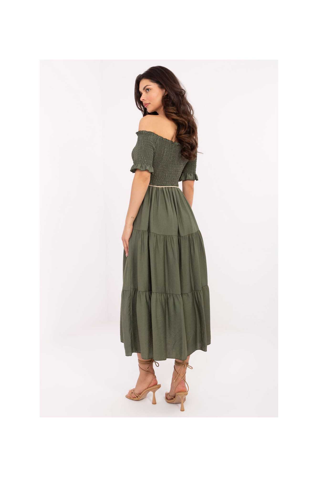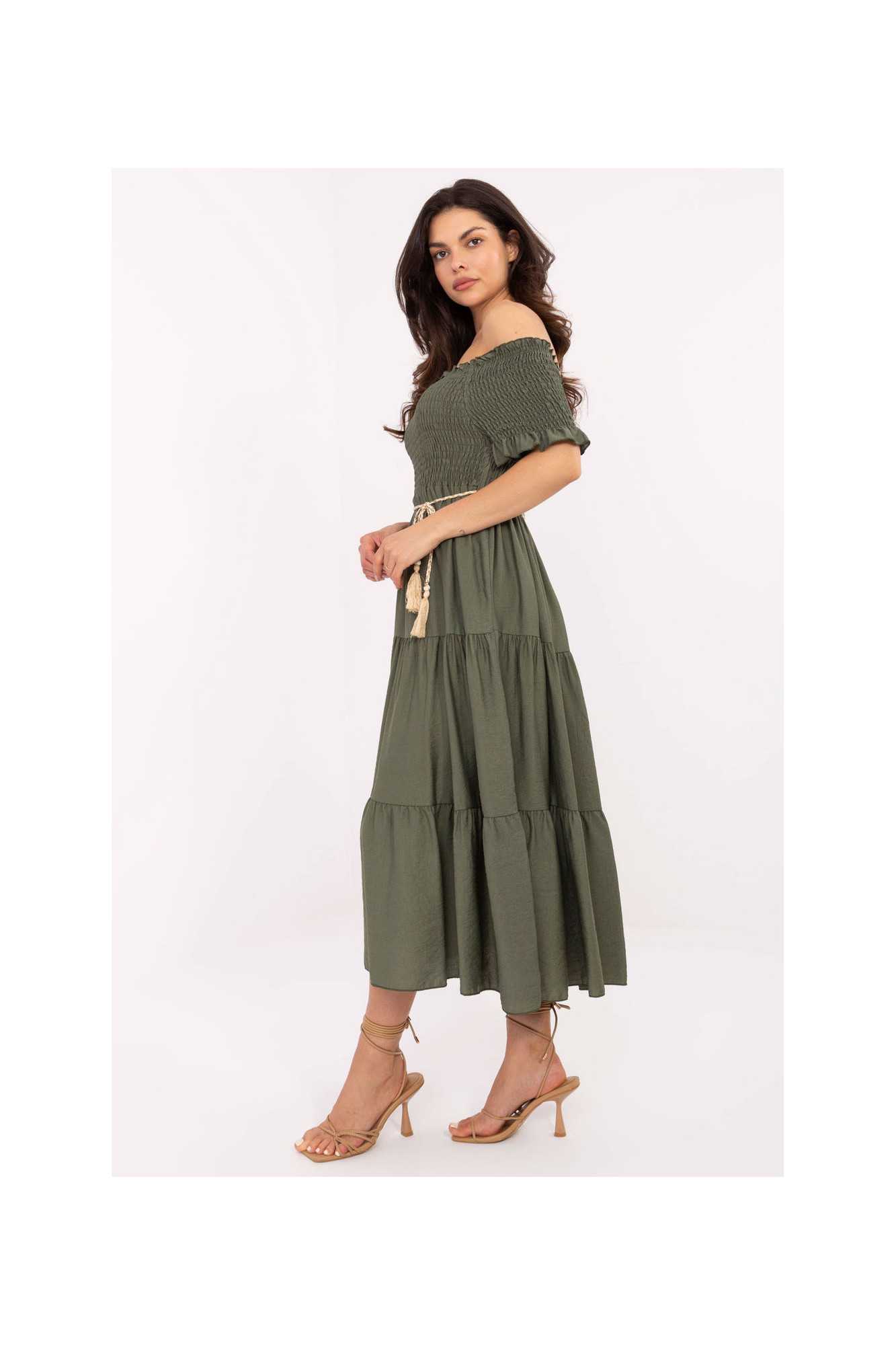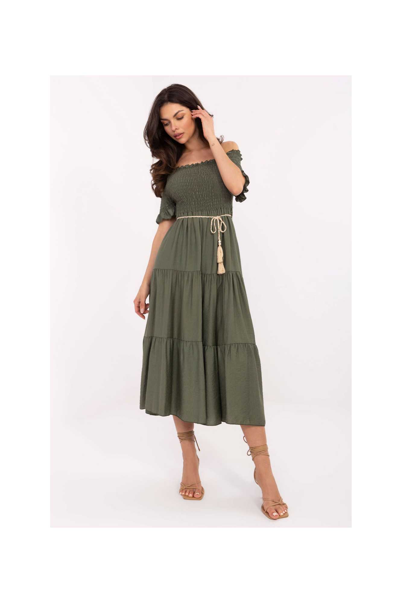 La robe d'été midi à la coupe évasée est un choix parfait à la fois pour tous les jours et pour des occasions spéciales. Fabriquée à partir d'un mélange léger et aéré de viscose et de nylon, elle assure un grand confort les jours chauds. Le tissu lisse met en valeur le caractère élégant et subtil de la robe. Le haut est orné d'un décolleté de type espagnol avec des plis et des élastiques, mettant joliment en valeur les épaules et donnant à la tenue une touche de féminité. Les manches courtes ornées de volants ajoutent de la légèreté et un charme romantique. Le modèle n'a pas de fermeture, il s'enfile par la tête. À la taille, il y a une ceinture à nouer qui permet de souligner la silhouette et d'ajuster la robe à la forme du corps. Parfaite pour les promenades, les fêtes d'été ou les rencontres en famille.