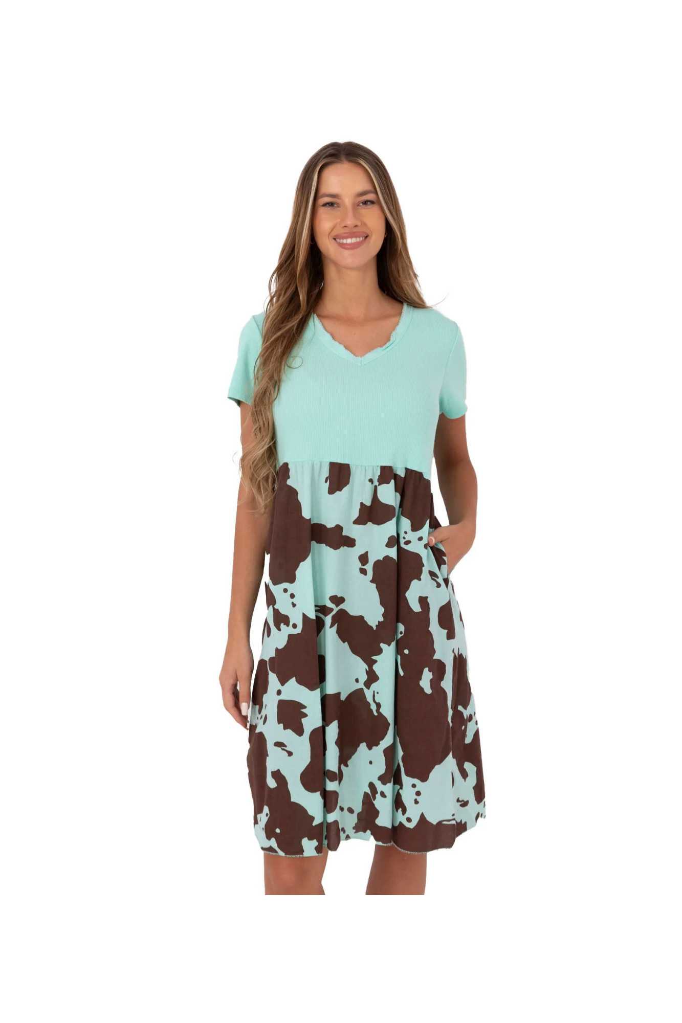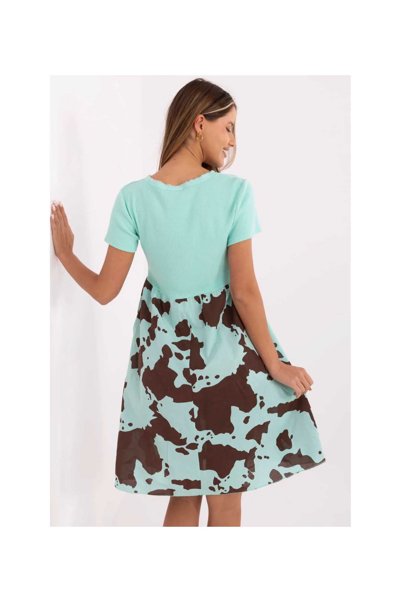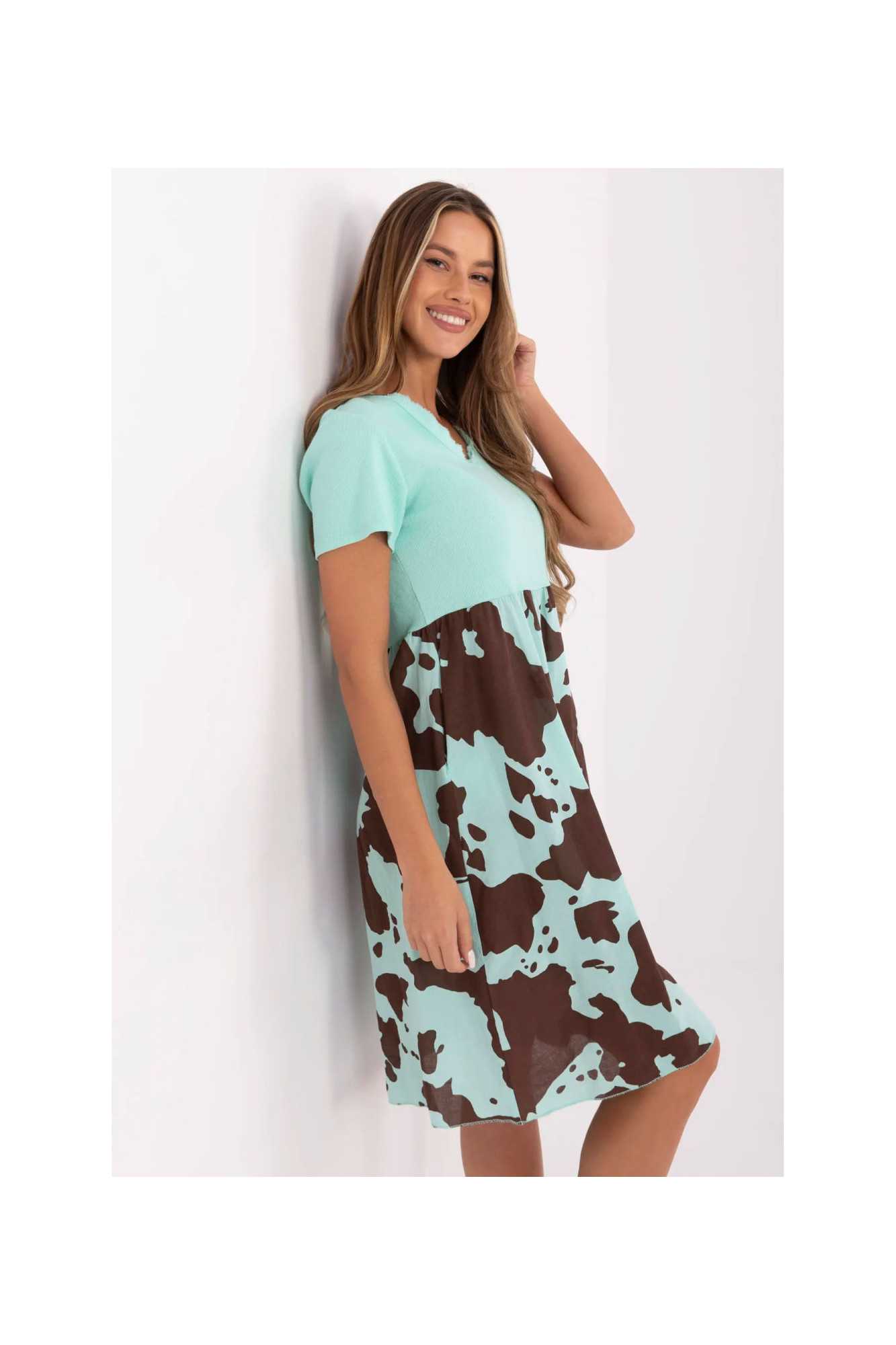 Cette robe d'été évasée est un mélange de confort, de style et de design original. Fabriquée dans un mélange aéré de coton et d'élasthanne, elle conviendra parfaitement au quotidien, que ce soit en ville ou pendant les vacances d'été. Le haut de la robe est confectionné dans un tissu côtelé qui s'ajuste subtilement à la silhouette, mettant en valeur ses atouts. Le décolleté en V et les manches courtes apportent légèreté et charme féminin à l'ensemble. Le bas de la robe est orné d'un motif animalier original, ajoutant du caractère et brisant le côté classique et lisse du haut. Ce modèle au-dessus du genou est non seulement élégant, mais aussi fonctionnel, avec des poches pratiques dissimulées dans les coutures latérales, augmentant le confort de port. Cette robe est idéale pour les sorties quotidiennes, alliant simplicité avec une touche sauvage, offrant une proposition exceptionnelle pour les femmes appréciant le confort et un look à la mode.