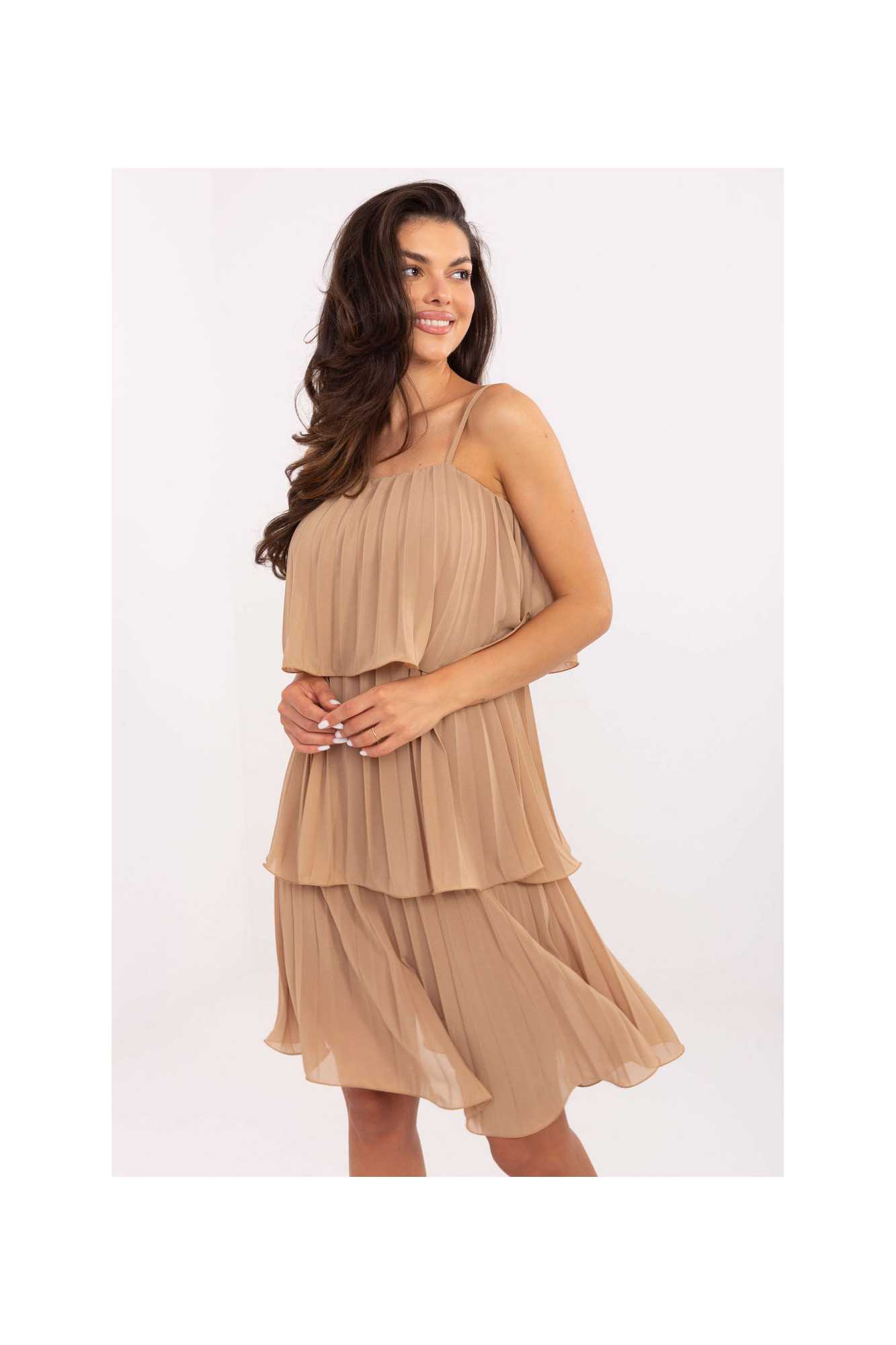 Robe élégante et stylée au genou créée pour des occasions spéciales. Fabriquée à partir d'un matériau lisse en polyester et viscose, elle tombe magnifiquement et assure un confort de port. La robe est doublée délicatement, ce qui lui donne de la classe et la rend très esthétique. Le modèle avec fines bretelles et un décolleté rectangulaire met subtilement en valeur les épaules et le décolleté. Les volants placés sur la robe lui donnent de la légèreté, un caractère moderne et un charme féminin. La coupe originale attire les regards, faisant de cette robe un excellent choix pour les fêtes, les cérémonies ou les sorties du soir. Cette combinaison d'élégance et de fraîcheur dans une seule tenue est parfaite pour les femmes qui aiment se démarquer avec classe.