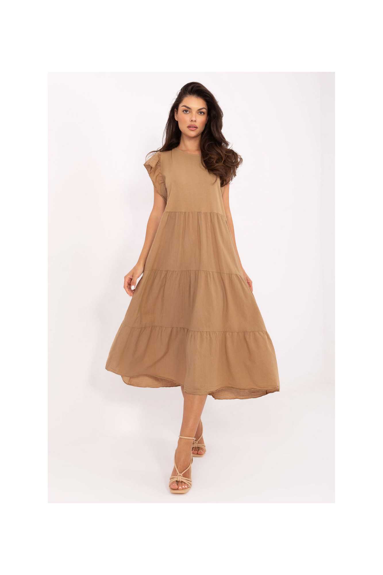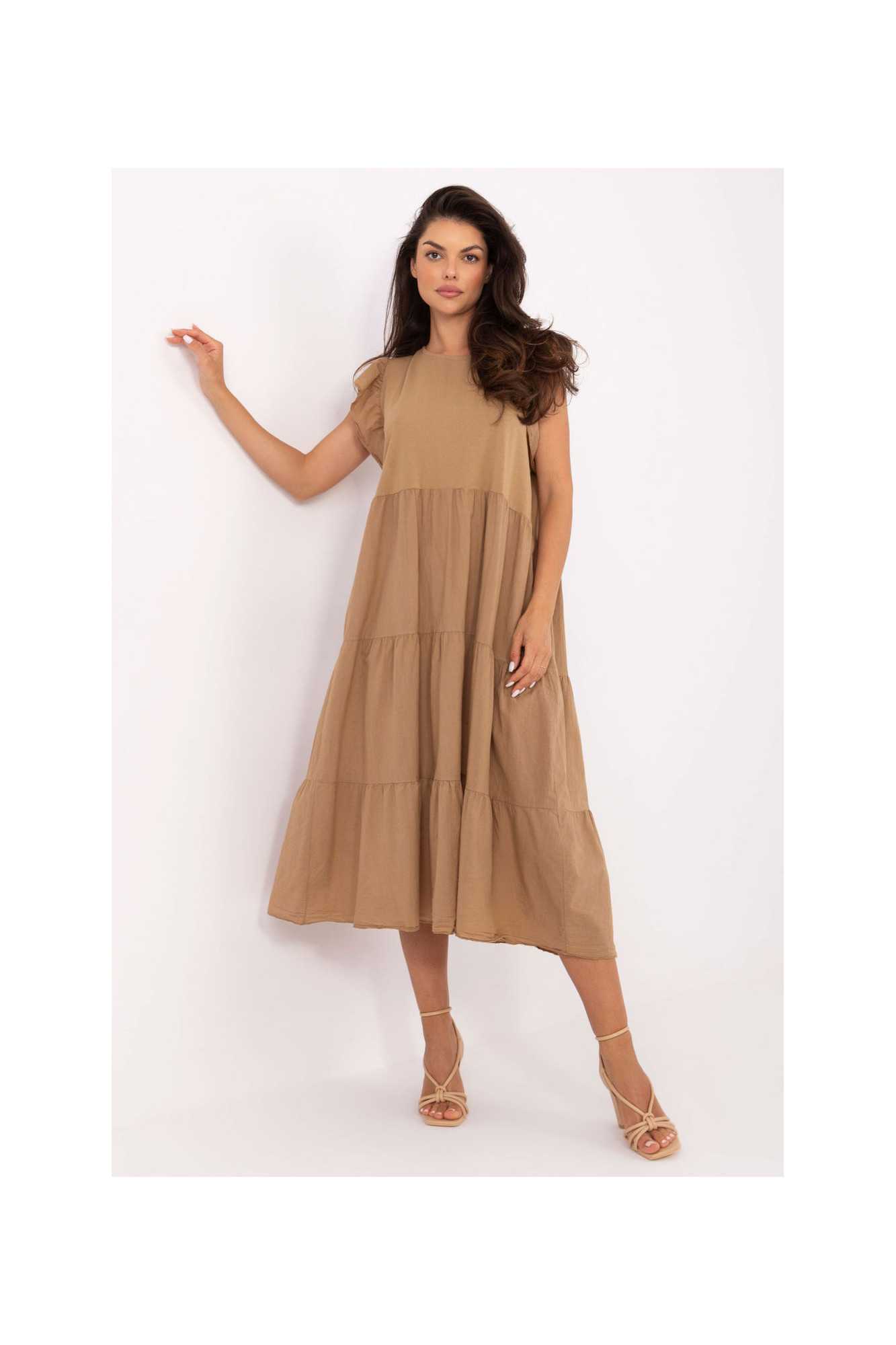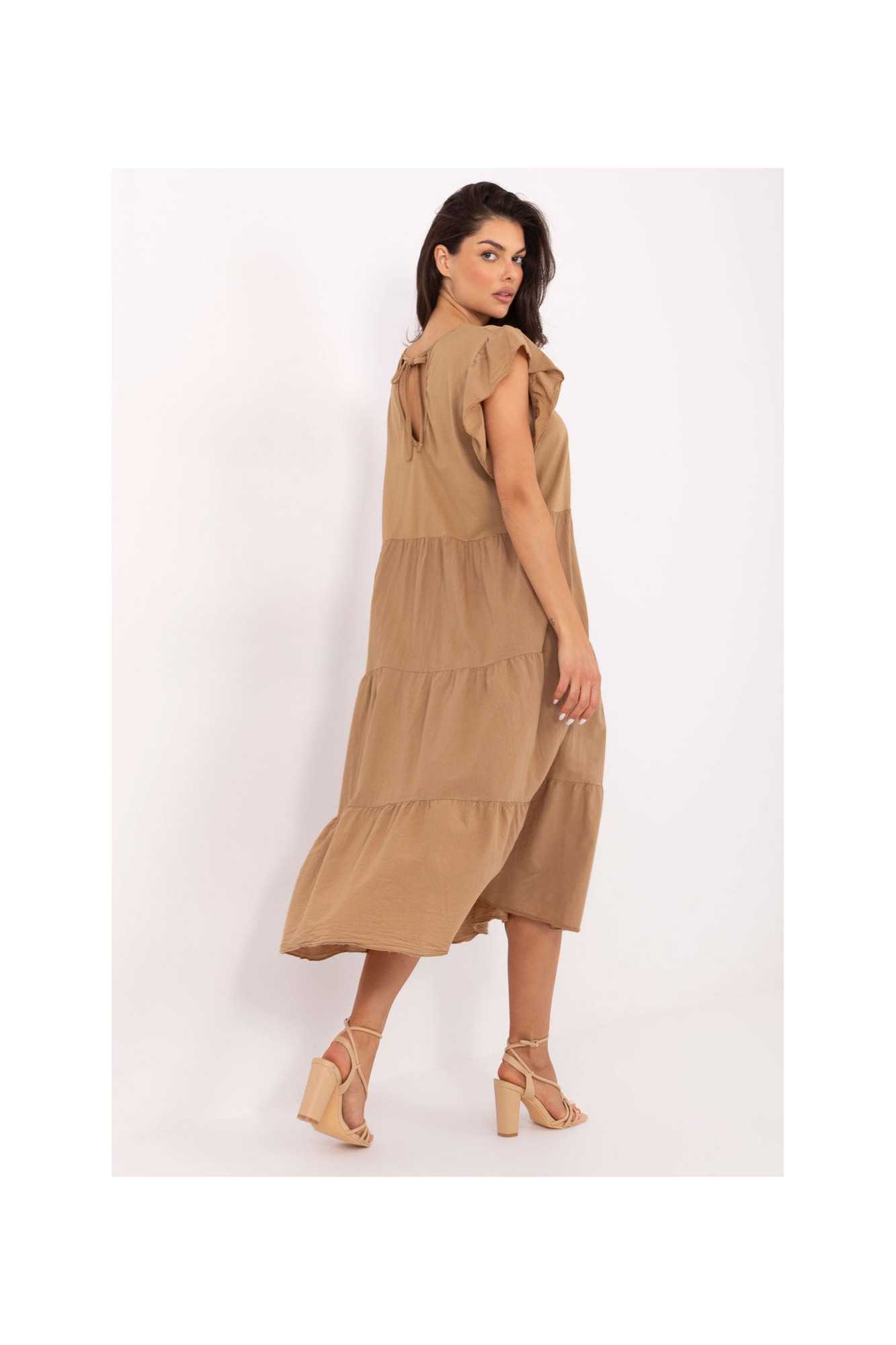 Confortable et élégante, cette robe oversize en coton est une proposition idéale pour les tenues estivales quotidiennes. Fabriquée en tissu naturel et respirant, elle offre une grande liberté de mouvement et un confort toute la journée. Modèle midi en matière lisse, avec un col rond et des manches courtes ornées d'une délicate volant, ajoutant une touche féminine. Le dos de la robe est orné d'un subtil laçage, lui donnant un caractère légèrement romantique. Parfaite pour une journée de travail, faire des courses, se promener ou rencontrer des amis. Élégante dans sa simplicité, elle sera une excellente base pour de nombreux looks estivaux.