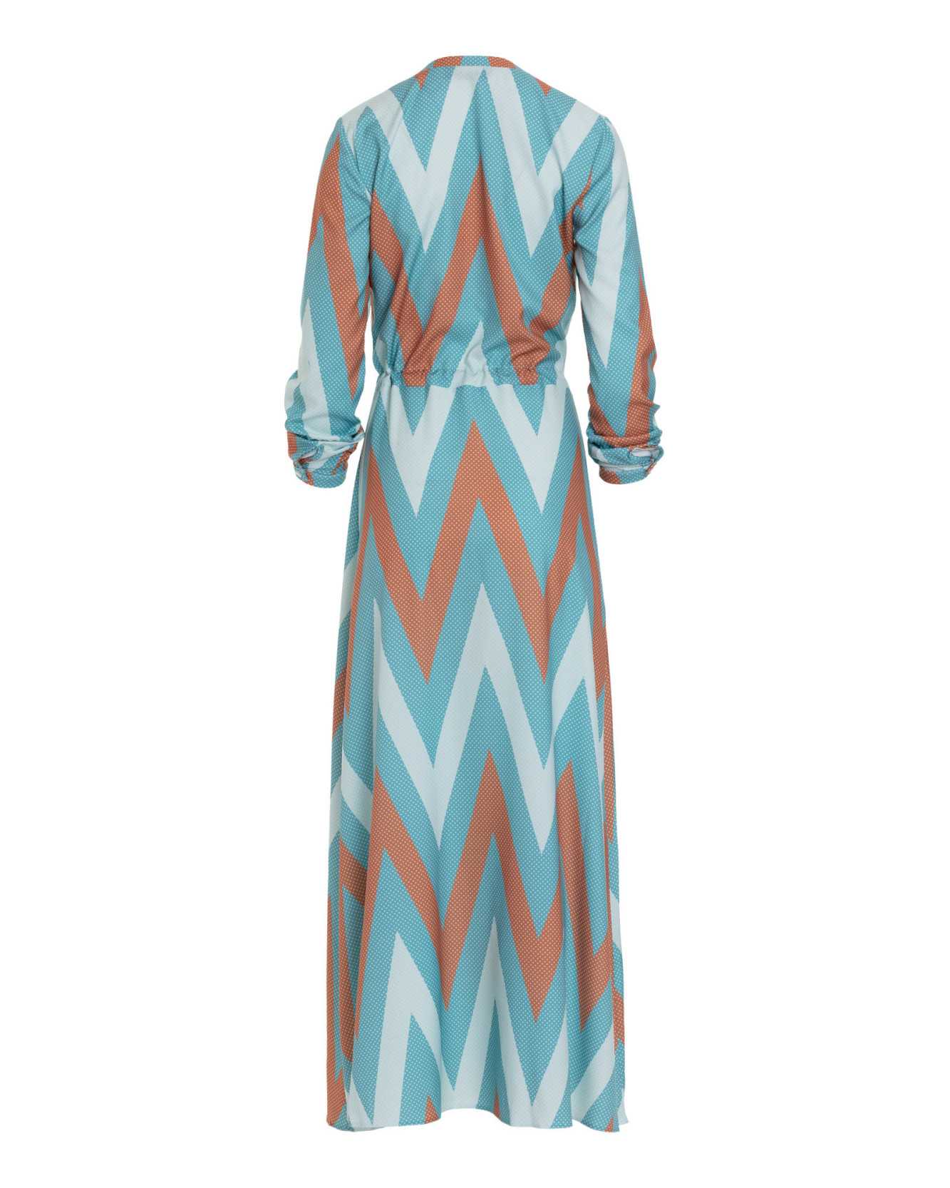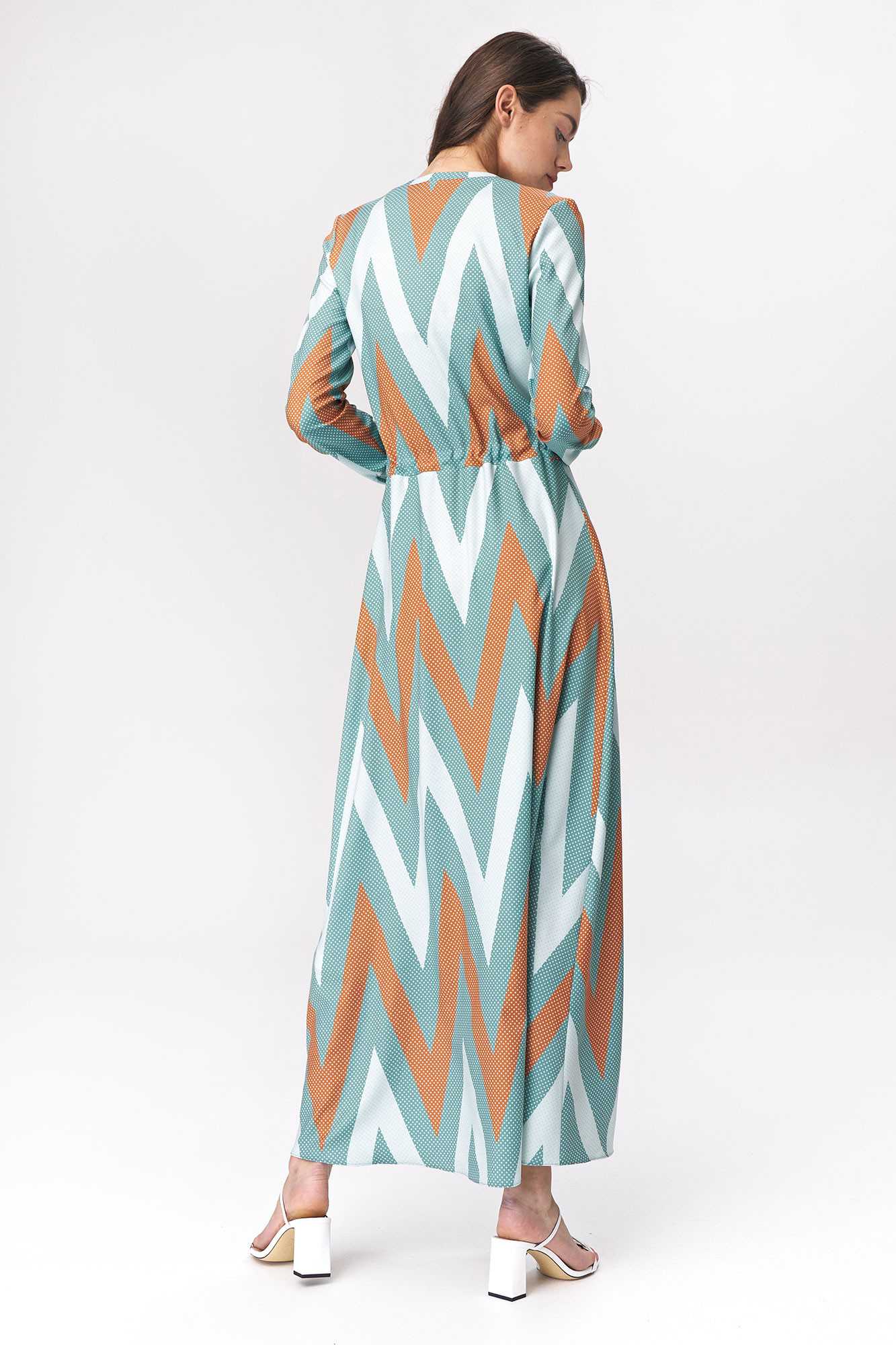 Cette robe longue turquoise à imprimé zigzag tendance est idéale pour les adeptes des styles féminin, romantique et bohème. Portée avec des talons et une veste, elle offre une alternative originale et décontractée aux tenues de bureau classiques. Composition : 97 % polyester, 3 % élasthanne. Le mannequin mesure 1,76 m et porte une taille 36.