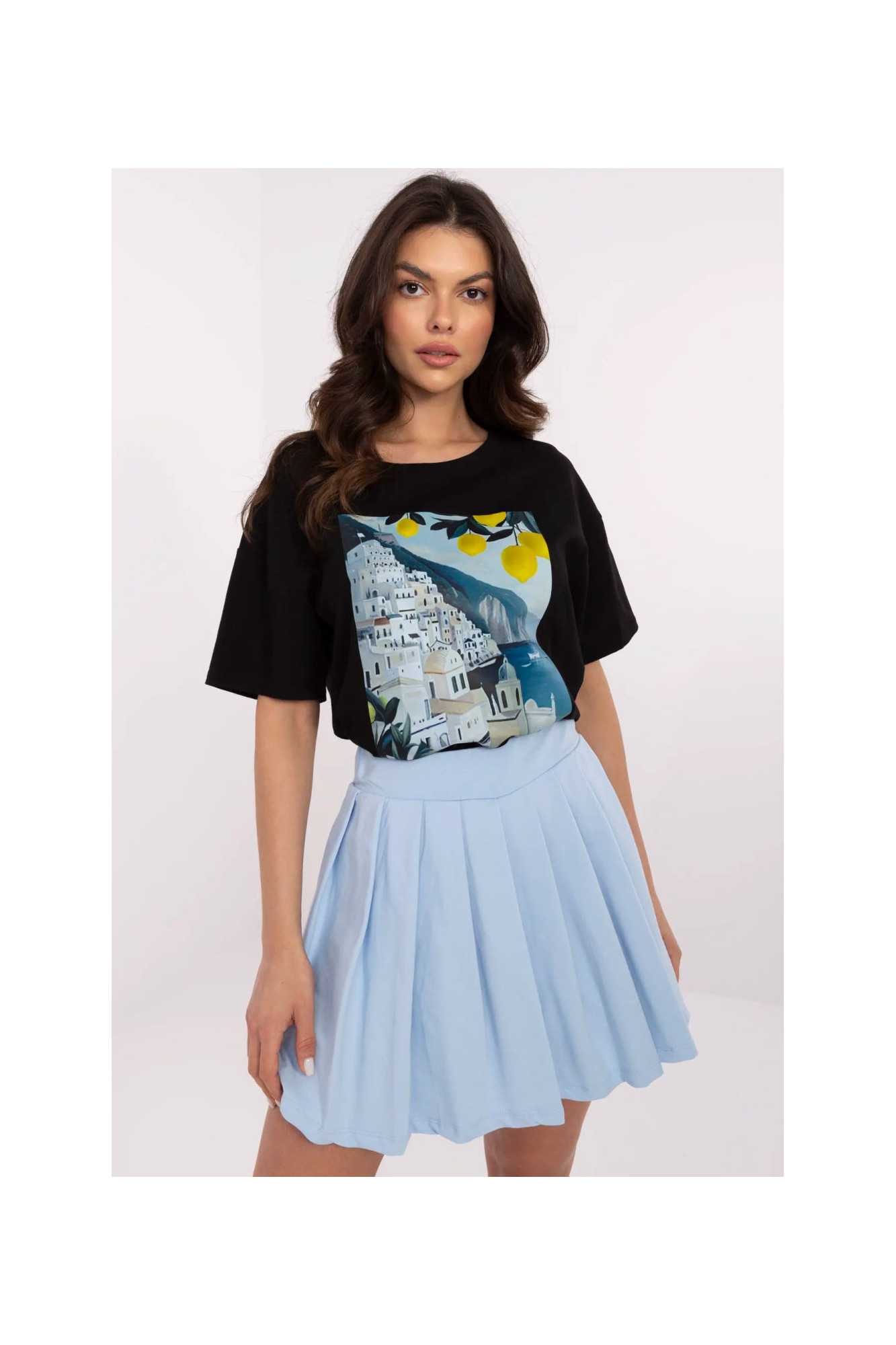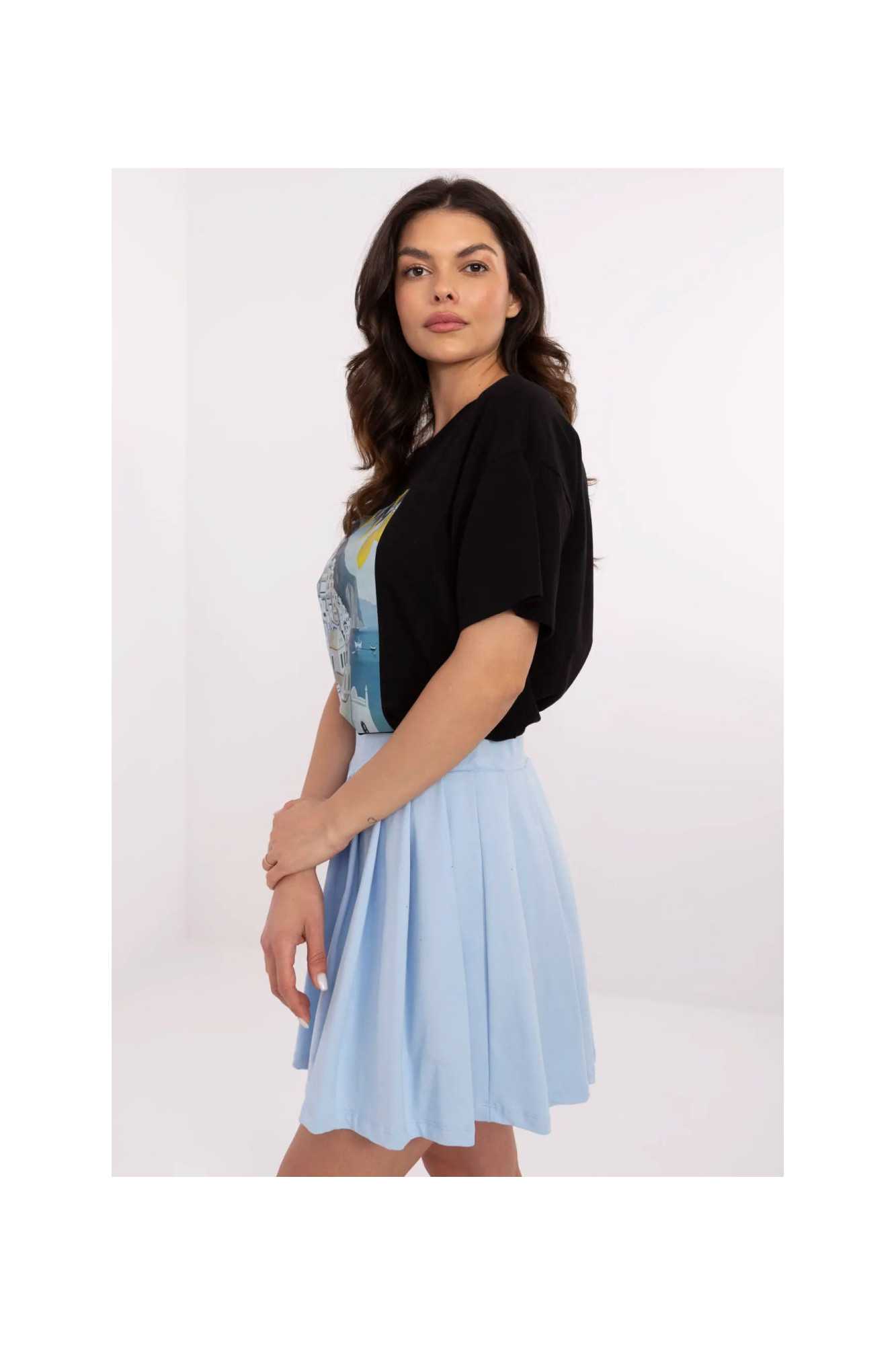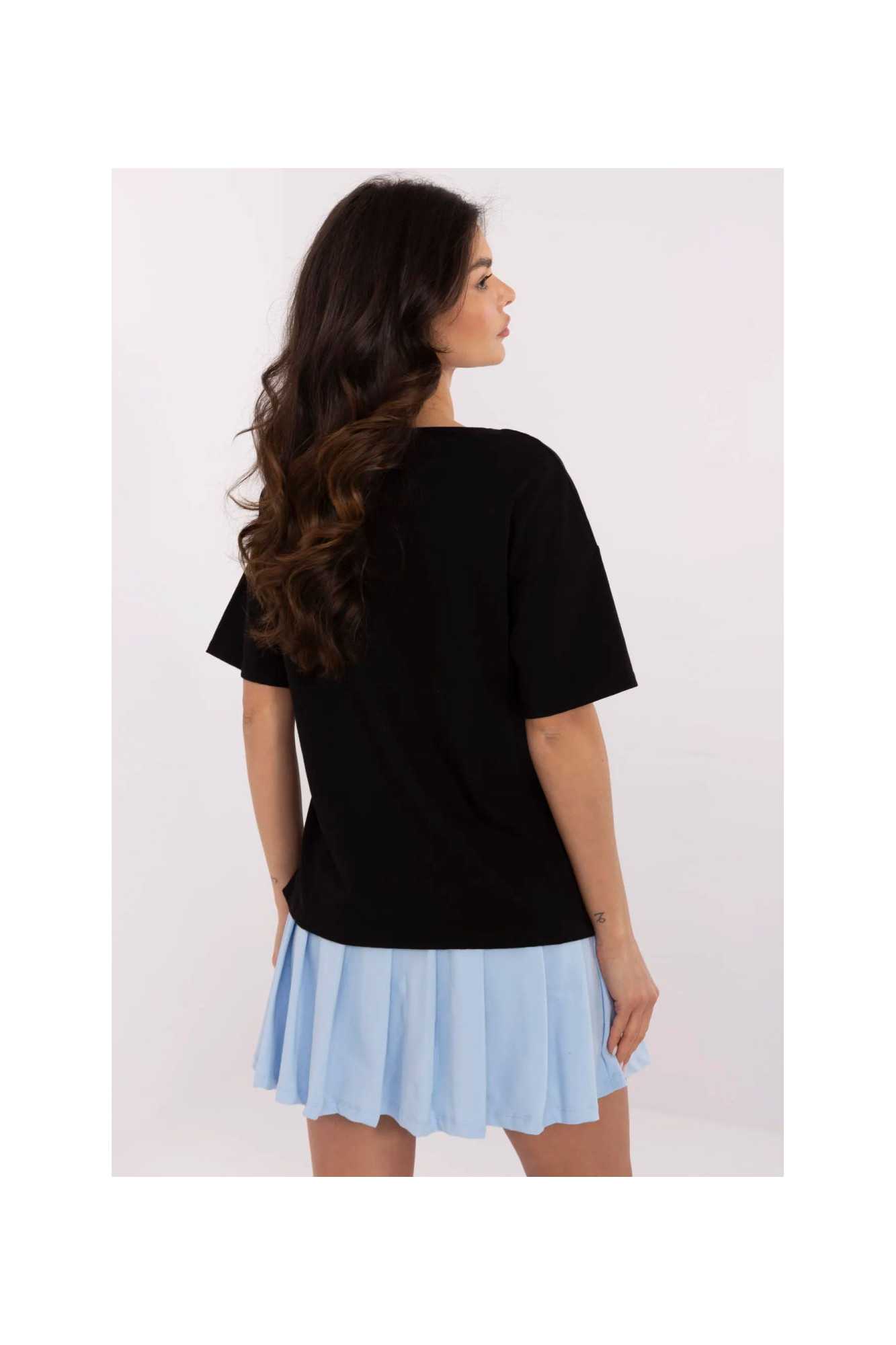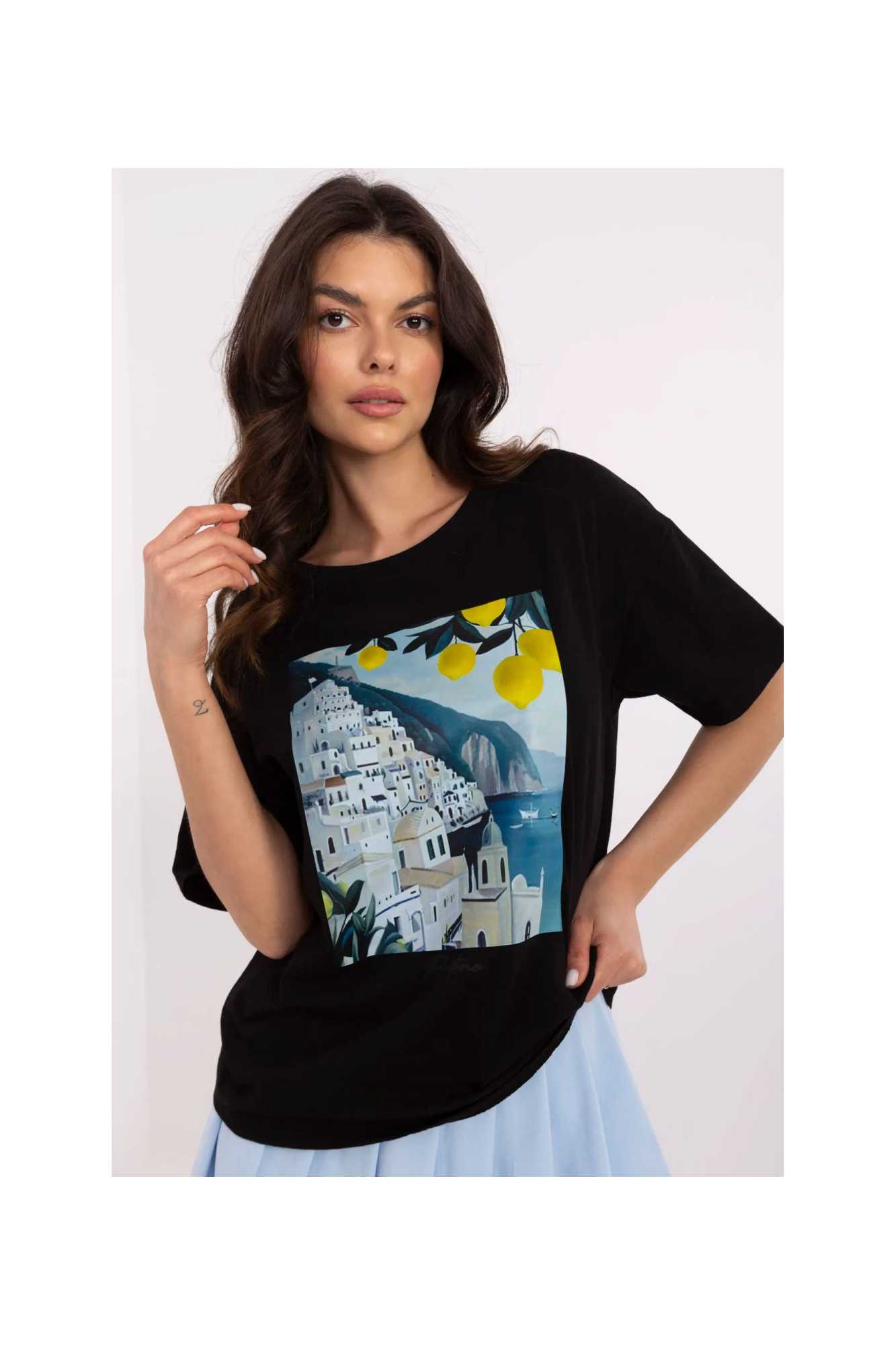 Ce t-shirt décontracté est le choix idéal pour les femmes qui apprécient le confort et un look à la mode. Fabriqué en coton de haute qualité avec une touche d'élasthanne, il offre douceur, respirabilité et confort toute la journée. Sa longueur standard et son encolure ronde classique font que le t-shirt s'adapte parfaitement à la silhouette, et sa manche courte lui donne de la légèreté. L'impression originale est le principal élément décoratif qui donne à l'ensemble un caractère frais. Parfait pour les tenues quotidiennes, il se marie aussi bien avec un jean qu'avec un pantalon de survêtement ou une jupe. Ce t-shirt est un incontournable dans la garde-robe de toute amatrice de mode confortable et stylée!